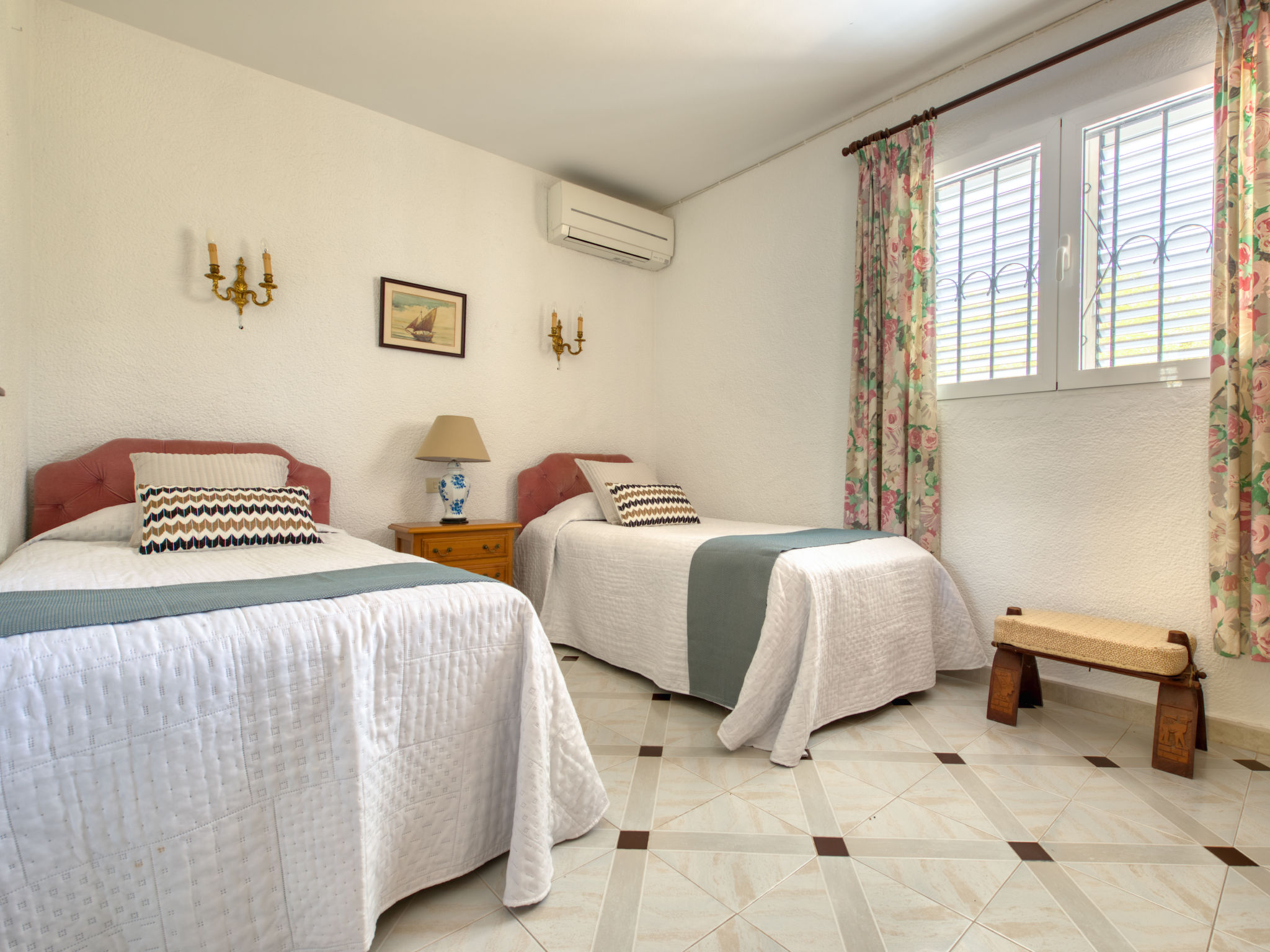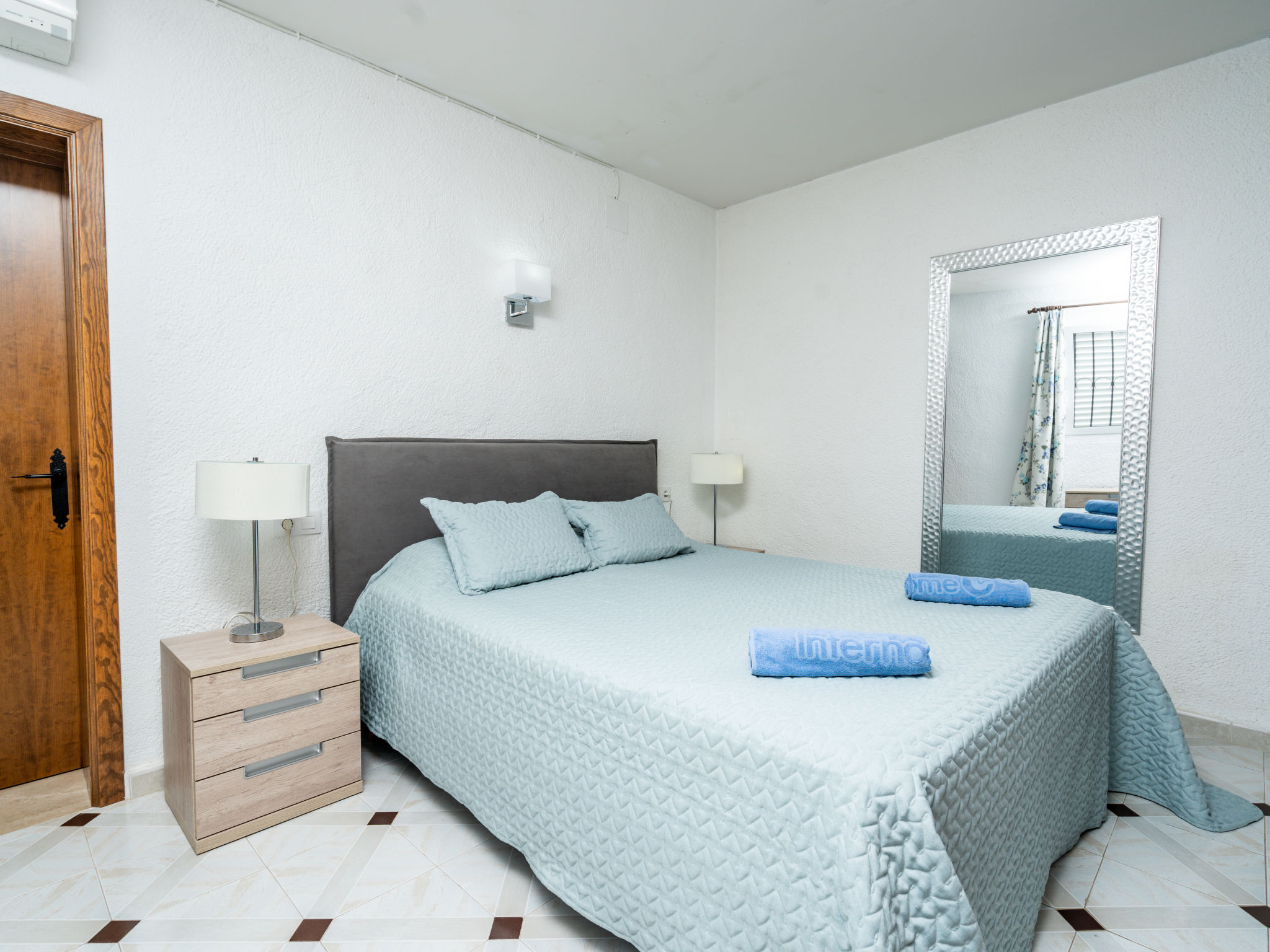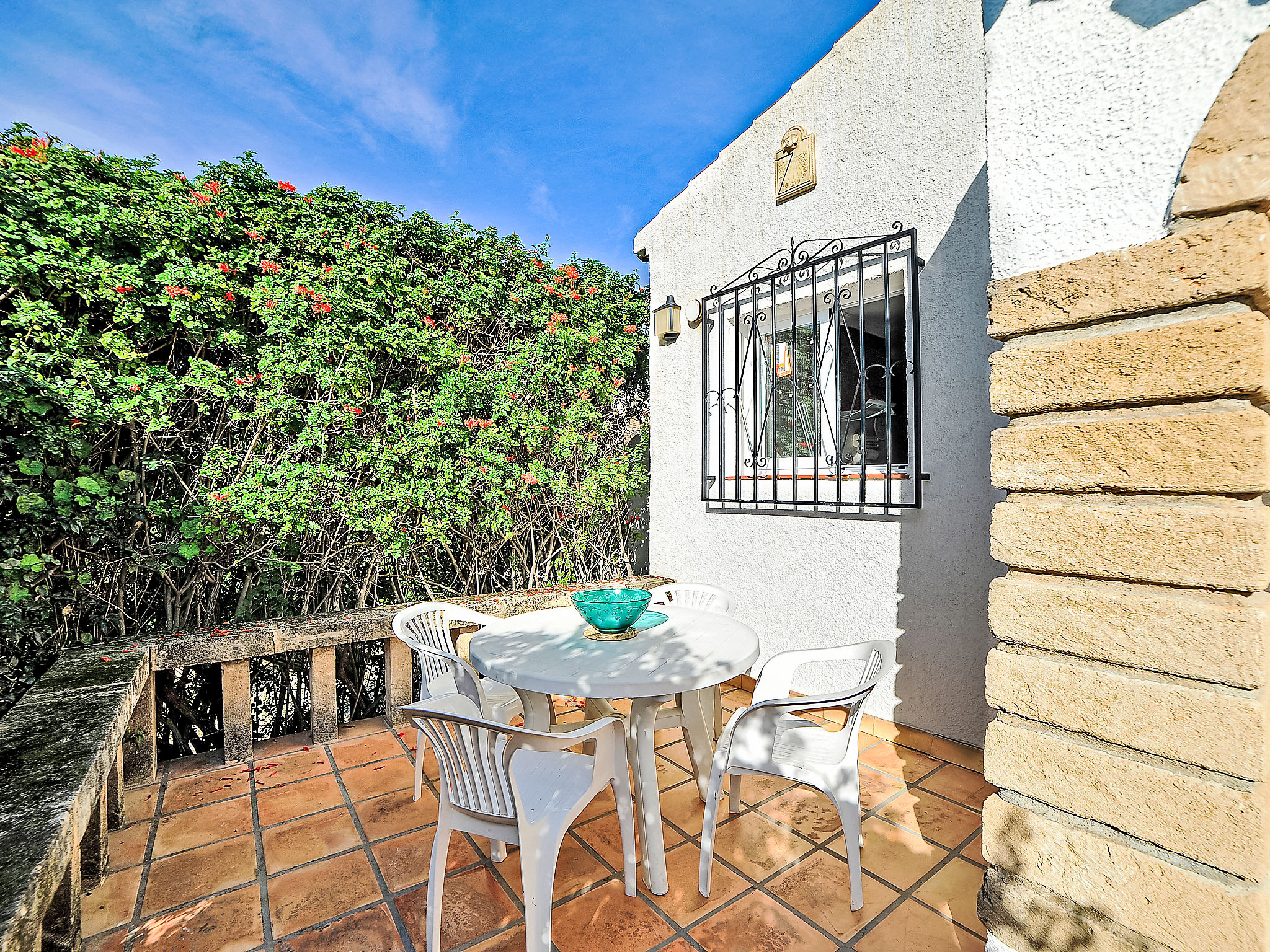 3-Zimmer-Haus 85 m2. Zweckmässig und komfortabel eingerichtet: Wohn-/Esszimmer mit Sat-TV und Digital-TV. Ausgang zur Terrasse. 1 Zimmer mit 1 franz. Bett (160 cm, Länge 200 cm), Dusche/WC und Klimaanlage. 1 Zimmer mit 2 Betten (90 cm, Länge 190 cm), Klimaanlage. Küche (Backofen, Geschirrspüler, 4 Glaskeramikherd Platten, Mikrowelle, Tiefkühler, elektrische Kaffeemaschine). Bad/Bidet/WC. E-Heizung, G-Heizung. Terrasse überdacht. Terrassenmöbel, Gartengrill, Liegestühle (4). Zur Verfügung: Waschmaschine, Bügeleisen, Kinderhochstuhl, Babybett bis 2 Jahre. Internet (Wireless LAN, gratis). Parkplatz (eingezäunt) beim Haus. Bitte beachten: TV nur ES, FR, DE. AT-411549-A