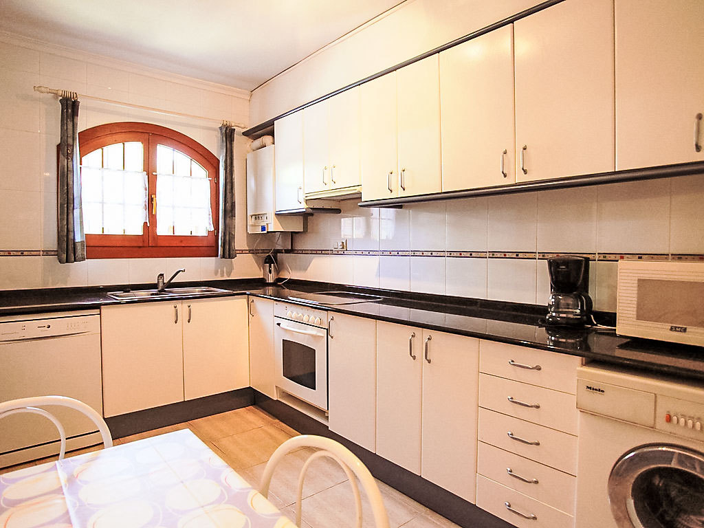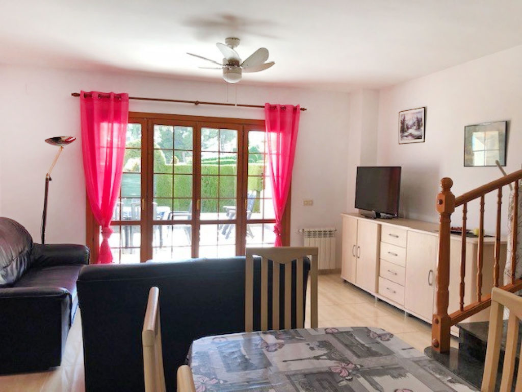 4-Zimmer-Reihenhaus 140 m2 auf 2 Stockwerken. Komfortabel eingerichtet: Wohn-/Esszimmer 24 m2 mit offenem Kamin, Sat-TV, Digital-TV und G-Heizung. Ausgang zur Terrasse. 1 Zimmer 12 m2 mit 1 franz. Bett (140 cm), Bad/Bidet/WC. Ausgang zur Terrasse. 1 Zimmer 9 m2 mit 1 franz. Bett (140 cm). 1 Zimmer 6 m2 mit 1 franz. Bett (140 cm). Küche (Backofen, Geschirrspüler, 4 Glaskeramikherd Platten, Toaster, Wasserkocher, Mikrowelle, elektrische Kaffeemaschine) mit Esstisch. Bad/WC, sep. WC. Terrasse 30 m2, Terrasse 7 m2, Garten 45 m2, Rasen. Terrassenmöbel, Gartengrill. Seitliche Sicht auf das Meer und das Schwimmbad. Zur Verfügung: Waschmaschine, Bügeleisen, Haartrockner. Bitte beachten: TV nur ES, DE, FR. HUTT007705