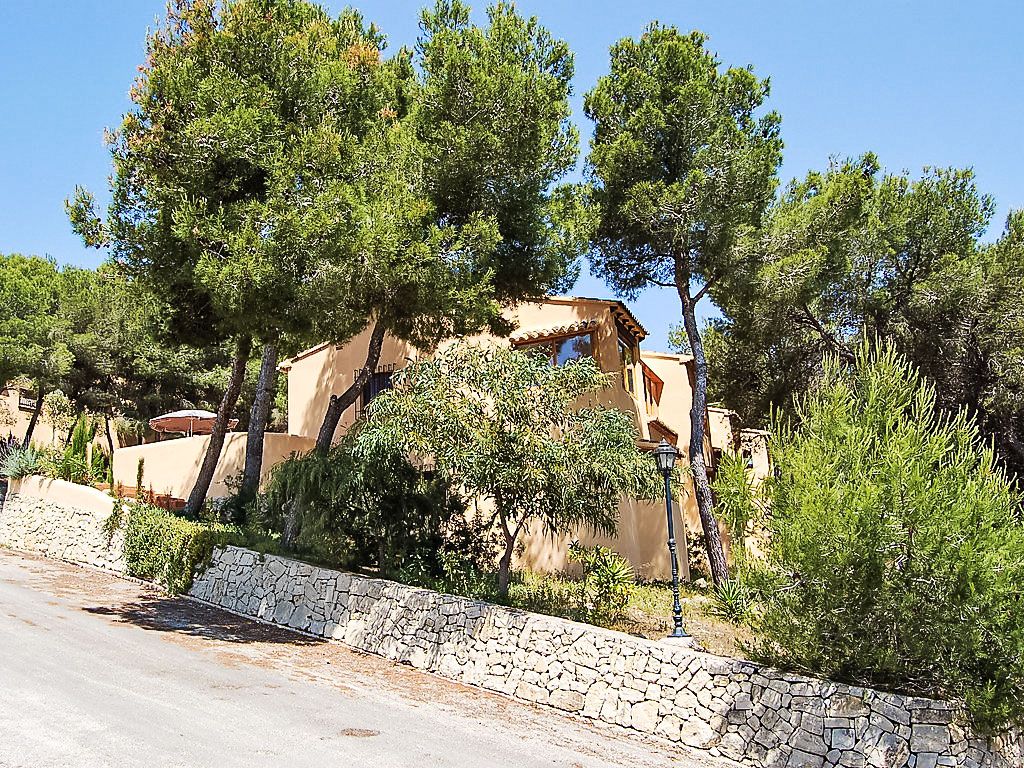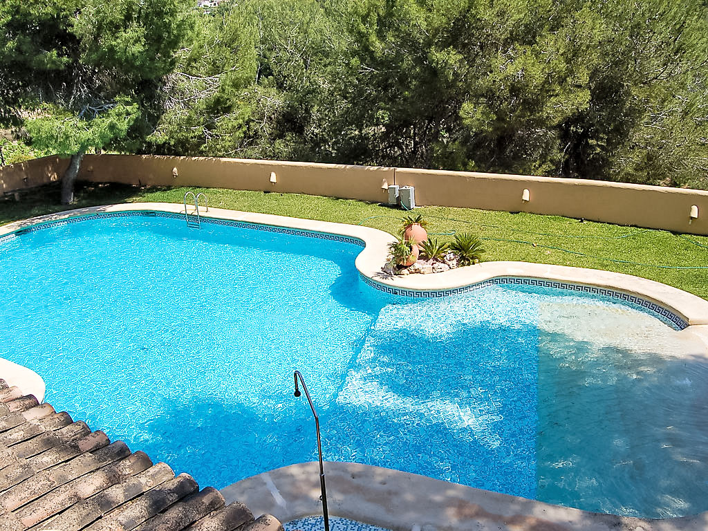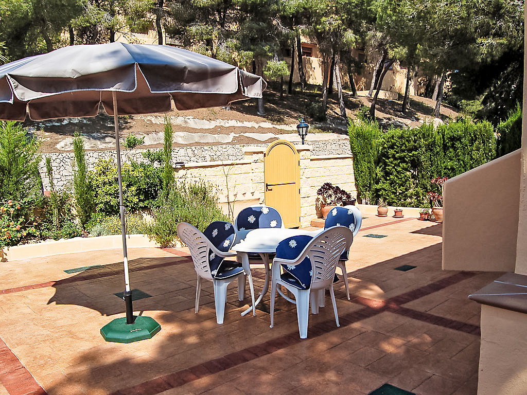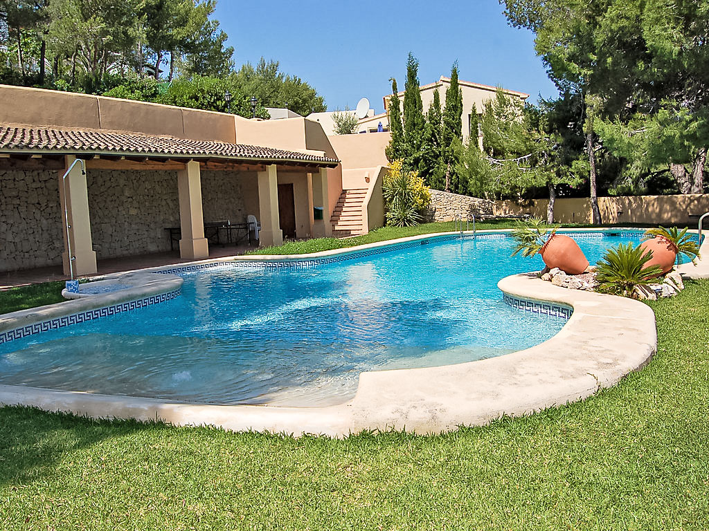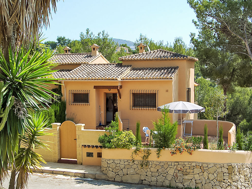 Pinar del l'Advocat: Schönes Reihenhaus "Nuidoor". 1.2 km vom Zentrum von Moraira, ruhige, erhöhte Lage. Zur Mitbenutzung: Liegewiese, Schwimmbad (saisonale Verfügbarkeit: 01.Mai.-30.Sep.) mit Innentreppe. Zur Alleinbenutzung: Grundstück 200 m2, Naturgarten. Gartenmöbel, Grill. Supermarkt 1.2 km, Restaurant 900 m, Bar 1.2 km, Sandstrand 1.2 km, Freibad 100 m. Golfplatz 5.2 km.
