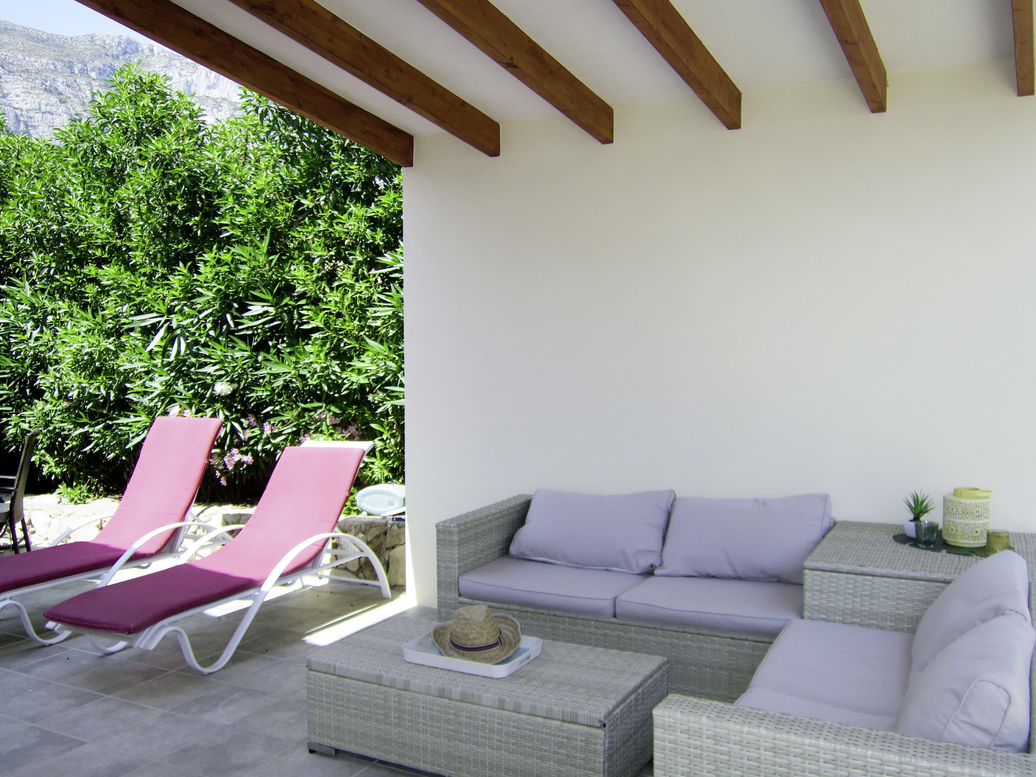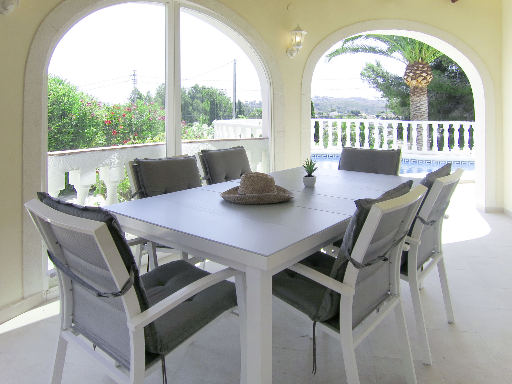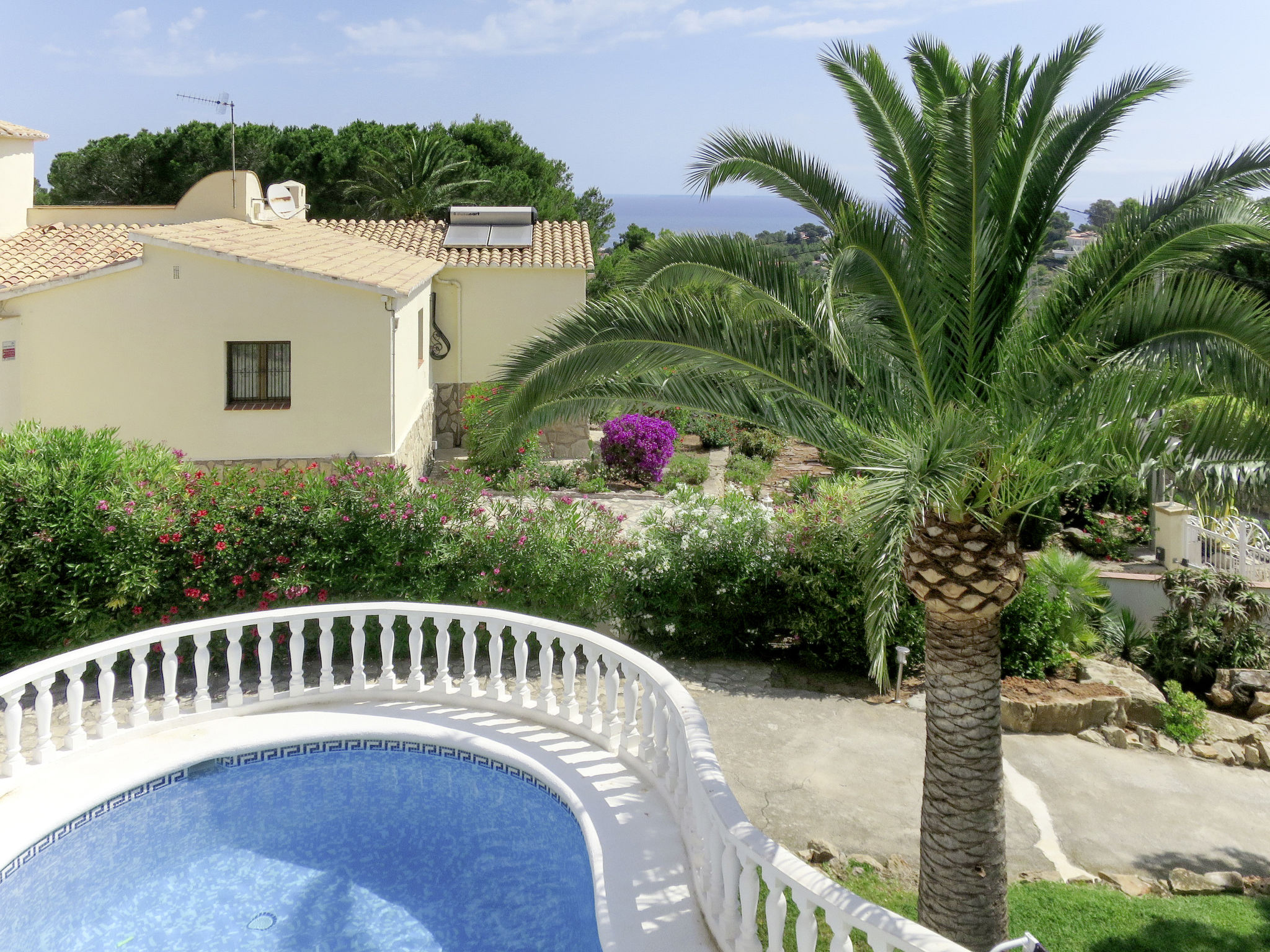 Die CASA ROMANTICA steht im Ortsteil Galleretes, in schöner Aussichtslage mit Blick auf das Meer und den Berg Montgó. Ortsmitte Denia und Strand 2 km. Tennis ca. 100 m. Restaurant ca. 150 m. Ca. 850 m² großes, abgeschlossenes Grundstück mit Palmen, Rasenfläche, Bougainvilleen, Oleander, Hibiscus und Agaven. Schöner geschwungener Pool (ca. 28 m², ganzjährig geöffnet) mit Poolterrasse, 4 Sonnenliegen und Sonnenschirm. Grill. Überdachte Terrasse (ca. 16 m²) mit Gartenmöbeln. Mit Natursteinen geflieste Grundstückseinfahrt. 1 überdachter Parkplatz. Weitere Parkmöglichkeiten auf dem Grundstück. Das Haus ist hell und feriengerecht eingerichtet. Einbauschränke. Fliesenböden. Sat-TV. Internetzugang (WLAN, inklusive). Waschmaschine. Klimaanlage mit Kühl-/Heizfunktion. Hinweis: Rauchen ist im Haus nicht gestattet.