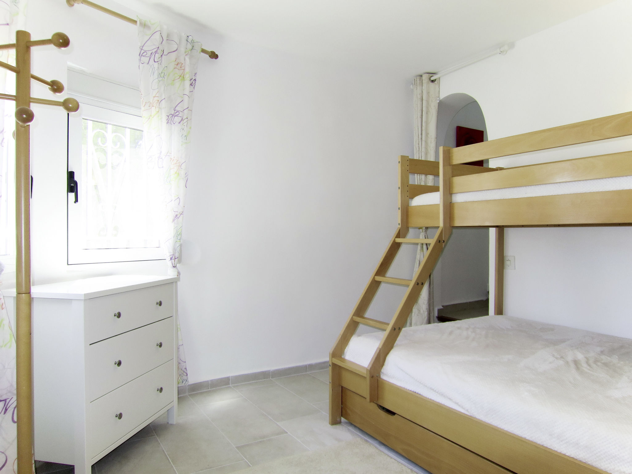 4-Zimmer-Haus, 2 Etagen, ca. 110 m². Erdgeschoss: Eingang über Terrasse in Wohnraum mit Sitzgruppe, Kamin und Essplatz. Küche (4 Ceranfelder, Backofen, Mikrowelle, Geschirrspüler, Kühlschrank, Kaffeemaschine). Doppelzimmer. Dusche/WC. Schlafzimmer (Durchgangszimmer) mit Etagenbett (unten franz. Bett, ca. 1,35 m breit, oben Einzelbett) und offenem Zugang zum Obergeschoss: Doppelzimmer mit Dusche/WC. Maximale Belegung: 6 Erwachsene und 1 Kind bis 2 Jahre. X0346541T