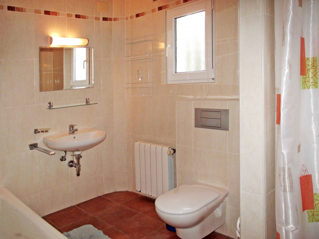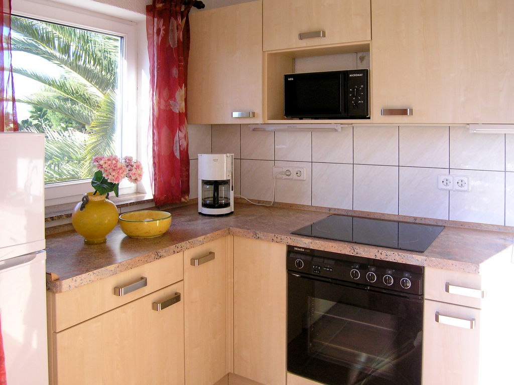 4-Zimmer-Haus, 3 Ebenen, ca. 100 m². Eingang in die 3. Ebene: Wohnraum mit Sitzgruppe, Kamin und Essplatz, durch Rundbogen in Küche (4 Ceranfelder, Backofen, Geschirrspüler, Kühlschrank, Kaffeemaschine, Toaster). Über interne Treppe zur 2. Ebene: Doppelzimmer. Bad/Dusche/WC. Über einige Stufen zur 1. Ebene: Doppelzimmer. VT-453402A
