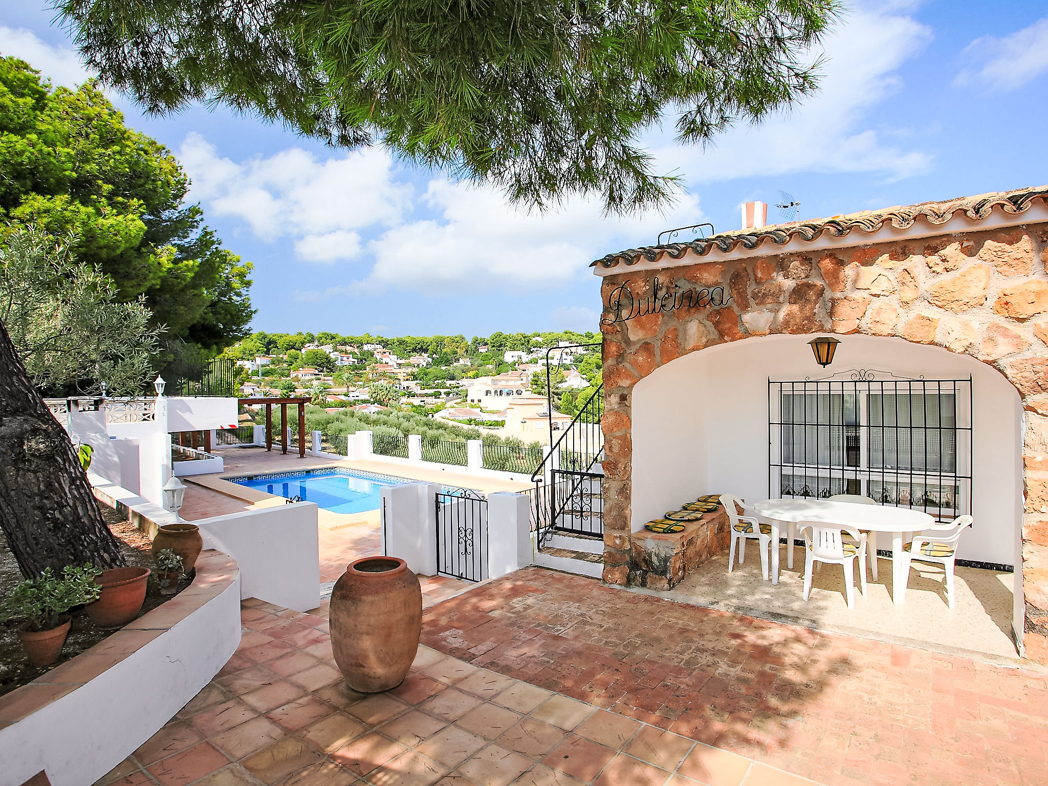 La Fustera: Gemütliches Einfamilienhaus "Dulcinea". 5.6 km vom Zentrum von Calpe, 600 m vom Meer. Zur Alleinbenutzung: Grundstück 850 m2, Schwimmbad geschützt (8 x 4 m, 01.01.-31.12.) mit Innentreppe. Parkplatz. Supermarkt, Restaurant, Bar 300 m, Sandstrand 600 m. Nahe gelegene Sehenswürdigkeiten: Aqualandia, Mundomar, Terra Mítica, Terra Natura, y Benidorm Palace (Benidorm).