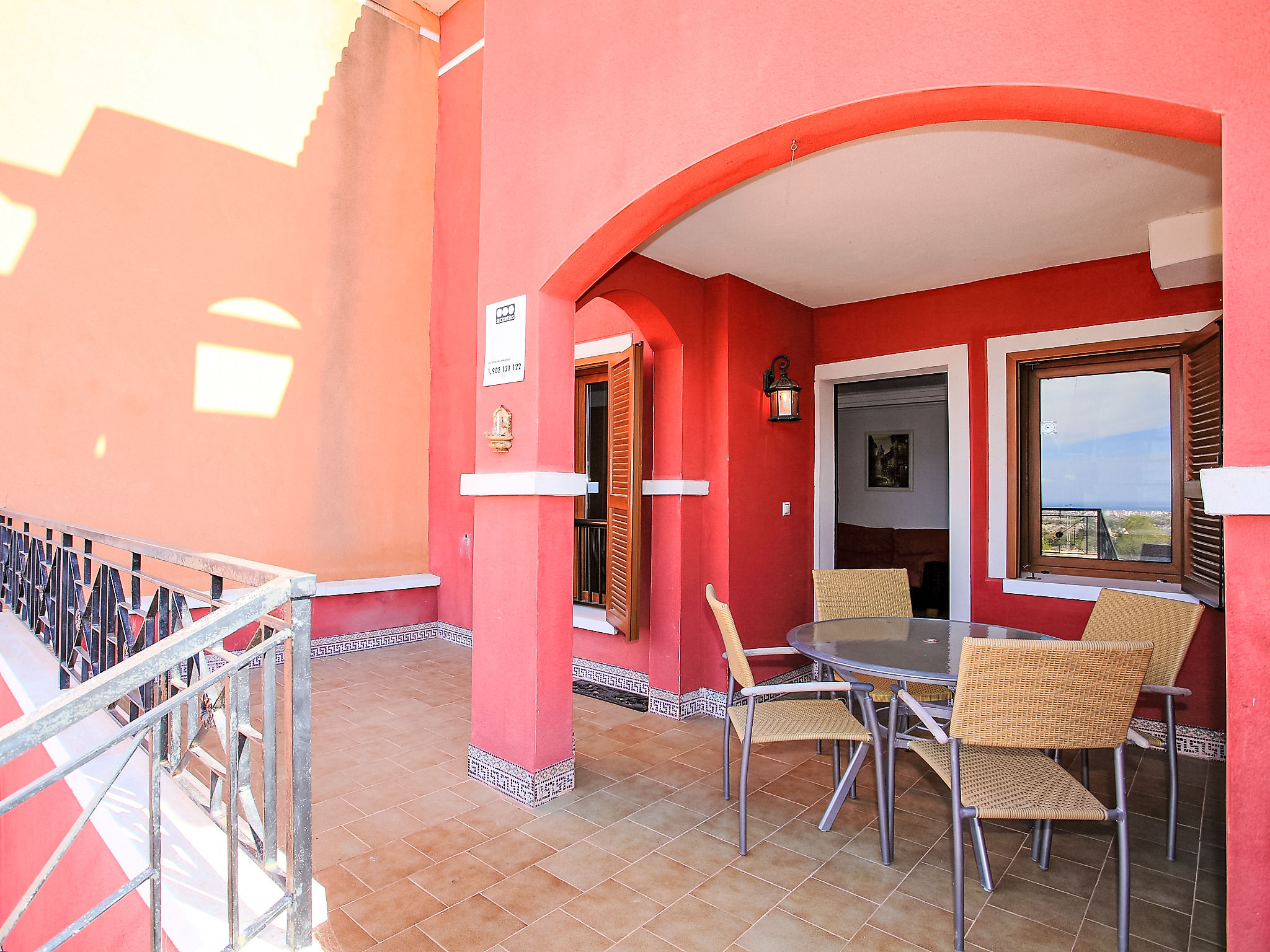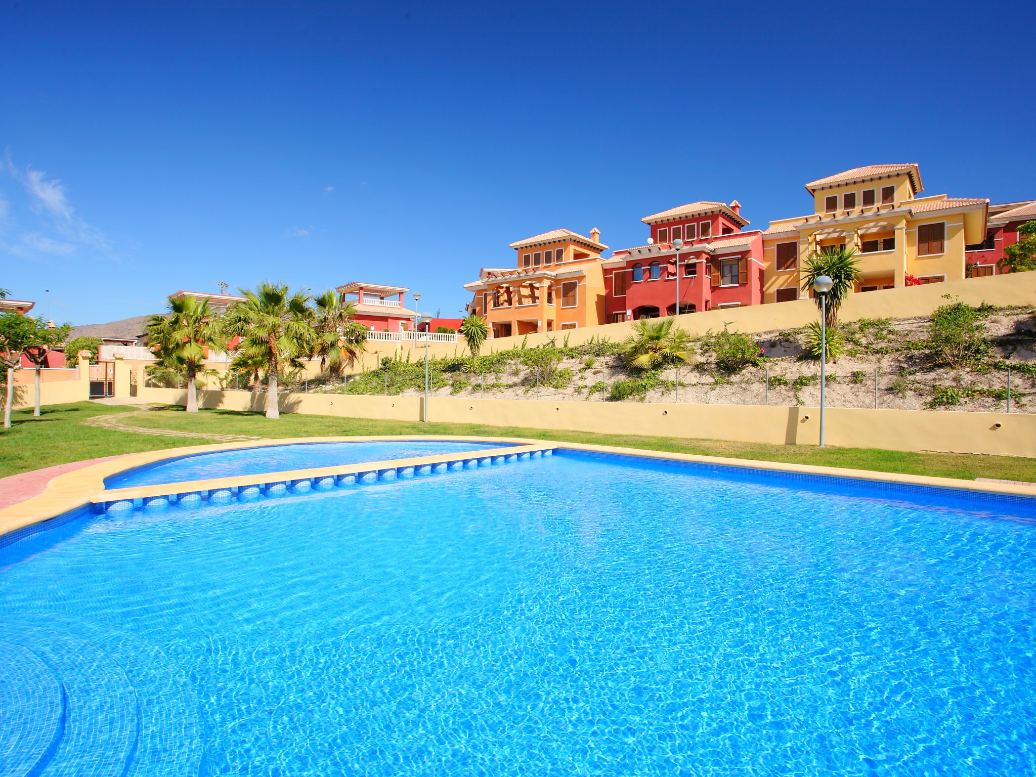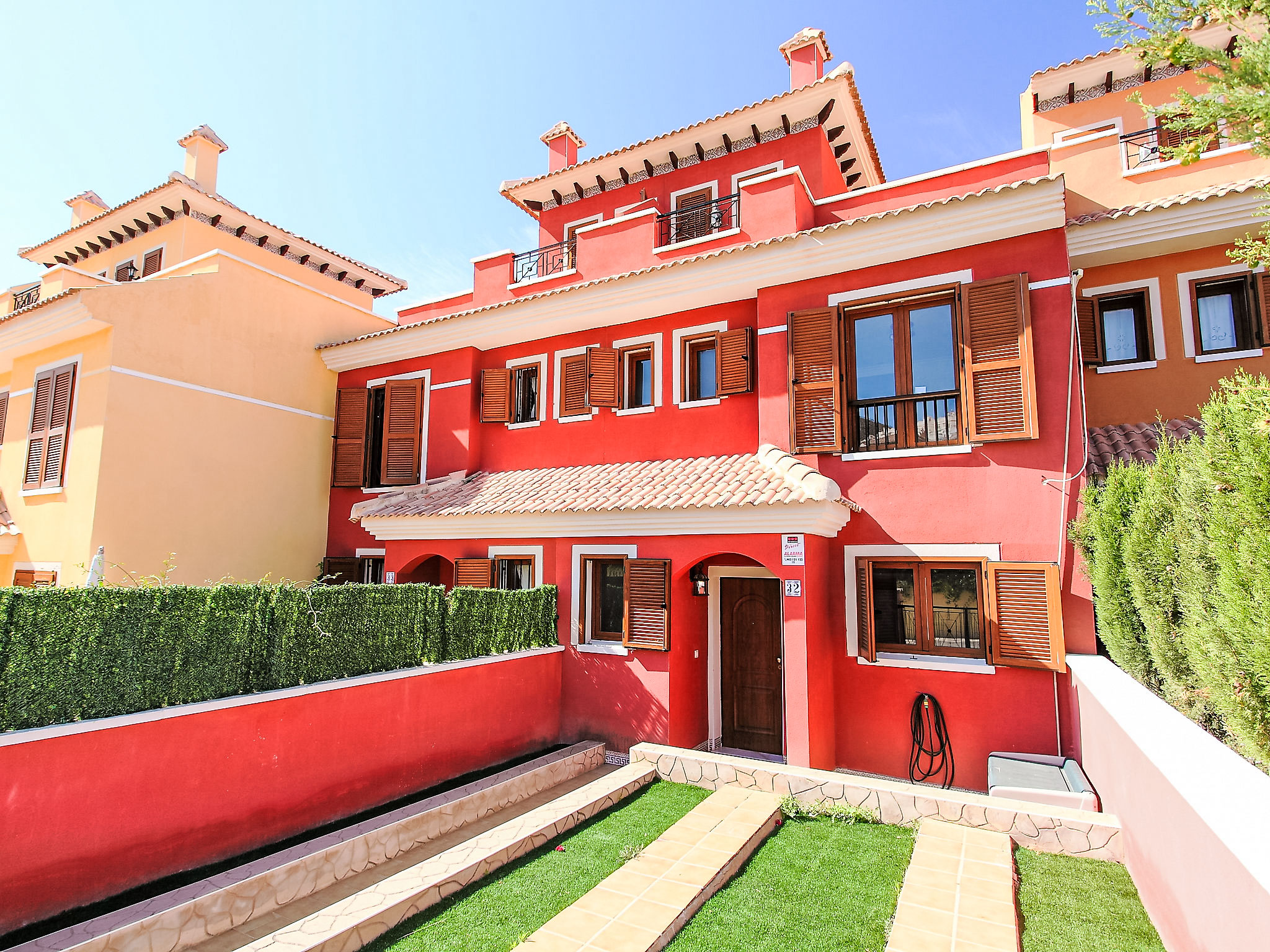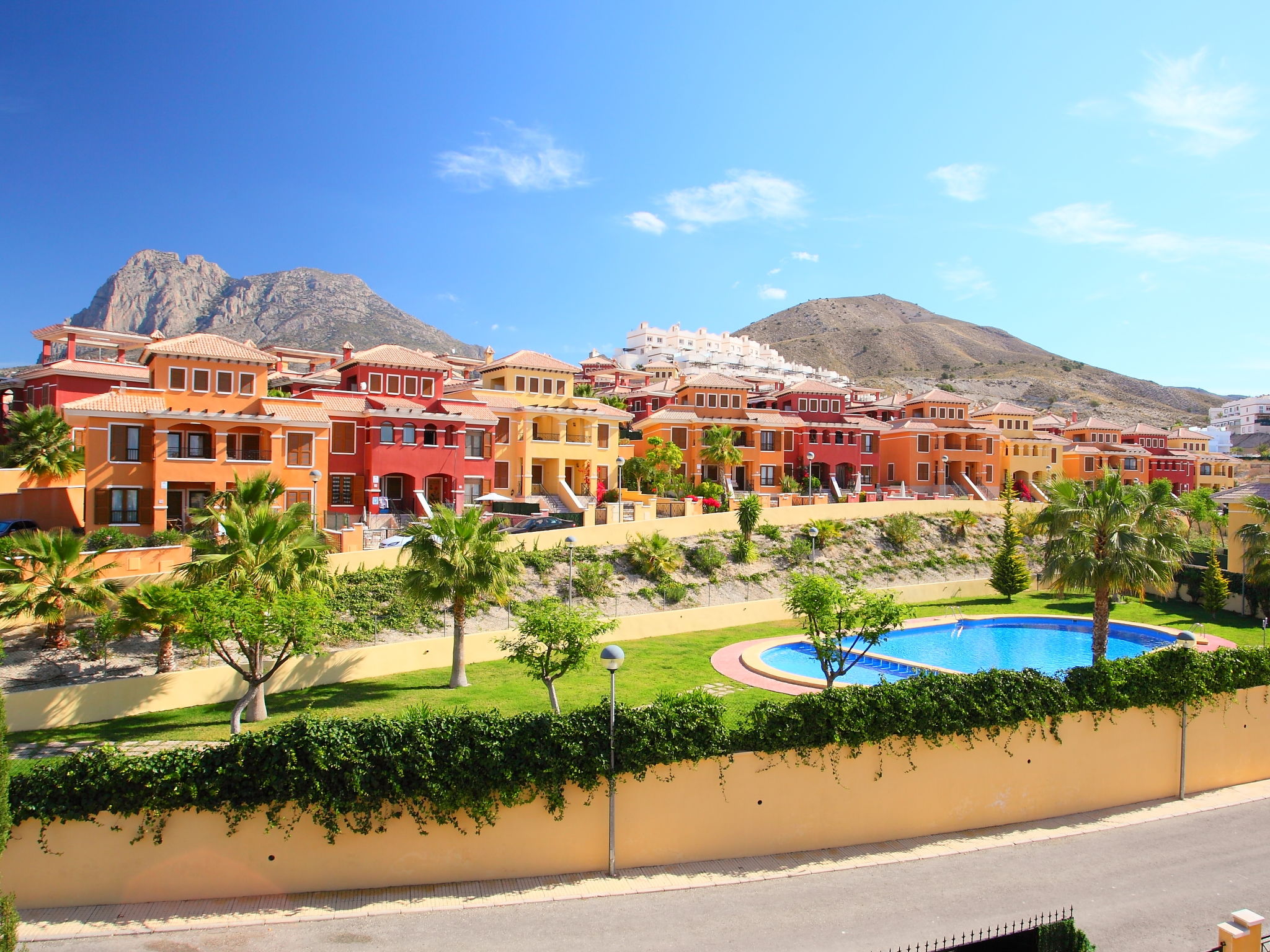 "Balcon de Finestrat", 4-Zimmer-Reihenhaus 100 m2 auf 3 Stockwerken. Hell, zweckmässig und komfortabel eingerichtet: Wohn-/Esszimmer 20 m2 mit Digital-TV, Klimaanlage und Warmluftheizung. Ausgang zur Terrasse. Küche 7 m2 (Backofen, 4 Glaskeramikherd Platten, Toaster, Wasserkocher, Mikrowelle, Tiefkühler, elektrische Kaffeemaschine). Dusche/WC. Boiler (50 Liter). Unteres Geschoss: 1 Zimmer 10 m2 mit 1 franz. Bett (150 cm, Länge 190 cm), Klimaanlage. Ausgang zur Terrasse. Dusche/WC. Obergeschoss: 1 Zimmer 8 m2 mit 2 Betten (90 cm, Länge 190 cm), Klimaanlage. 1 Zimmer 10 m2 mit 1 franz. Bett (150 cm, Länge 190 cm), Klimaanlage. Dusche/WC. 2 Terrassen 6 m2, Gartensitzplatz 18 m2. Terrassenmöbel, Liegestühle. Fernsicht auf das Meer, das Schwimmbad und die Landschaft. Zur Verfügung: Waschmaschine, Bügeleisen, Haartrockner. Internet (Wireless LAN, gratis). Parkplatz beim Haus, Höhe 230 cm, Breite 320 cm. Maximal 1 kleines Haustier/Hund erlaubt. AT321227BM