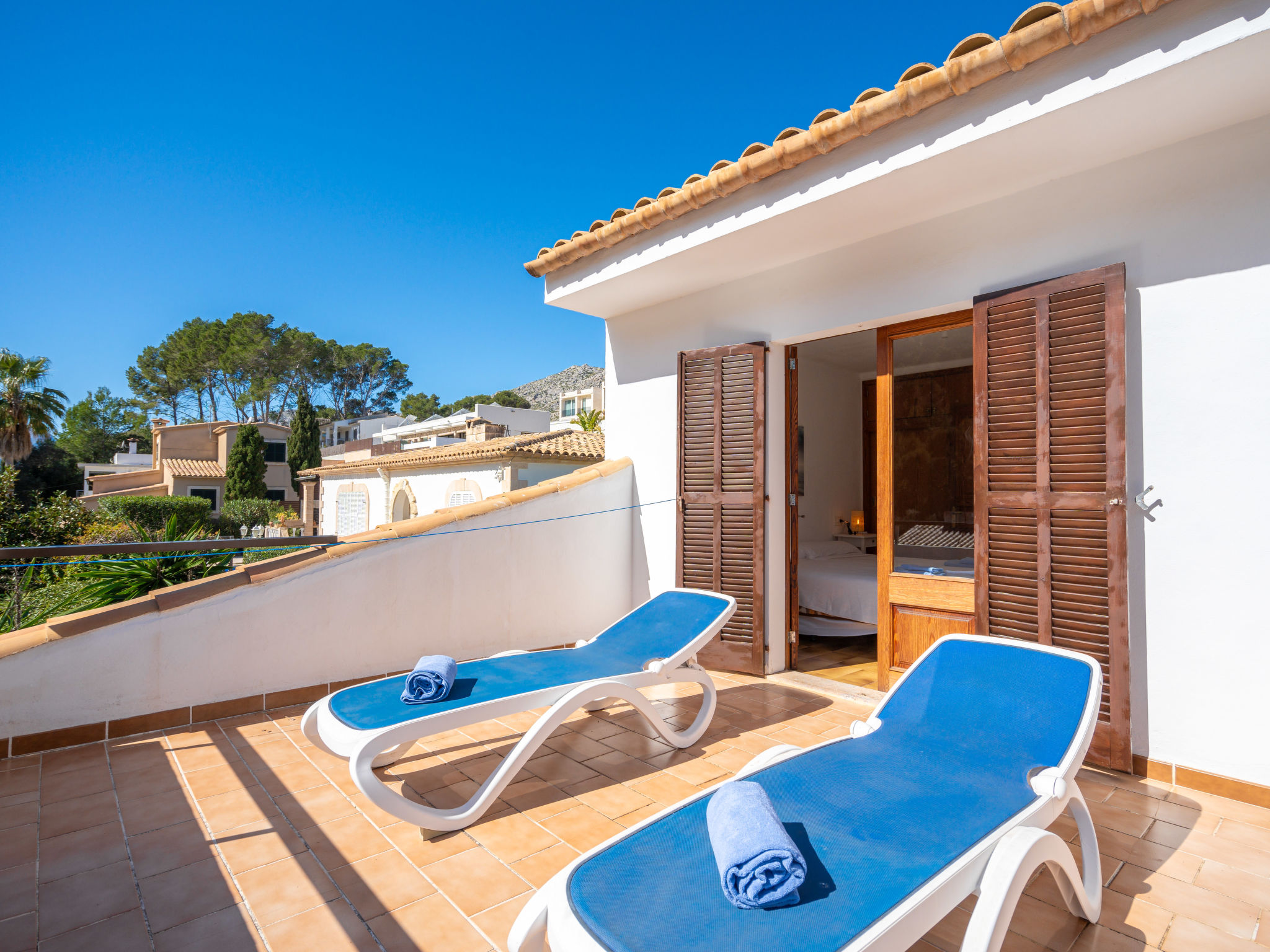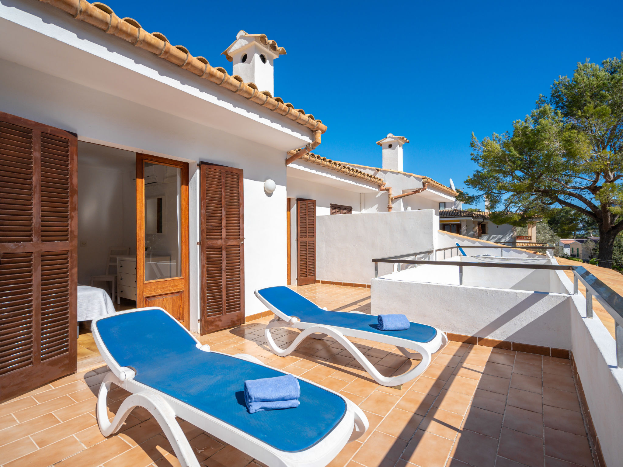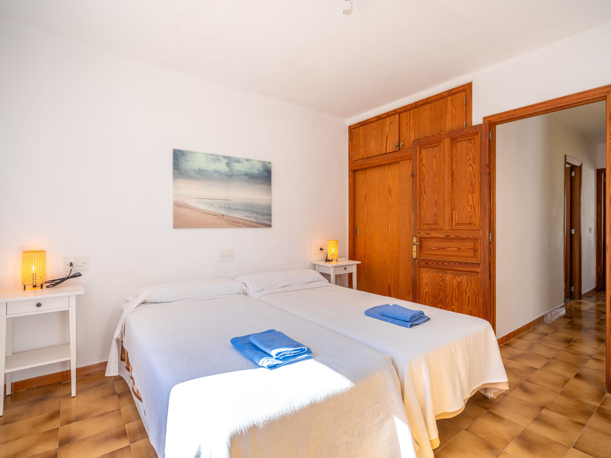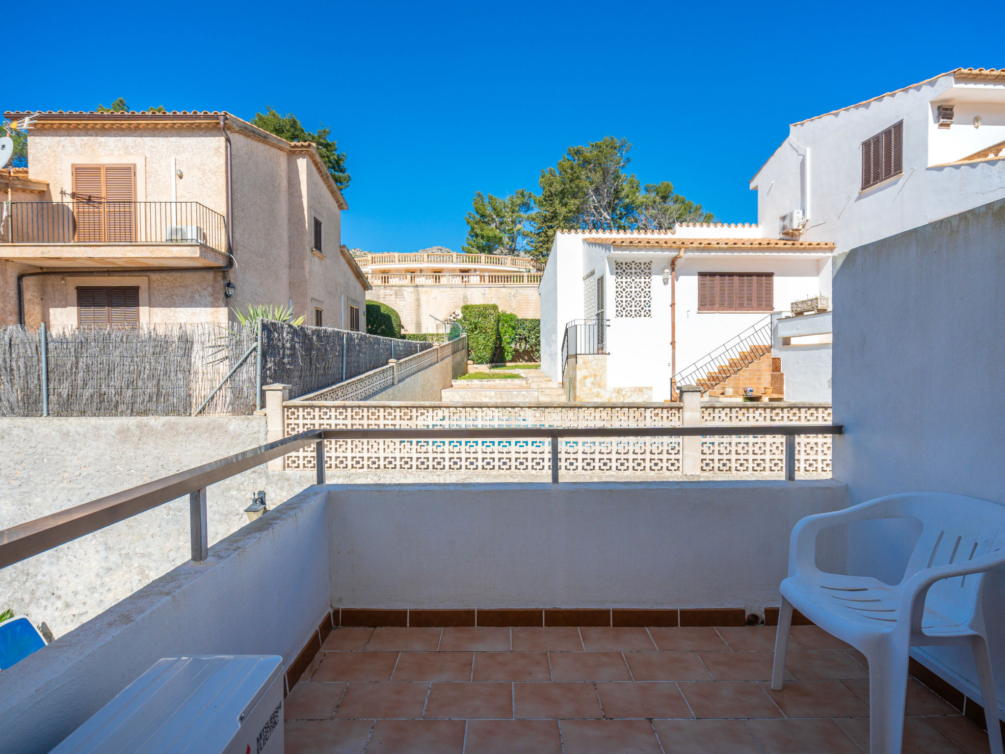 6-Zimmer-Wohnung, 2 Etagen, ca. 130 m². 1. Etage: Wohnraum mit Sitzgruppe, Kamin, Essplatz und Terrassenausgang. Küche (4 Ceranfelder, Backofen, Mikrowelle, Geschirrspüler, Kühl-/Gefrierkombination, Kaffeemaschine, Wasserkocher, Toaster), Ausgang zur Poolterrasse. Einzelzimmer, Terrassenausgang. Bad/WC. 2. Etage: 3 Zweibettzimmer, jeweils mit Terrassenausgang. Einzelzimmer. Dusche/Doppelwaschbecken/WC. VTV0006BAL