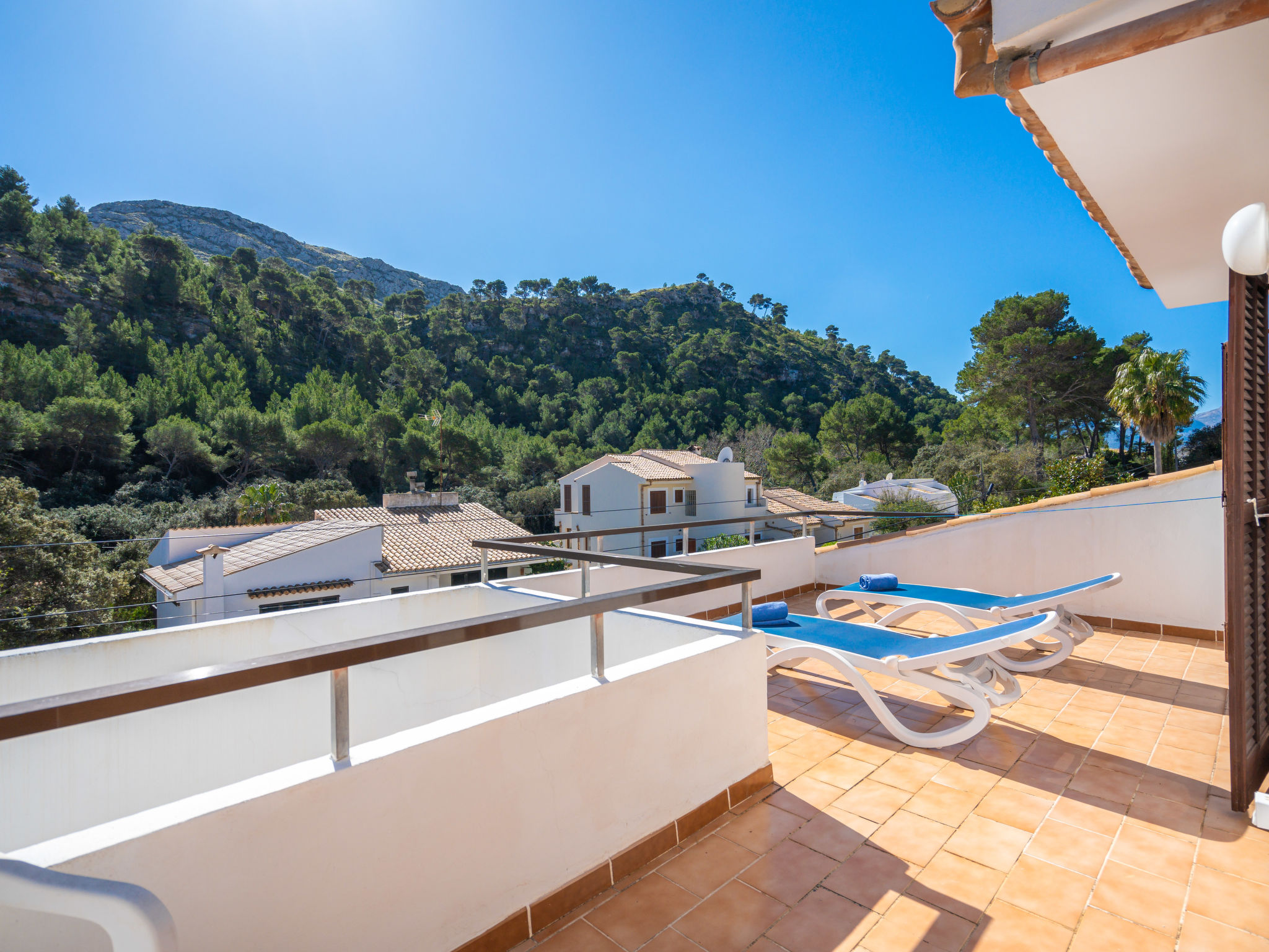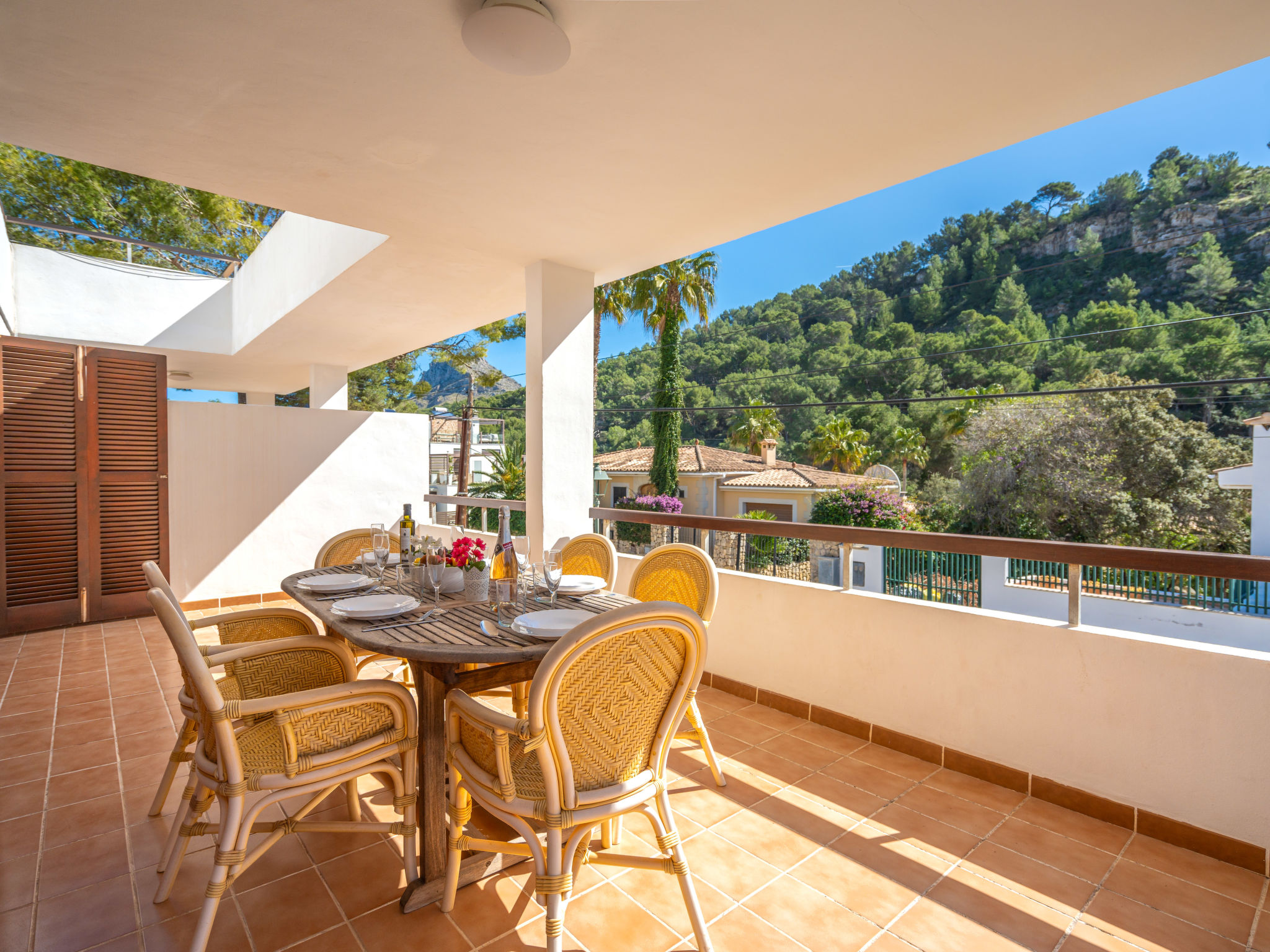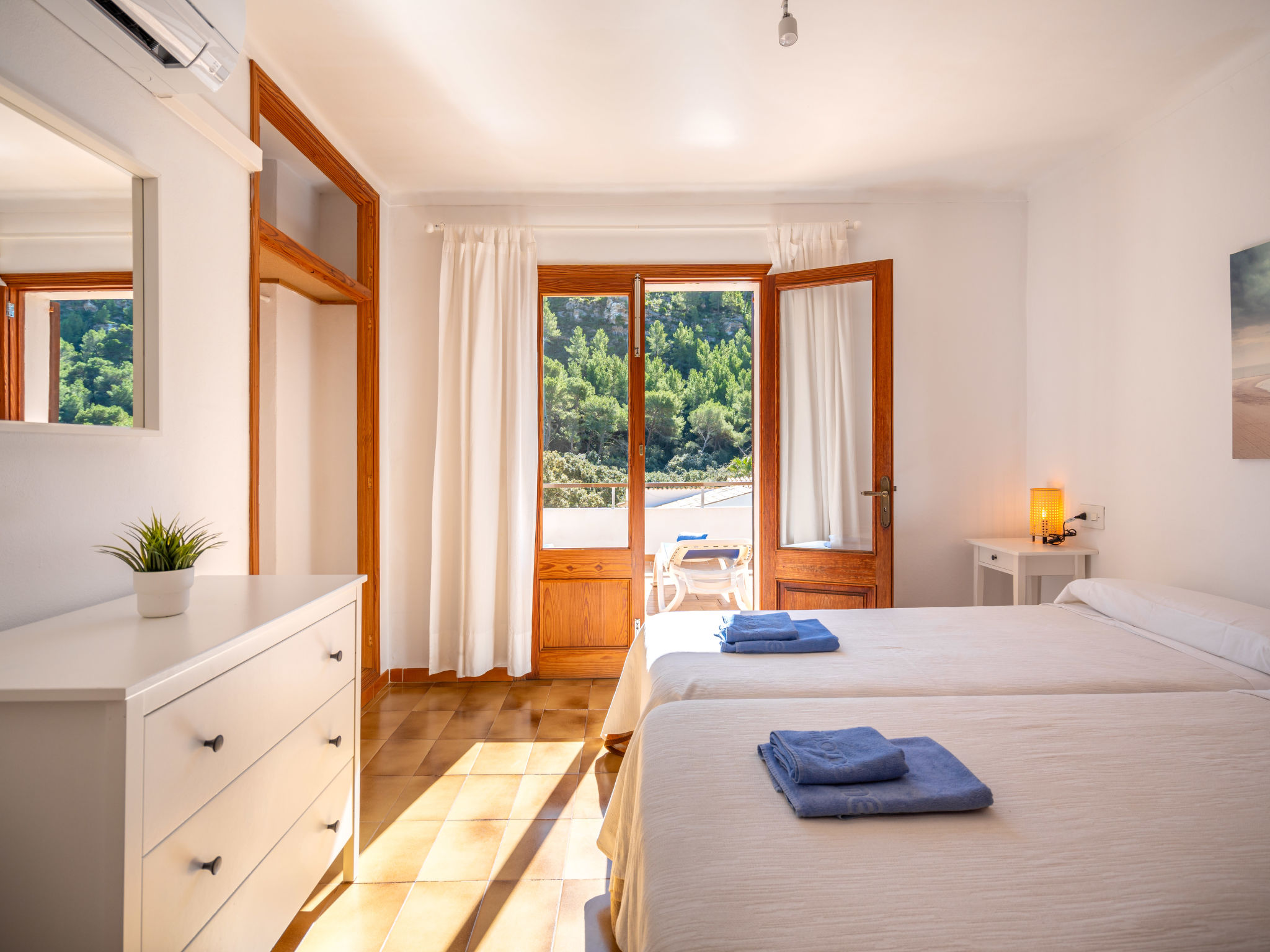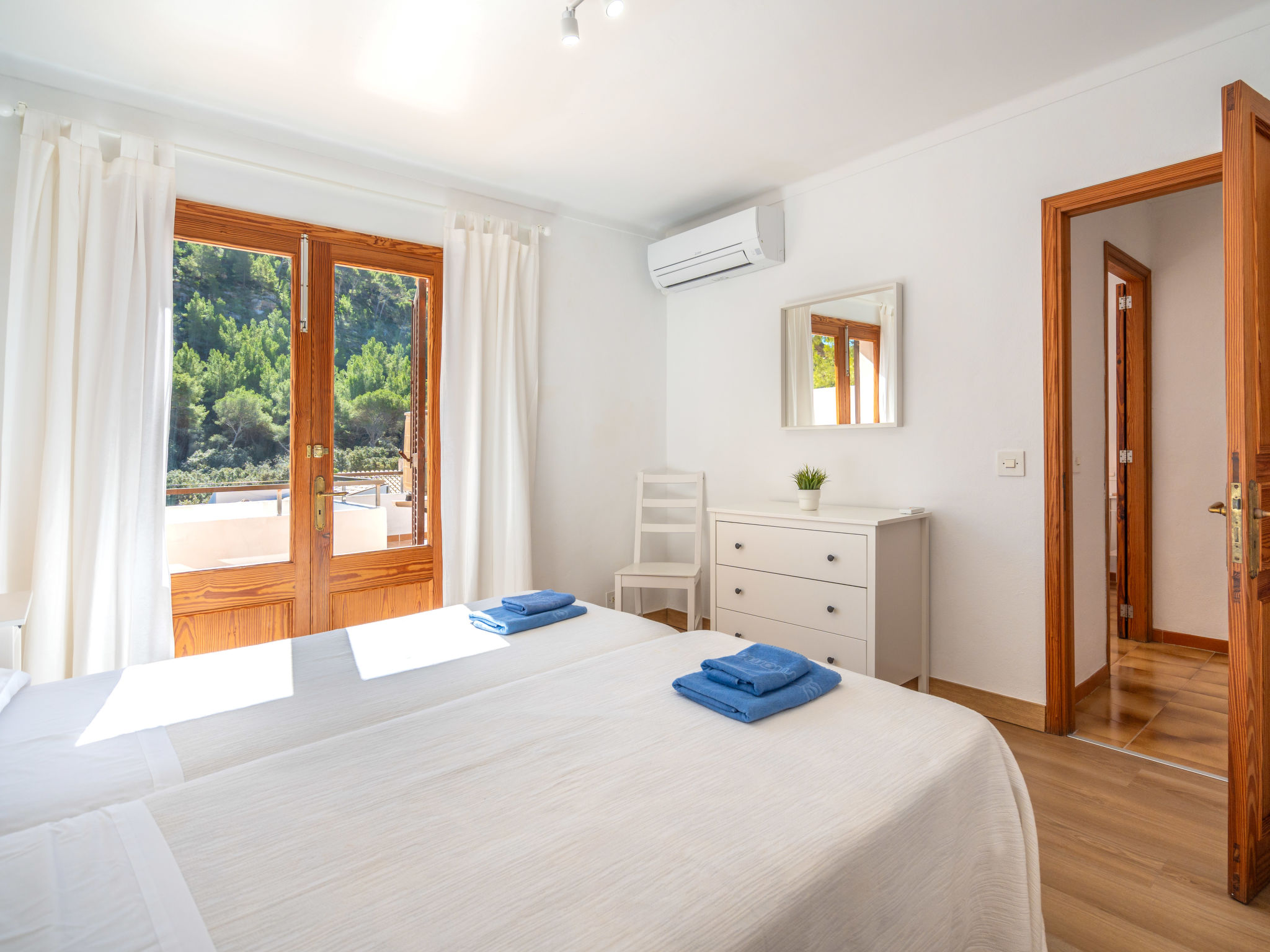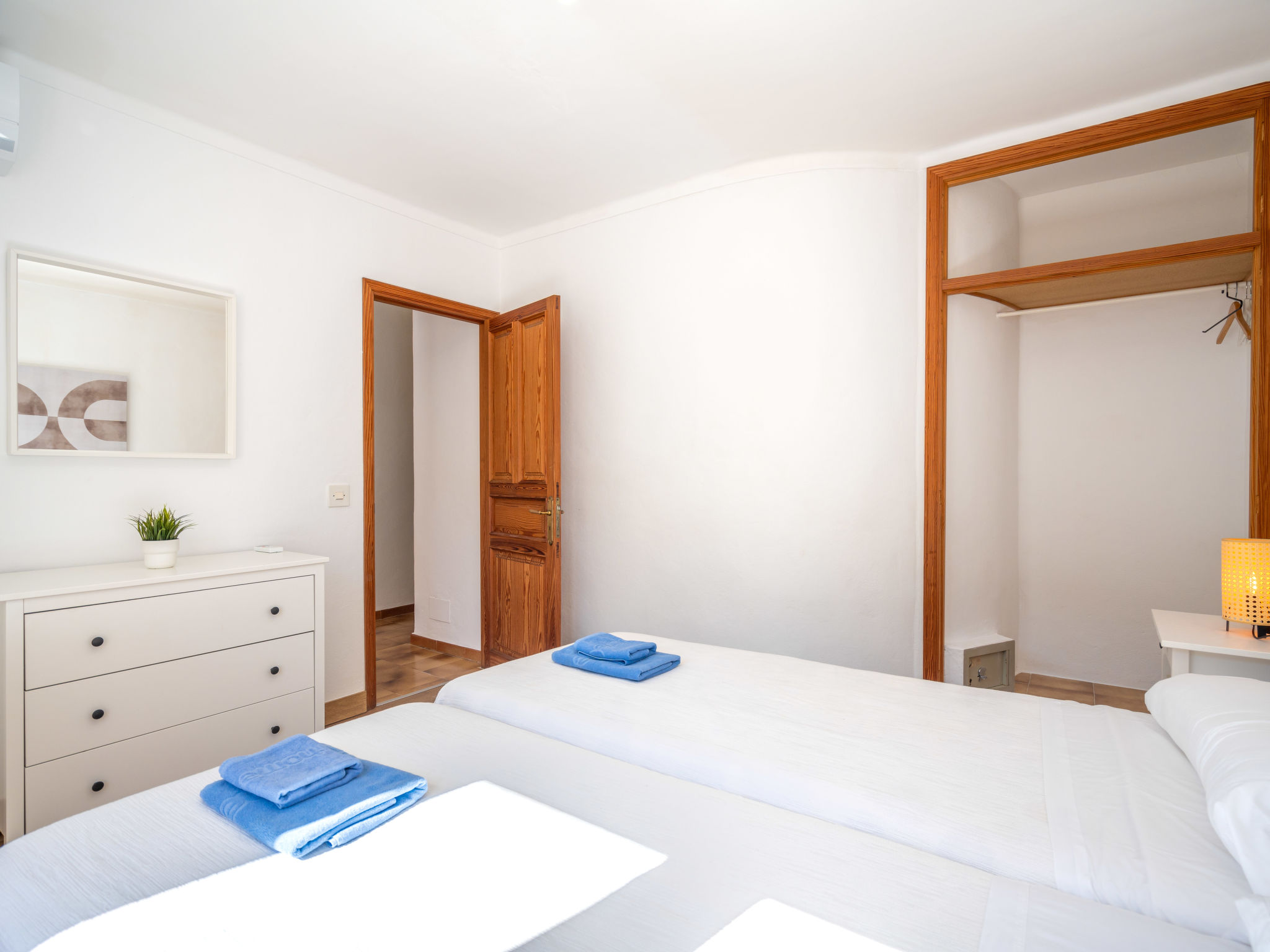 6-Zimmer-Wohnung, 2 Etagen, ca. 130 m². 1. Etage: Wohnraum mit Sitzgruppe, Kamin, Essplatz und Terrassenausgang. Küche (4 Ceranfelder, Backofen, Mikrowelle, Geschirrspüler, Kühl-/Gefrierkombination, Kaffeemaschine, Wasserkocher, Toaster), Ausgang zur Poolterrasse. Einzelzimmer, Terrassenausgang. Bad/WC. 2. Etage: 3 Zweibettzimmer, jeweils mit Terrassenausgang. Einzelzimmer. Dusche/Doppelwaschbecken/WC. VTV0006BAL