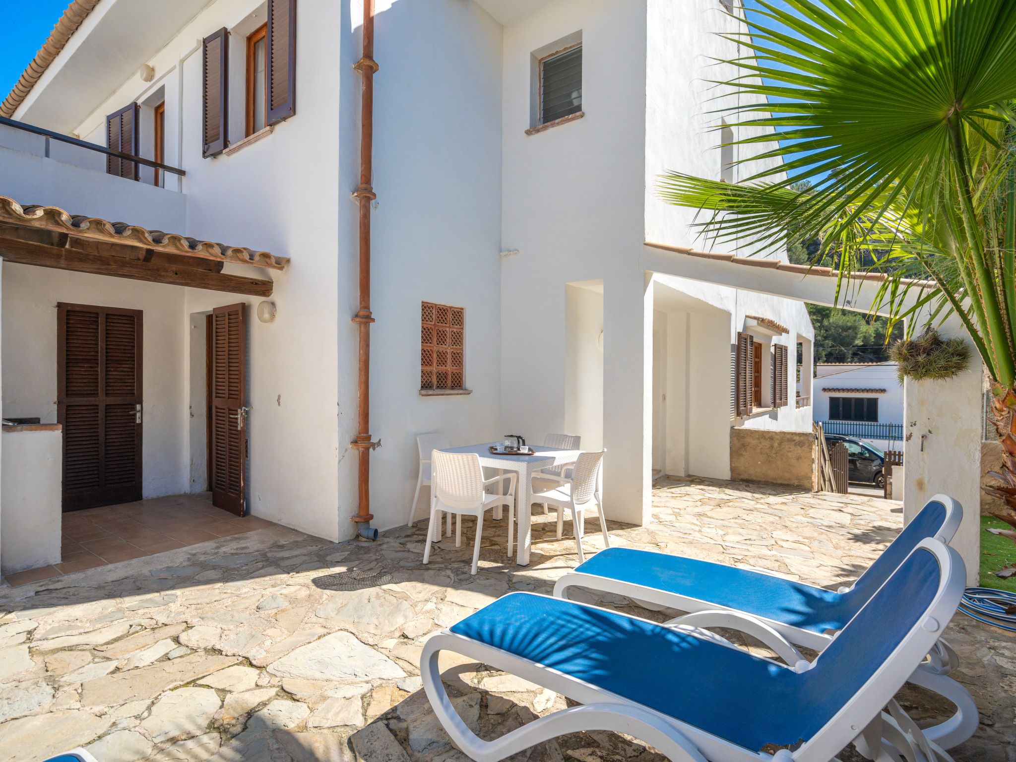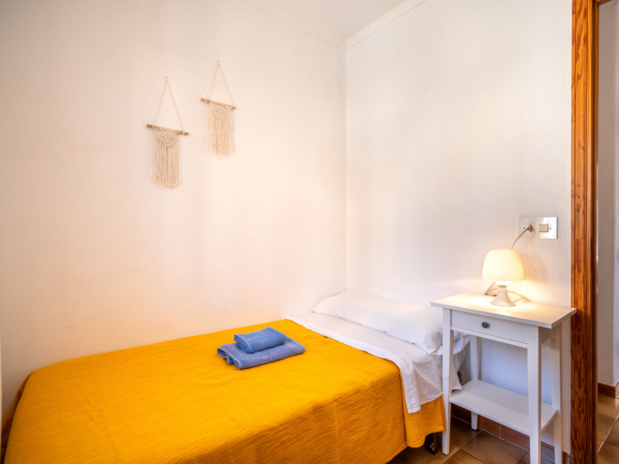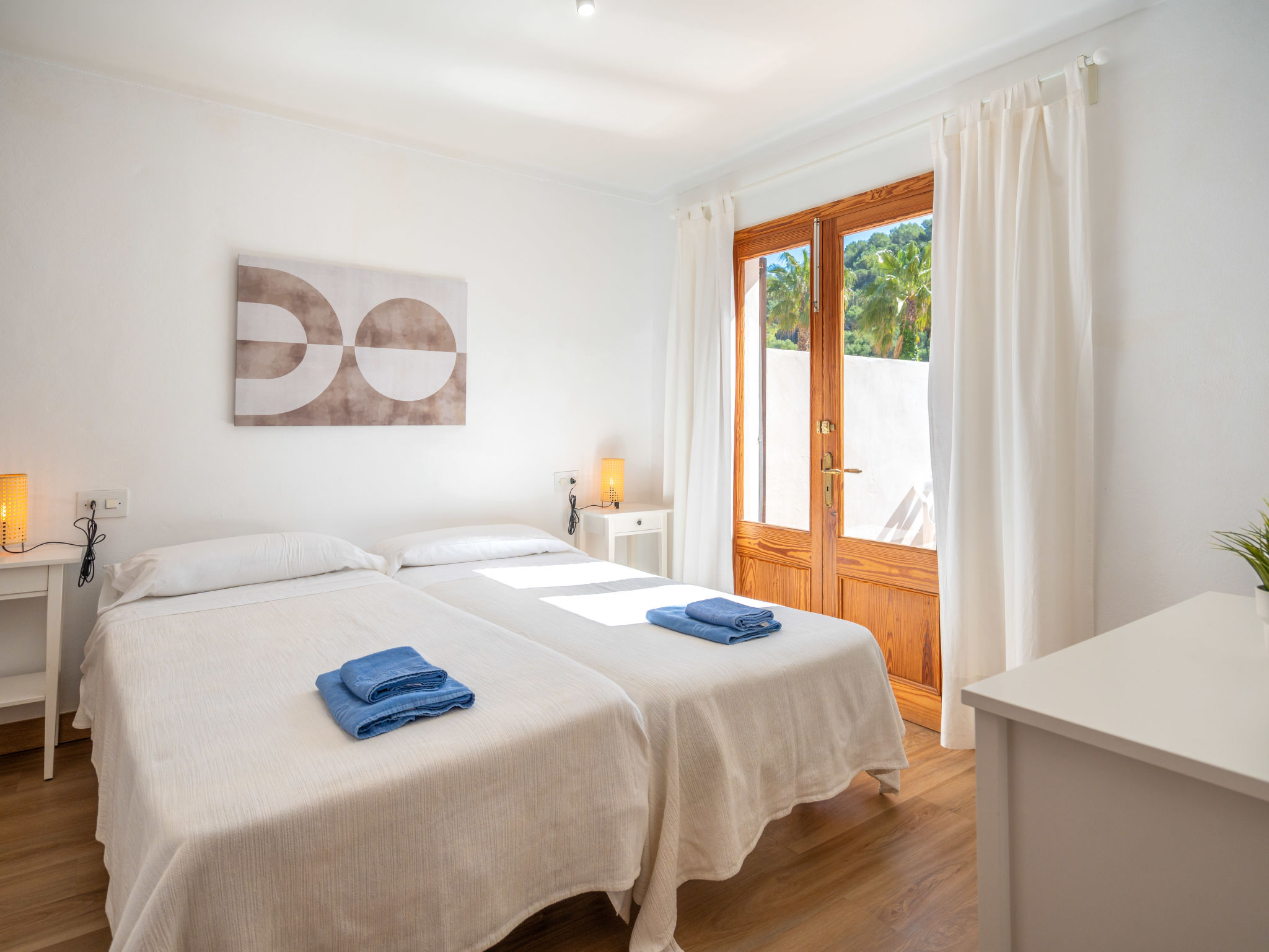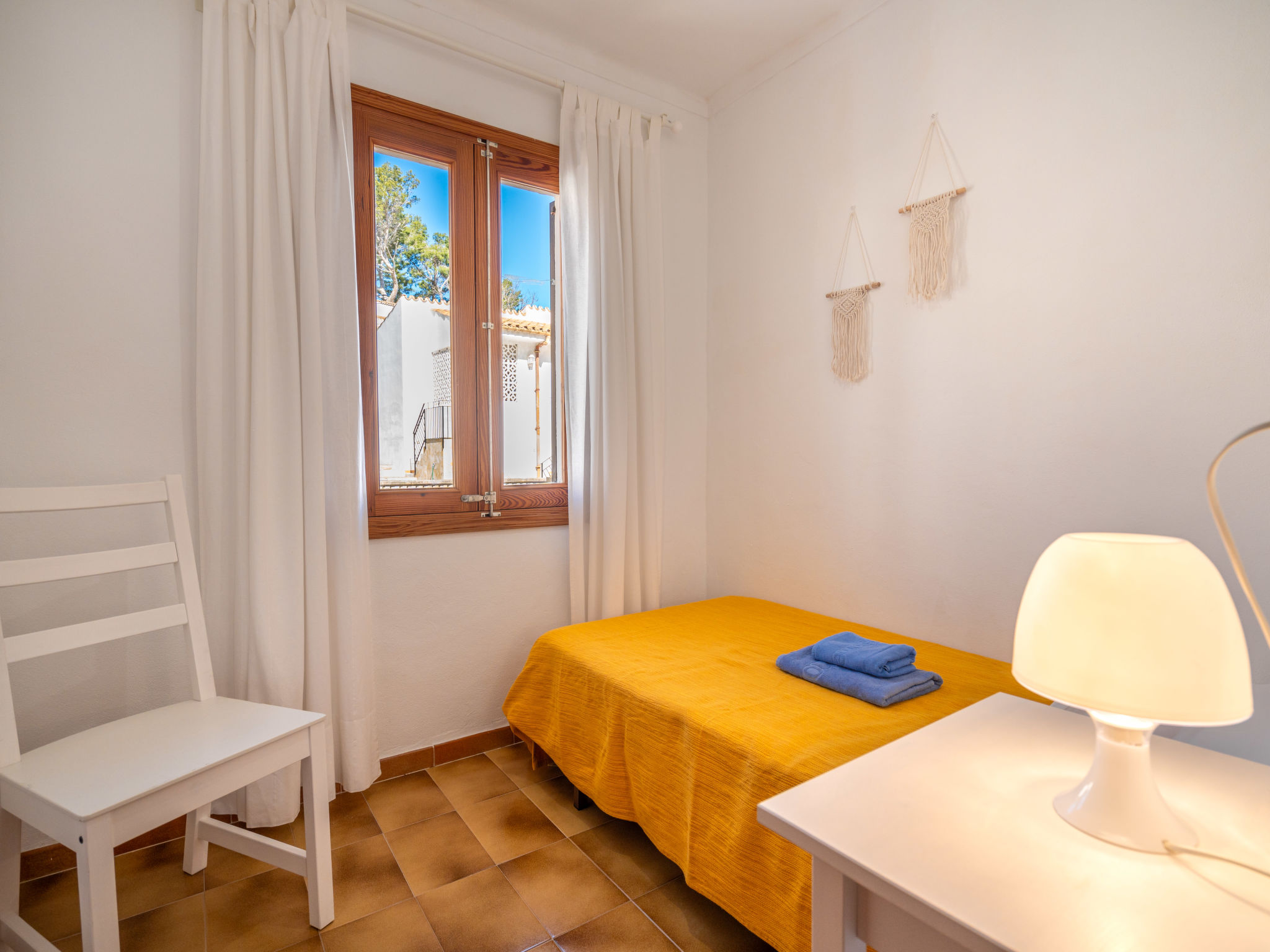 6-Zimmer-Wohnung, 2 Etagen, ca. 130 m². 1. Etage: Wohnraum mit Sitzgruppe, Kamin, Essplatz und Terrassenausgang. Küche (4 Ceranfelder, Backofen, Mikrowelle, Geschirrspüler, Kühl-/Gefrierkombination, Kaffeemaschine, Wasserkocher, Toaster), Ausgang zur Poolterrasse. Einzelzimmer, Terrassenausgang. Bad/WC. 2. Etage: 3 Zweibettzimmer, jeweils mit Terrassenausgang. Einzelzimmer. Dusche/Doppelwaschbecken/WC. VTV0006BAL