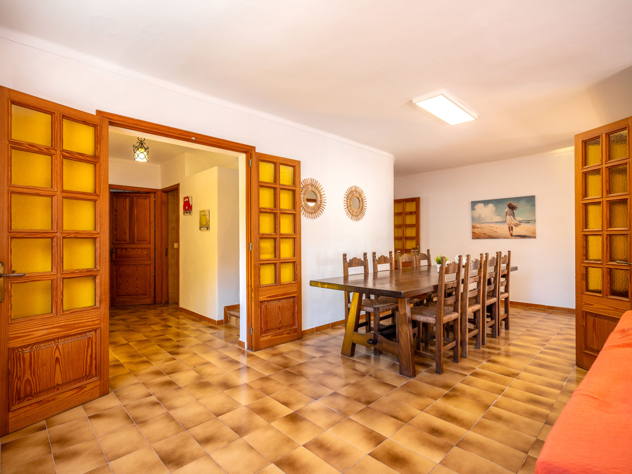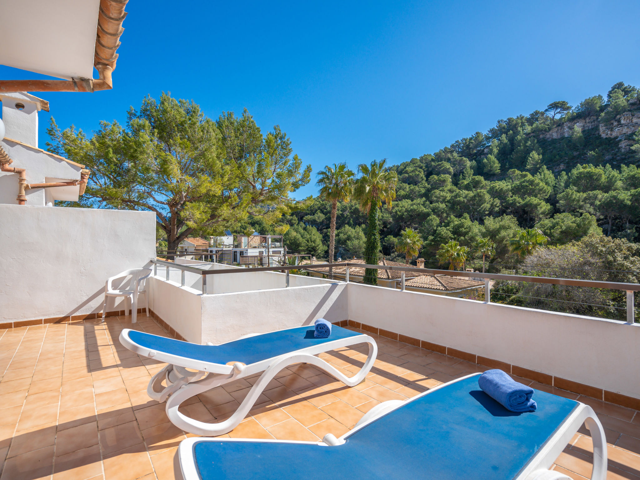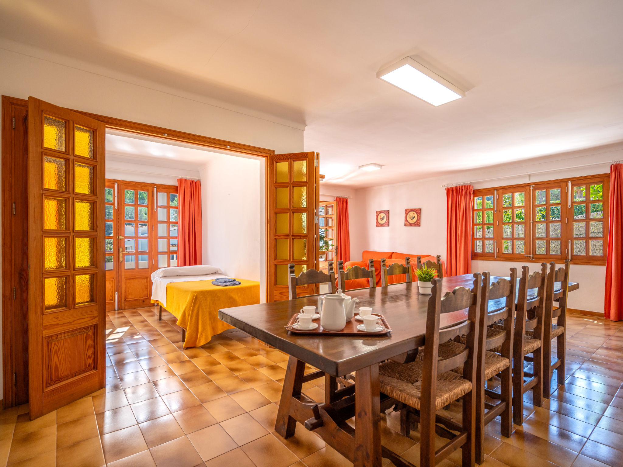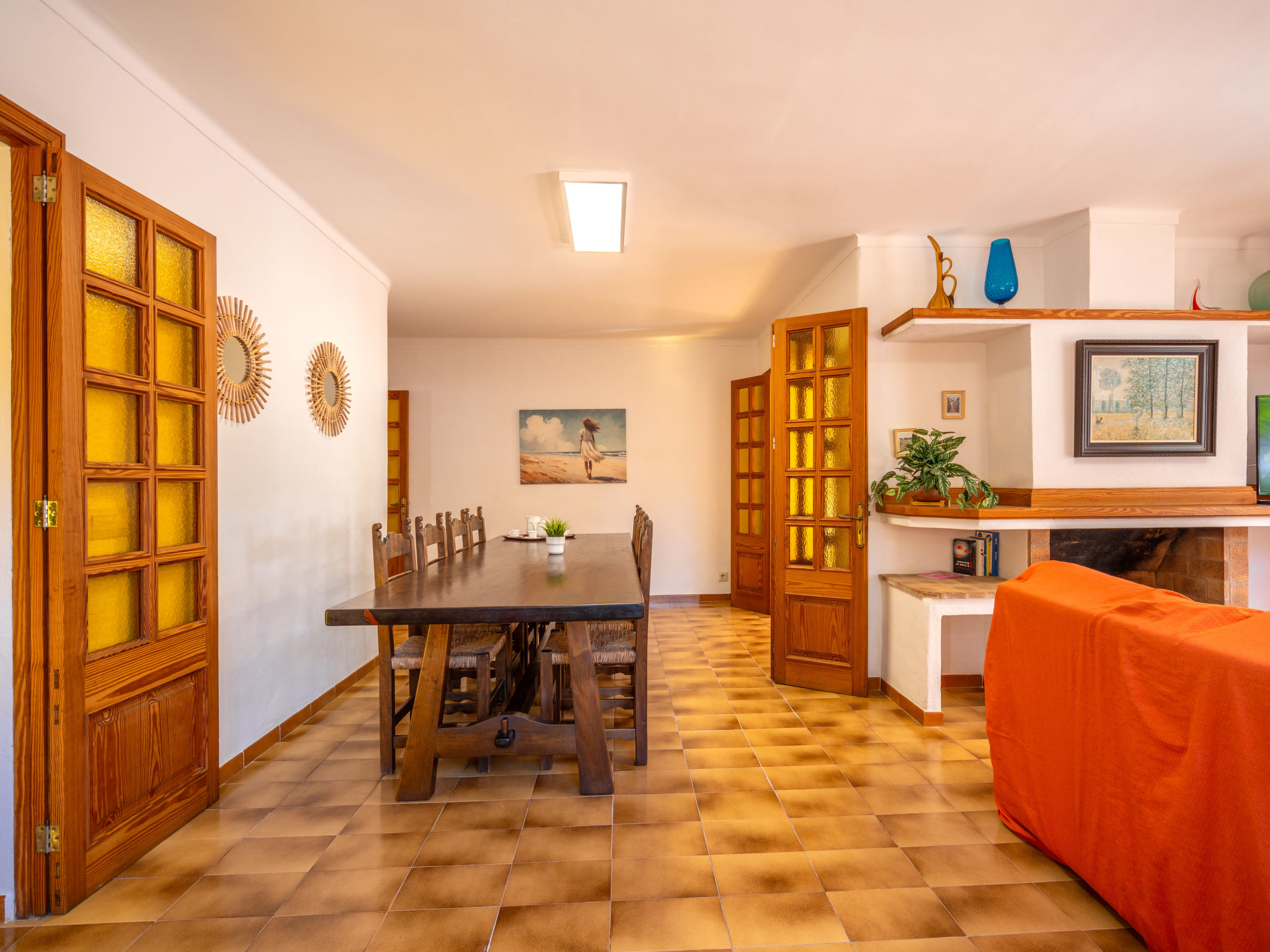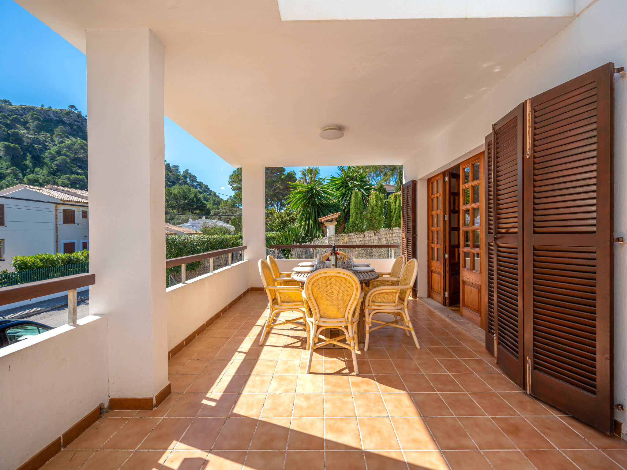 6-Zimmer-Wohnung, 2 Etagen, ca. 130 m². 1. Etage: Wohnraum mit Sitzgruppe, Kamin, Essplatz und Terrassenausgang. Küche (4 Ceranfelder, Backofen, Mikrowelle, Geschirrspüler, Kühl-/Gefrierkombination, Kaffeemaschine, Wasserkocher, Toaster), Ausgang zur Poolterrasse. Einzelzimmer, Terrassenausgang. Bad/WC. 2. Etage: 3 Zweibettzimmer, jeweils mit Terrassenausgang. Einzelzimmer. Dusche/Doppelwaschbecken/WC. VTV0006BAL
