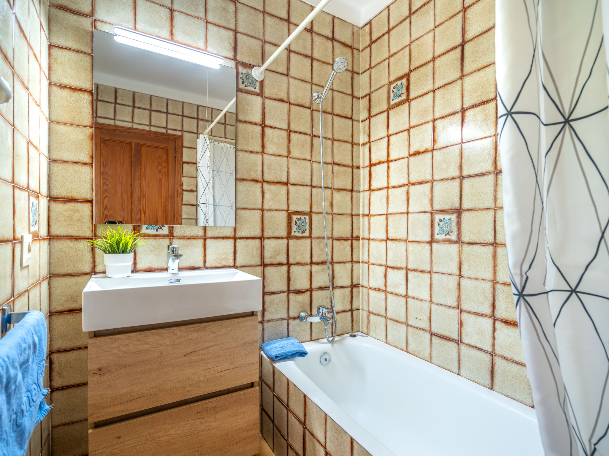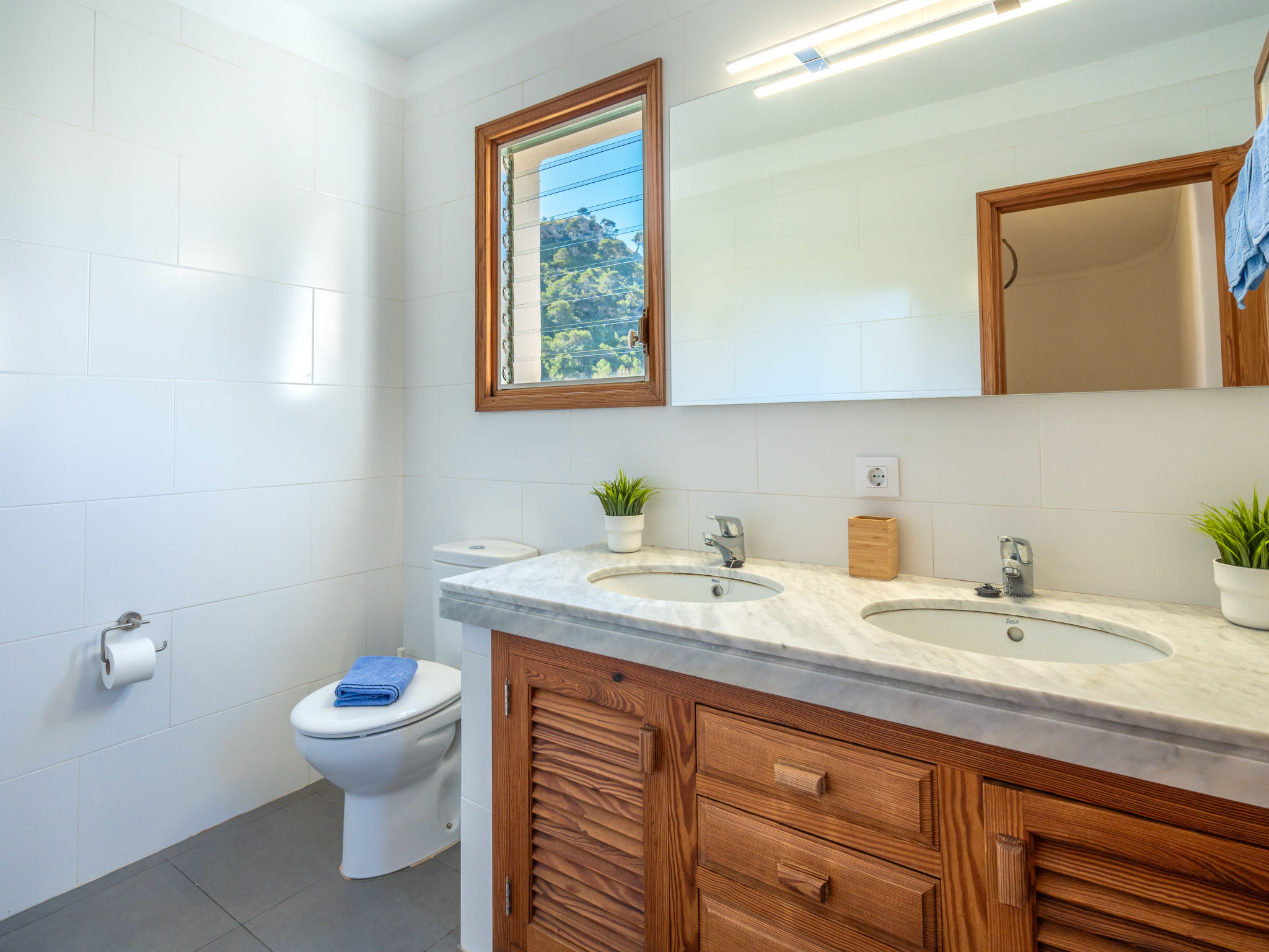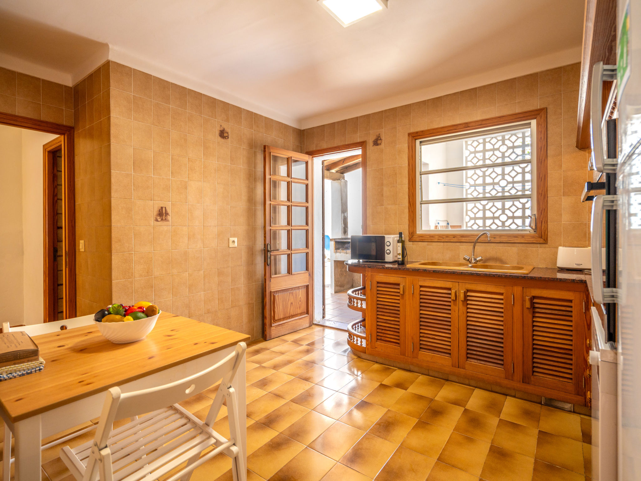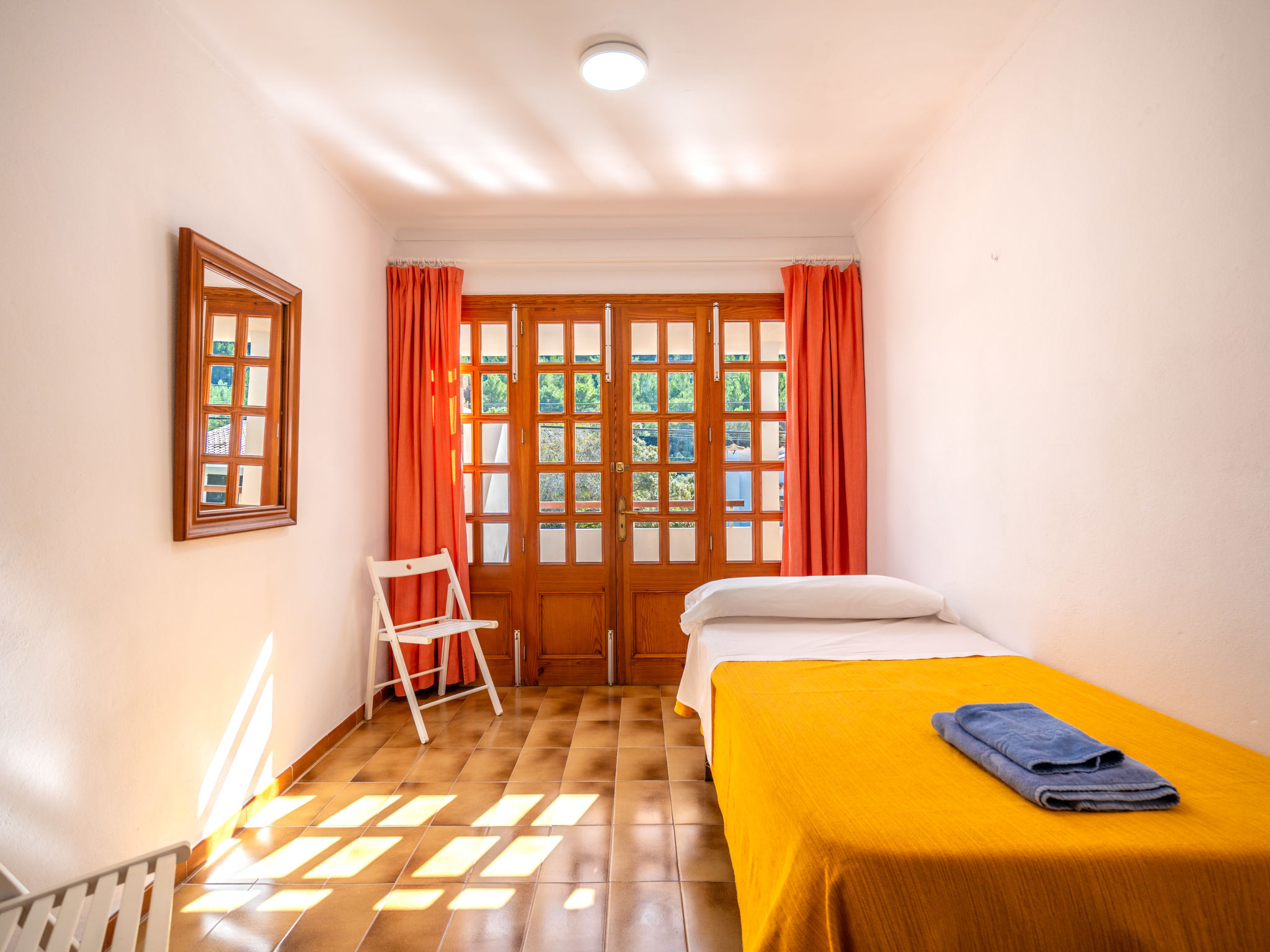 6-Zimmer-Wohnung, 2 Etagen, ca. 130 m². 1. Etage: Wohnraum mit Sitzgruppe, Kamin, Essplatz und Terrassenausgang. Küche (4 Ceranfelder, Backofen, Mikrowelle, Geschirrspüler, Kühl-/Gefrierkombination, Kaffeemaschine, Wasserkocher, Toaster), Ausgang zur Poolterrasse. Einzelzimmer, Terrassenausgang. Bad/WC. 2. Etage: 3 Zweibettzimmer, jeweils mit Terrassenausgang. Einzelzimmer. Dusche/Doppelwaschbecken/WC. VTV0006BAL