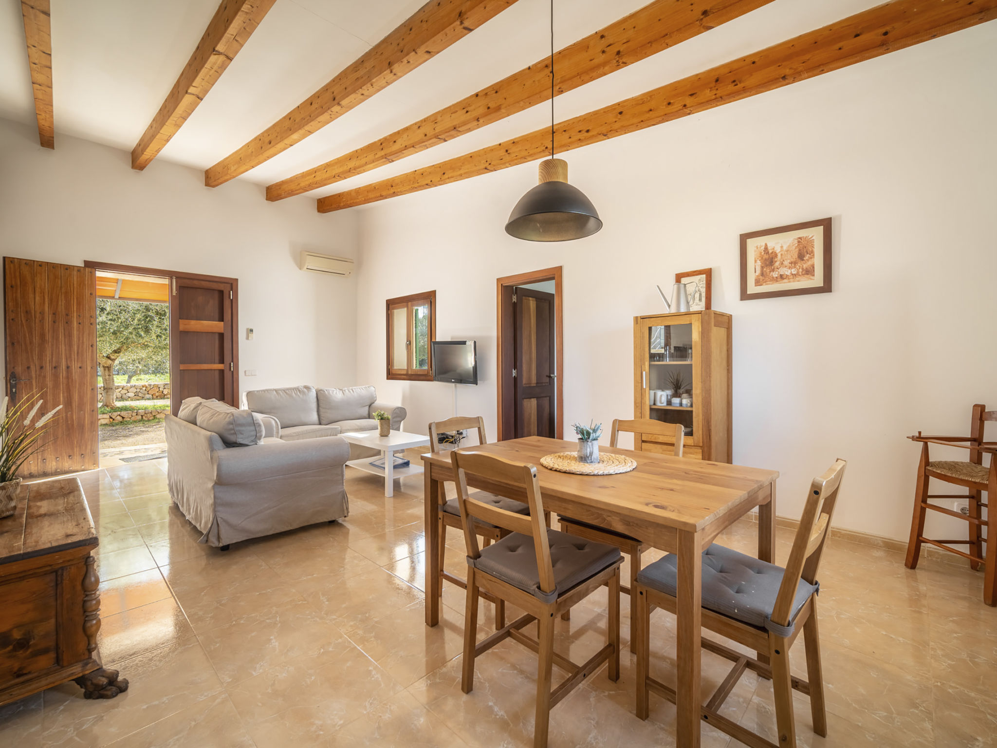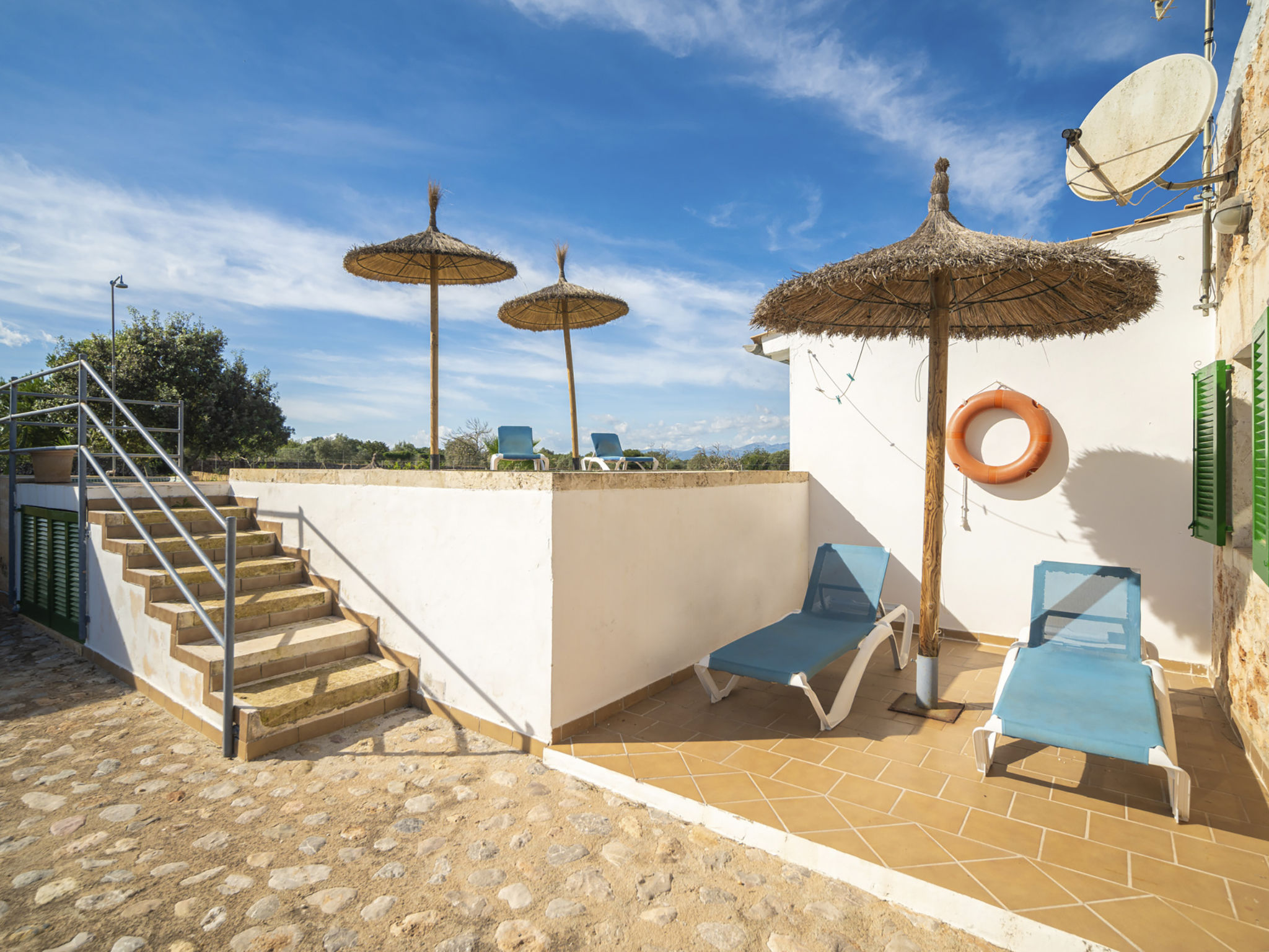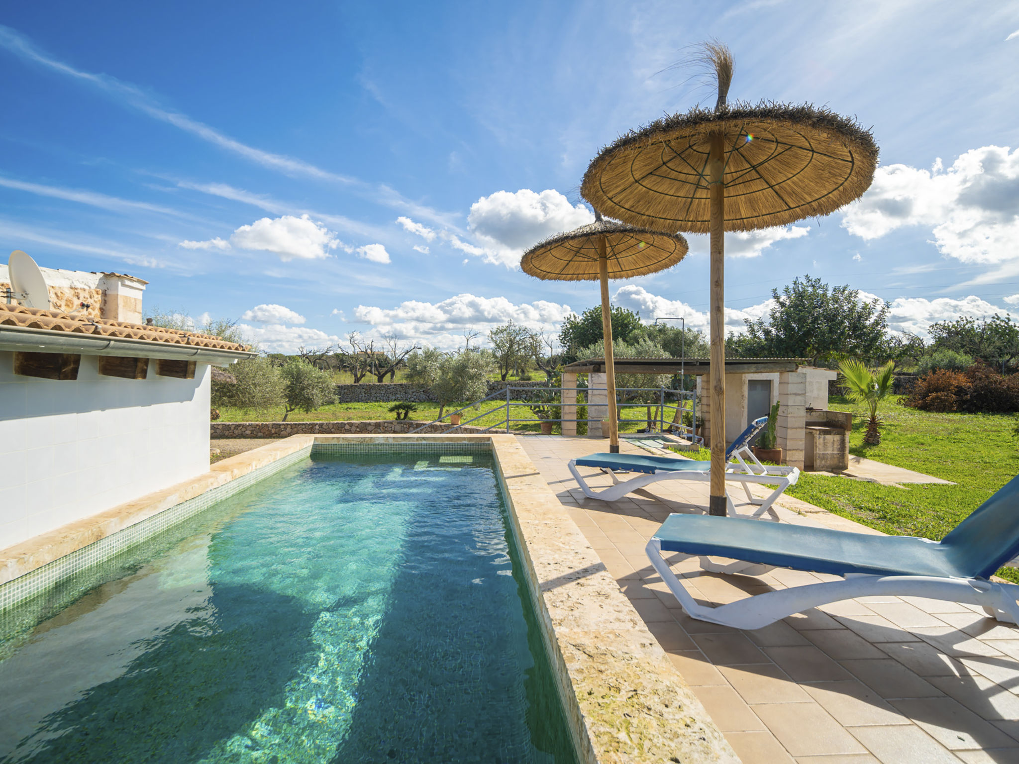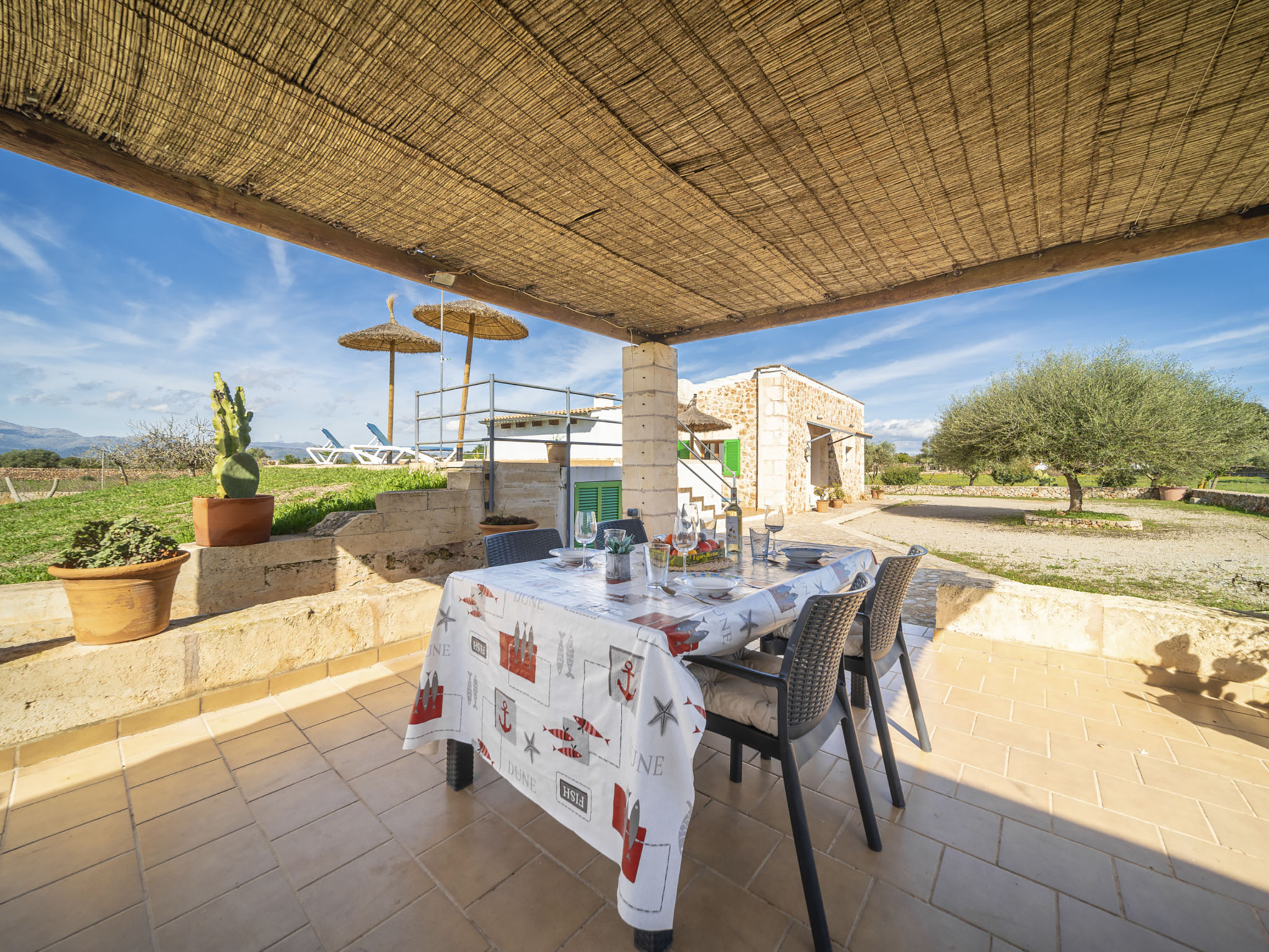 Die Naturstein-Finca steht im locker bebauten Hinterland von Ca'n Picafort (4 km). Santa Margalida 8 km. Das Haus ist von einem ca. 1500 m² großen eingezäunten, größtenteils naturbelassenen Grundstück mit Mandel- und Feigenbäumen umgeben. Neben dem Haus der erhöht liegende Pool (ca. 7 x 2,7 m, gesamte Saison geöffnet, Zugang über 7 Stufen) mit gefliester Sonnenterrasse, 4 Sonnenliegen, Sonnenschirm und Außendusche. Direkt anschließend eine kleine Rasenfläche, daneben die überdachte Terrasse (ca. 15 m²) mit Essplatz, Sonnenschirm und gemauertem Grill. Zwischen Haus und Pool weitere Terrasse (ca. 10 m²) aus Naturpflastersteinen. Parkplatz auf dem Grundstück. Gute, moderne Einrichtung. Fliesenböden. Sat-TV (deutsche Programme). Internetzugang (WLAN, € 15 pro Aufenthalt). Waschmaschine, Trockner, Bügeleisen/-brett. Klimaanlage mit Kühl-/Heizfunktion. Hinweis: Rauchen ist im Haus nicht gestattet.