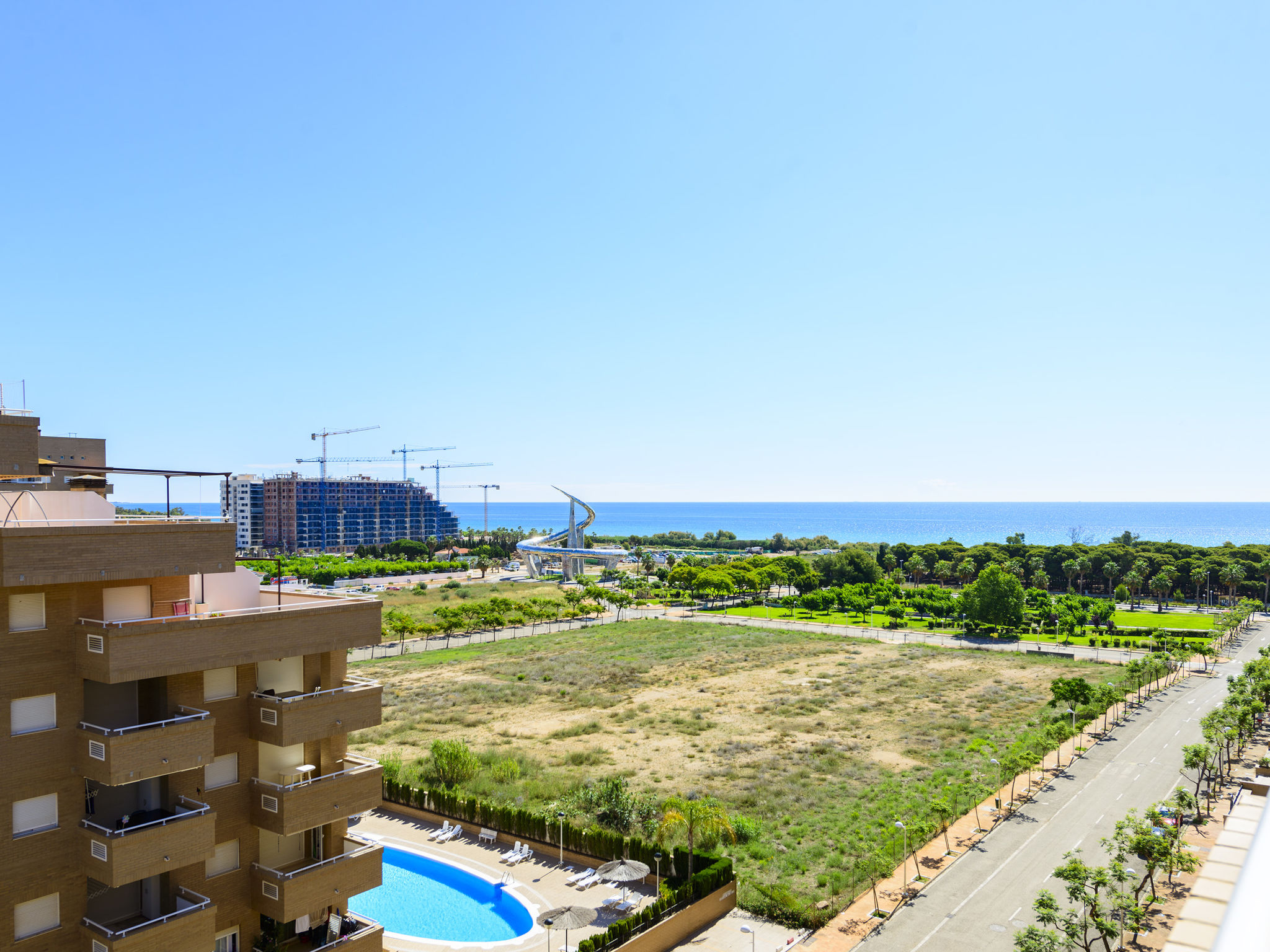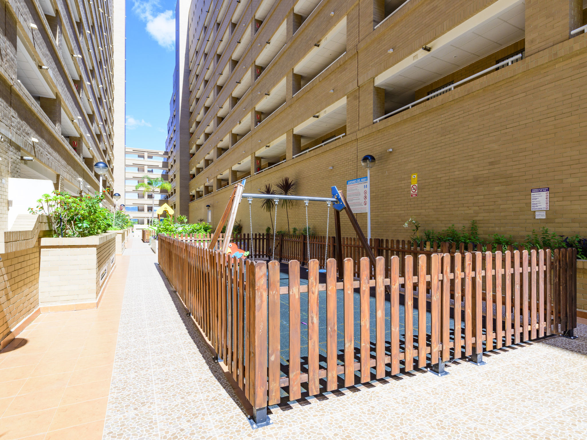 Jardines del Mar I: Gemütliches Appartementhaus "Jardines del Mar I". Am Ortsrand Oropesa del Mar, im Bezirk Marina D'Or, belebte, sonnige Lage, 300 m vom Meer, 300 m vom Strand, an einer Hauptstrasse. Zur Mitbenutzung: Schwimmbad (20 x 10 m, 70 - 230 cm tief, saisonale Verfügbarkeit: 01.Mai.-01.Okt.). Im Hause: Fahrstuhl. Supermarkt 1 km, Restaurant 400 m, Bahnstation 4 km, Sandstrand 400 m. Bitte beachten: geeignet für Familien, geeignet für Senioren. Autobahn 900 m vom Haus. Hauptstrasse 300 m vom Haus. Eisenbahnlinie 3 km vom Haus. Nacht Club/Disco 300 m vom Haus.