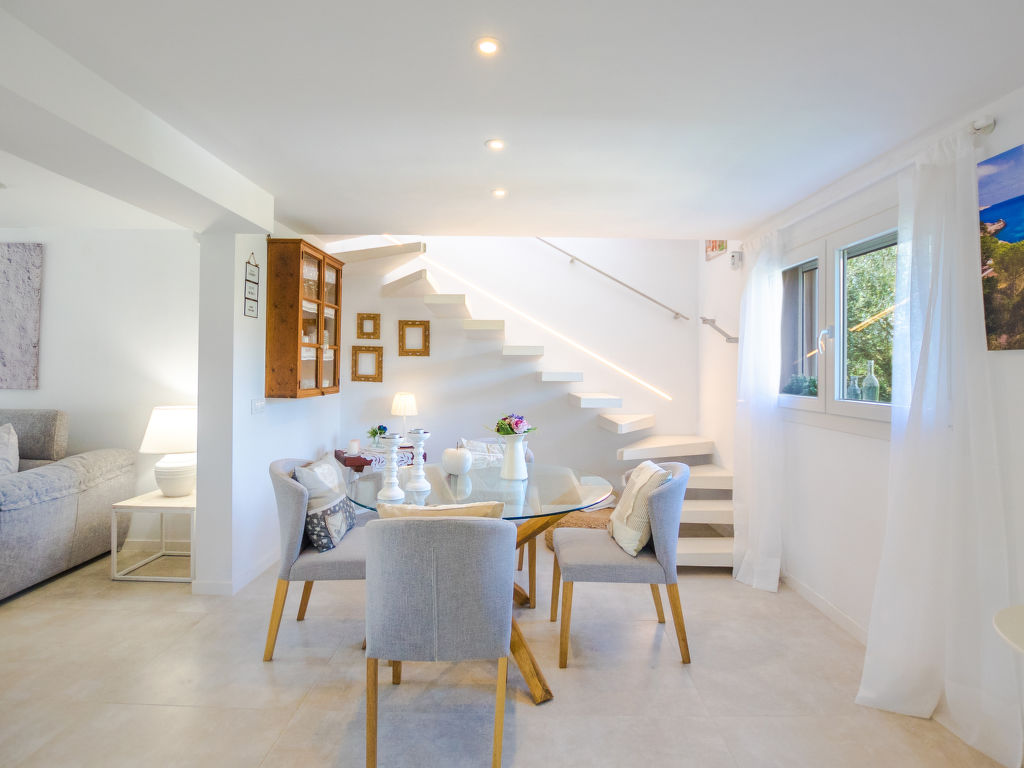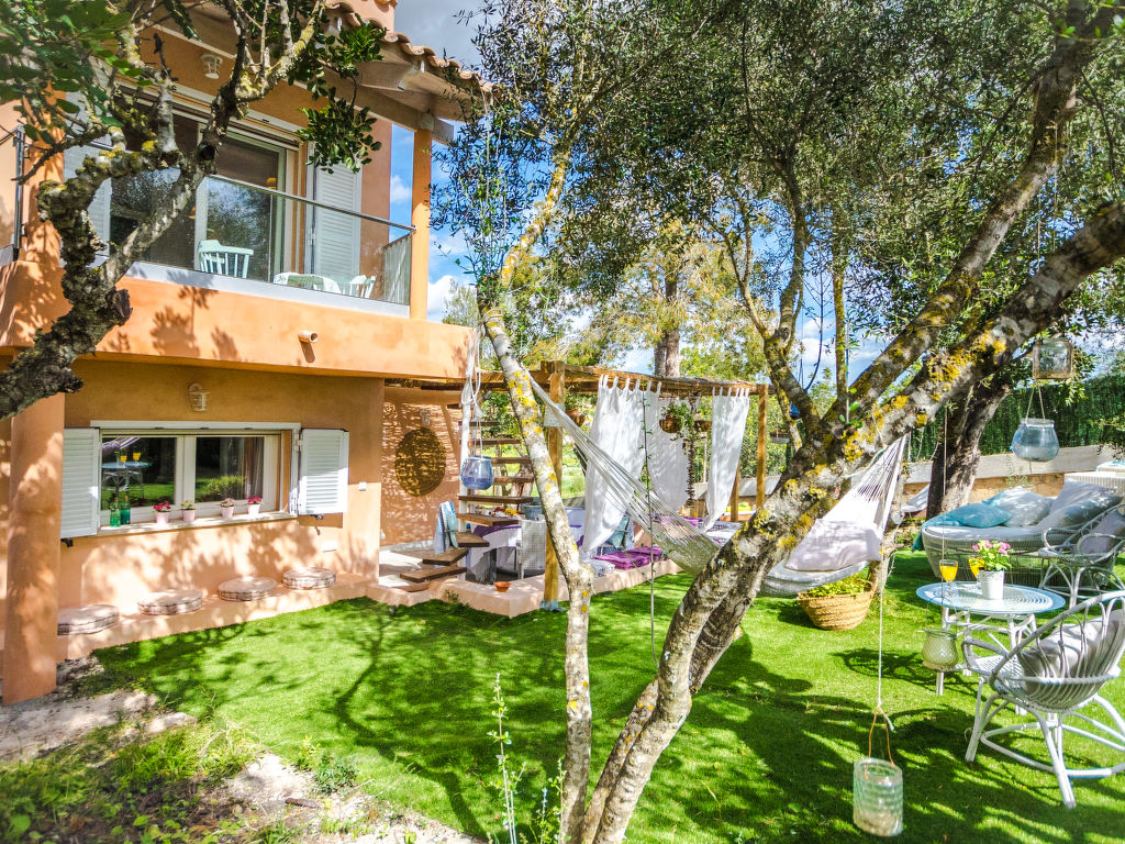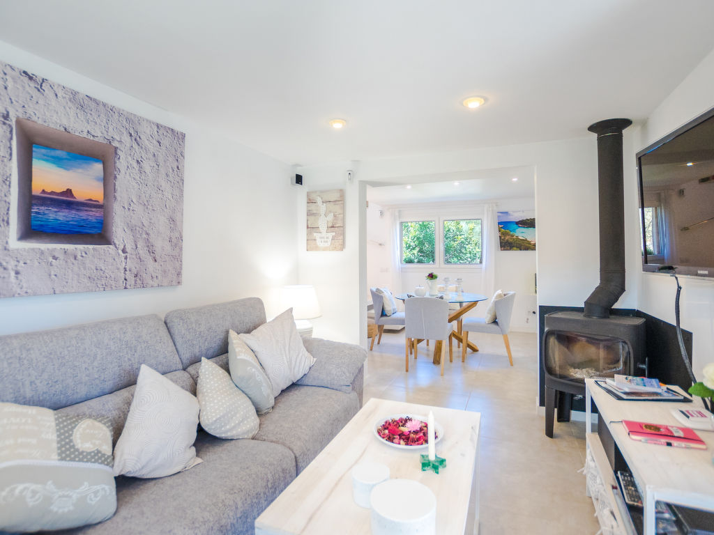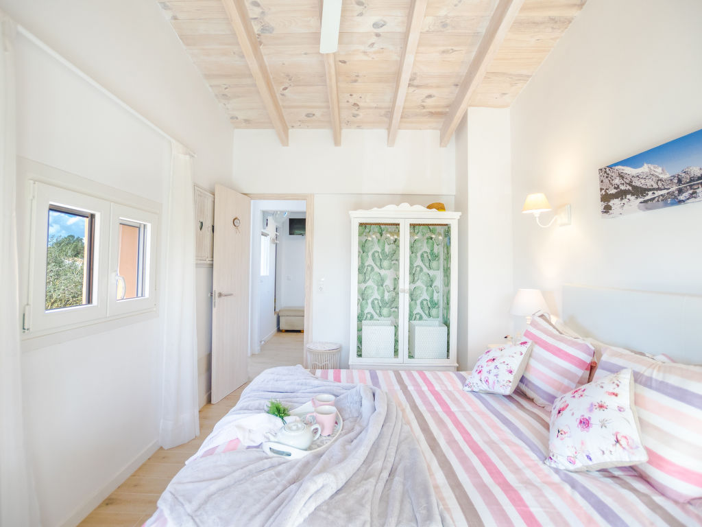 "Sa Font", 3-Zimmer-Haus 80 m2 auf 2 Stockwerken. Objekt geeignet für 4 Erwachsene. Vollständig renoviert, sehr gemütlich und romantisch eingerichtet: offenes Wohn-/Esszimmer mit Schiebetür, Panoramafenster mit offenem Kamin, TV und Flachbildschirm. Ausgang zum Gartensitzplatz. Offene Küche (Backofen, Geschirrspüler, 3 Glaskeramikherd Platten, Toaster, Wasserkocher, Mikrowelle, Tiefkühler, elektrische Kaffeemaschine). Ausgang zum Gartensitzplatz. Bad/Dusche/WC. Obergeschoss: 1 Doppelzimmer mit Schiebetür mit 1 franz. Bett (150 cm), Ventilator. Ausgang zum Balkon. 1 Doppelzimmer mit Panoramafenster mit 1 franz. Bett (135 cm), Ventilator. Bad/Dusche/WC. Balkon, Gartensitzplatz, Laube. Terrassenmöbel, Balkonmöbel, Gartengrill, Liegestühle. Sicht auf die Berge und die Landschaft. Zur Verfügung: Waschmaschine, Bügeleisen, Fliegengitter, Haartrockner. Internet (Wireless LAN, gratis). Parkplatz (eingezäunt). Geeignet für Familien. 1 Haustier/Hund erlaubt. ETV9259