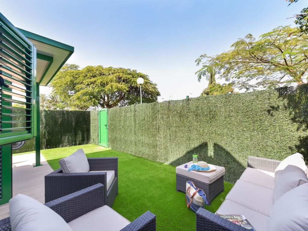 Schöner, einfacher Bungalow "Cozy Bungalow Playa Flor II Maspalomas". Hausausstattung: Klimaanlage, Solarium, Waschmaschine (zur Alleinbenutzung). Zufahrt & Parkmöglichkeiten: auf der Strasse. Ganzjährig Zufahrt bis zum Haus möglich. Lage: im Ortszentrum von Maspalomas, ruhige, belebte, sonnige Lage. Aussicht von der Wohnung auf den Garten. Umgebung des Hauses: Garten (zur Alleinbenutzung), Swimming Pool (zur Mitbenutzung).