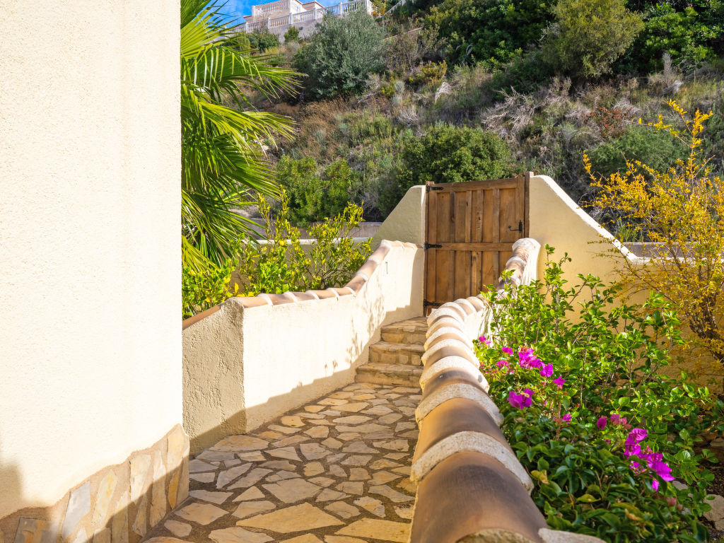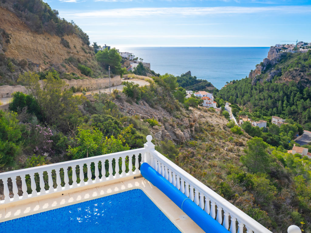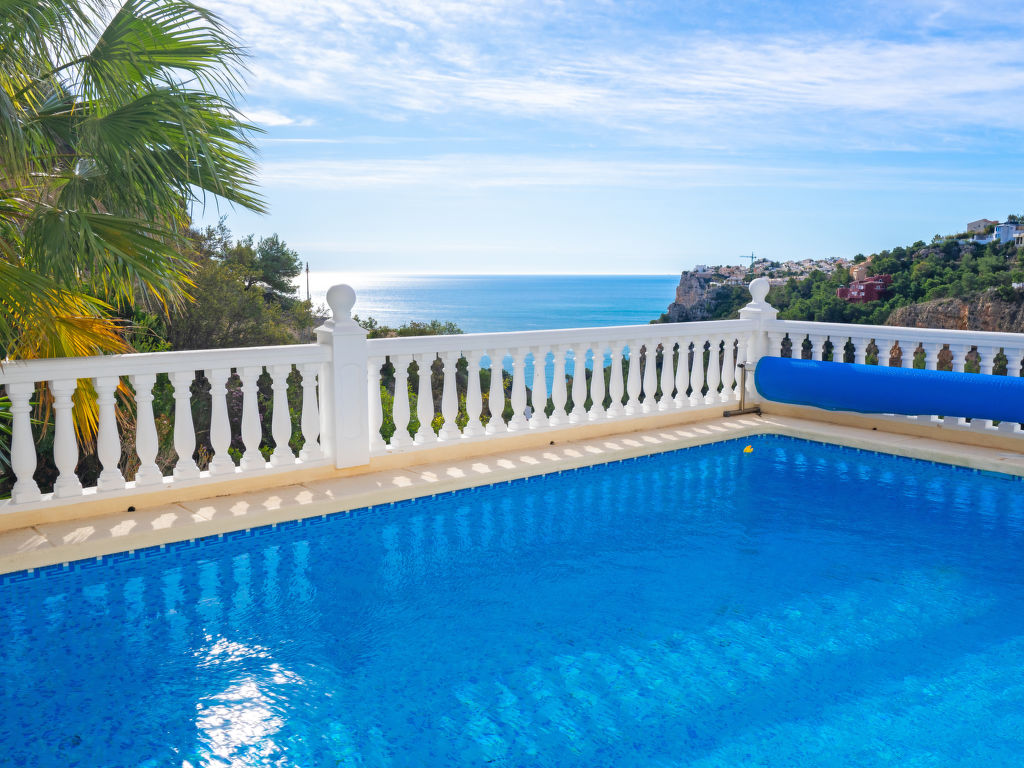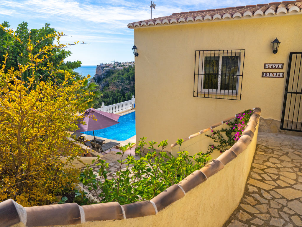 Cumbre del Sol: Schöne Villa "Rioja", auf 2 Stockwerken. Im Ort, 8.9 km vom Zentrum von Moraira, 12.8 km vom Zentrum von Javea, ruhige, sonnige Lage auf einem Hügel, im Villenviertel, verkehrsberuhigte Zone, 1.3 km vom Meer, 1.3 km vom Strand, in einer Sackgasse. Zur Alleinbenutzung: Grundstück 1'200 m2 (eingezäunt), Schwimmbad (8 x 4 m, 01.01.-31.12.). Aussendusche. Im Hause: Waschmaschine. Lebensmittelgeschäft 1.3 km, Supermarkt 1.3 km, Restaurant 1.2 km, Bar 1.2 km, Steinstrand "Cala Moraig" 1.3 km. Sporthafen 9.4 km, Jacht-Hafen 9.4 km, Golfplatz 12 km. Nahe gelegene Sehenswürdigkeiten: Aqualandia, Mundomar, Terra Mítica, Terra Natura, Benidorm Palace (Benidorm), Castillo de Guadalest, Les Fonts de l'Algar.