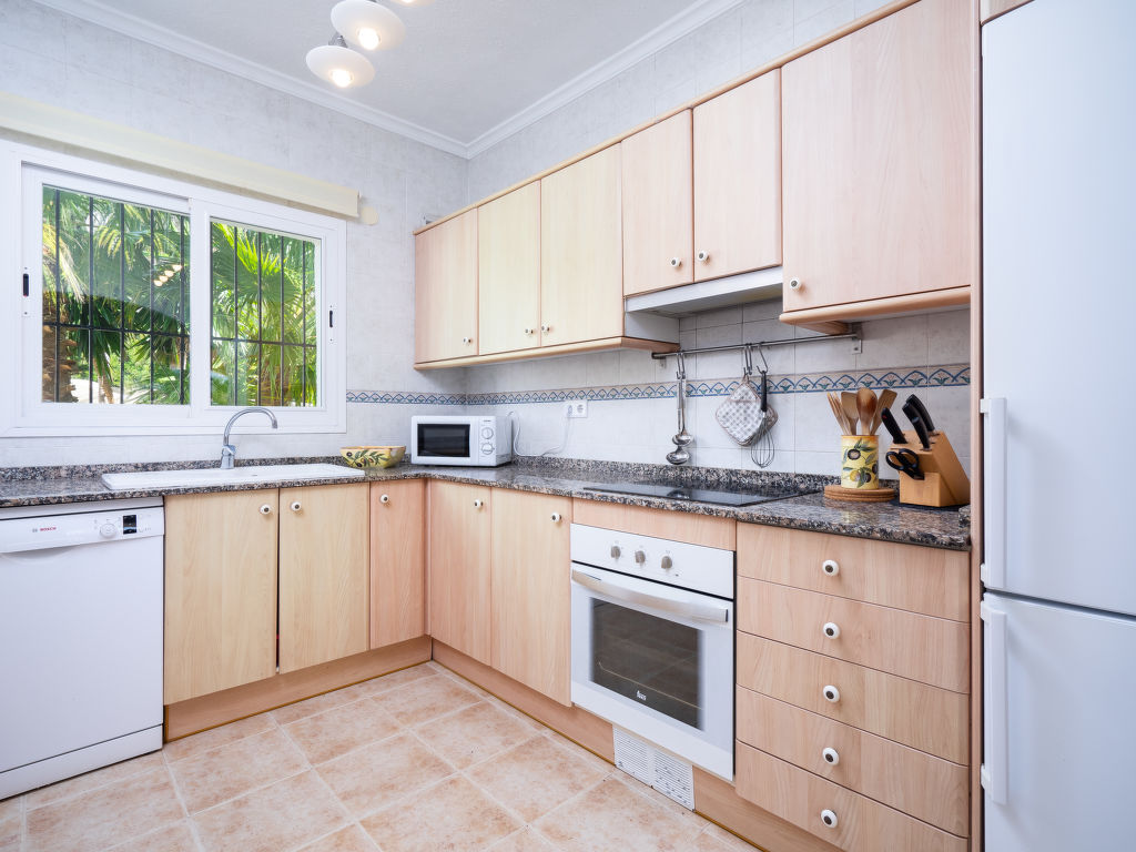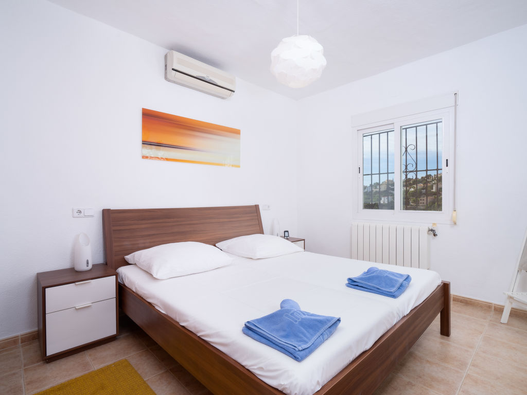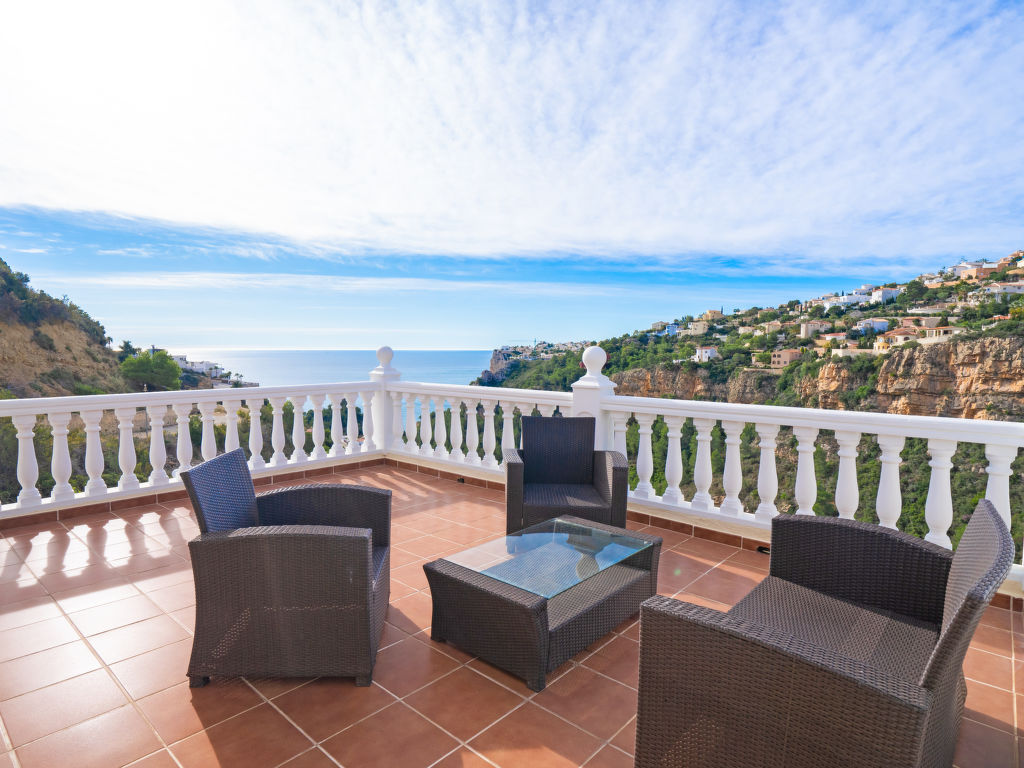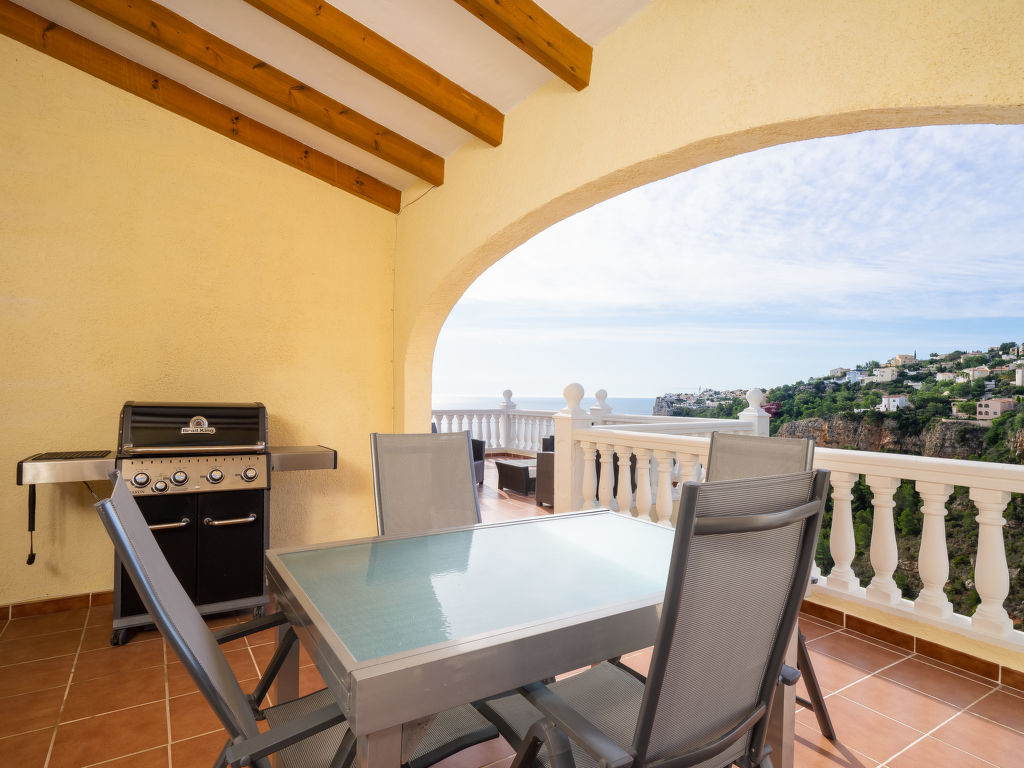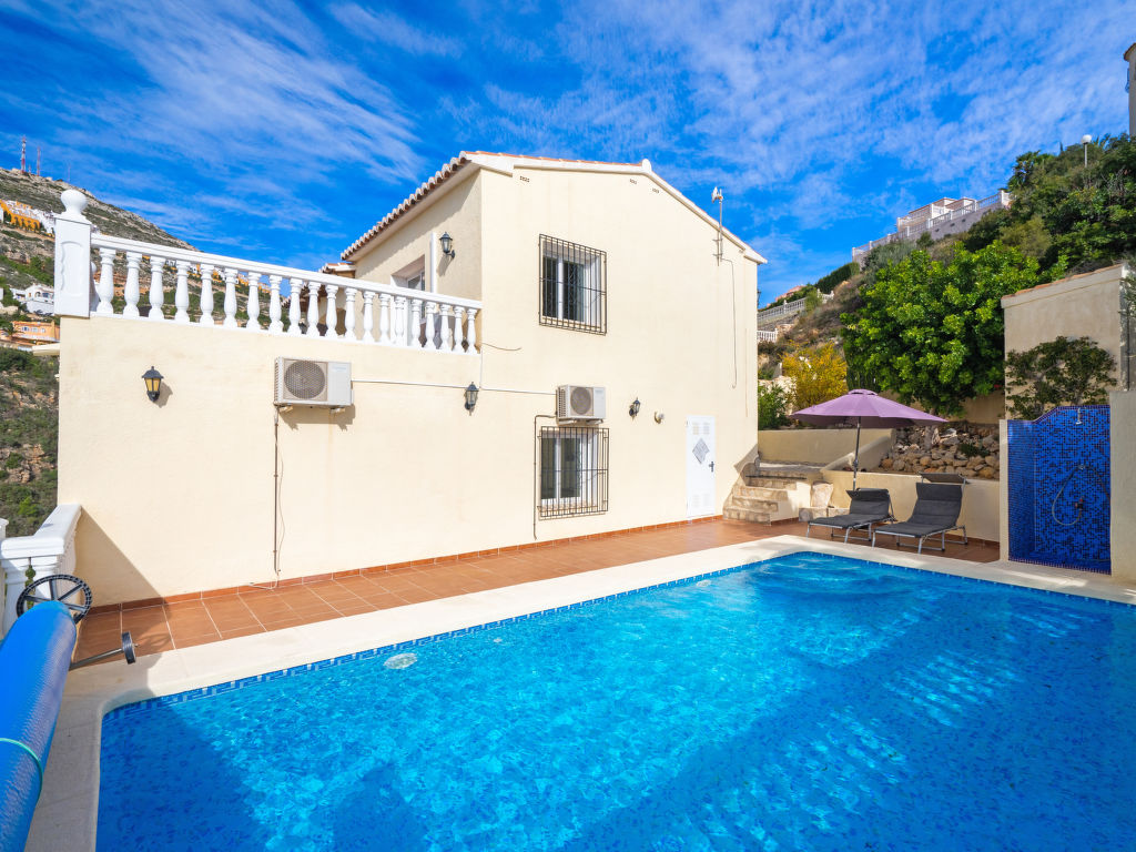 Cumbre del Sol: Schöne Villa "Rioja", auf 2 Stockwerken. Im Ort, 8.9 km vom Zentrum von Moraira, 12.8 km vom Zentrum von Javea, ruhige, sonnige Lage auf einem Hügel, im Villenviertel, verkehrsberuhigte Zone, 1.3 km vom Meer, 1.3 km vom Strand, in einer Sackgasse. Zur Alleinbenutzung: Grundstück 1'200 m2 (eingezäunt), Schwimmbad (8 x 4 m, 01.01.-31.12.). Aussendusche. Im Hause: Waschmaschine. Lebensmittelgeschäft 1.3 km, Supermarkt 1.3 km, Restaurant 1.2 km, Bar 1.2 km, Steinstrand "Cala Moraig" 1.3 km. Sporthafen 9.4 km, Jacht-Hafen 9.4 km, Golfplatz 12 km. Nahe gelegene Sehenswürdigkeiten: Aqualandia, Mundomar, Terra Mítica, Terra Natura, Benidorm Palace (Benidorm), Castillo de Guadalest, Les Fonts de l'Algar.