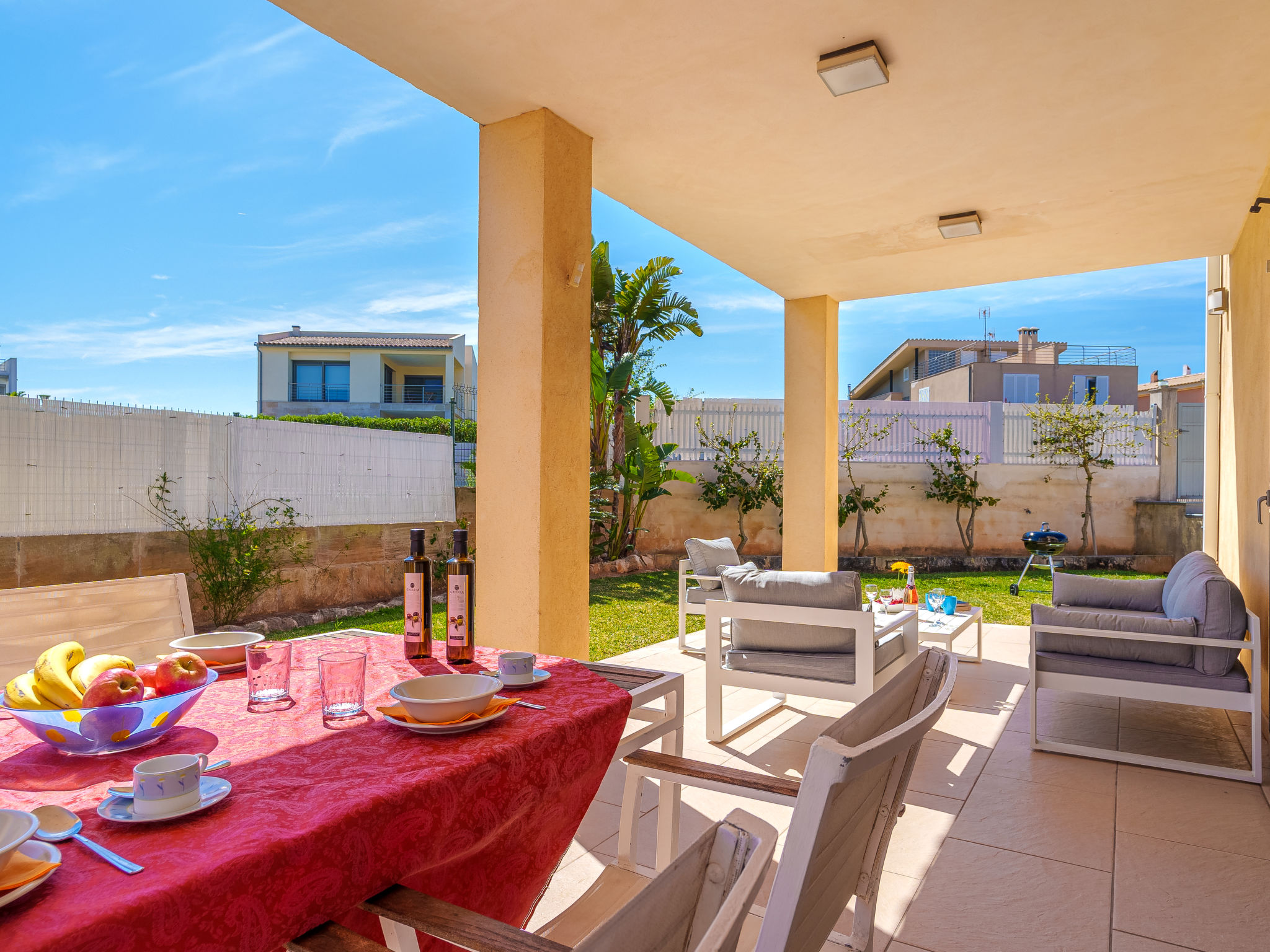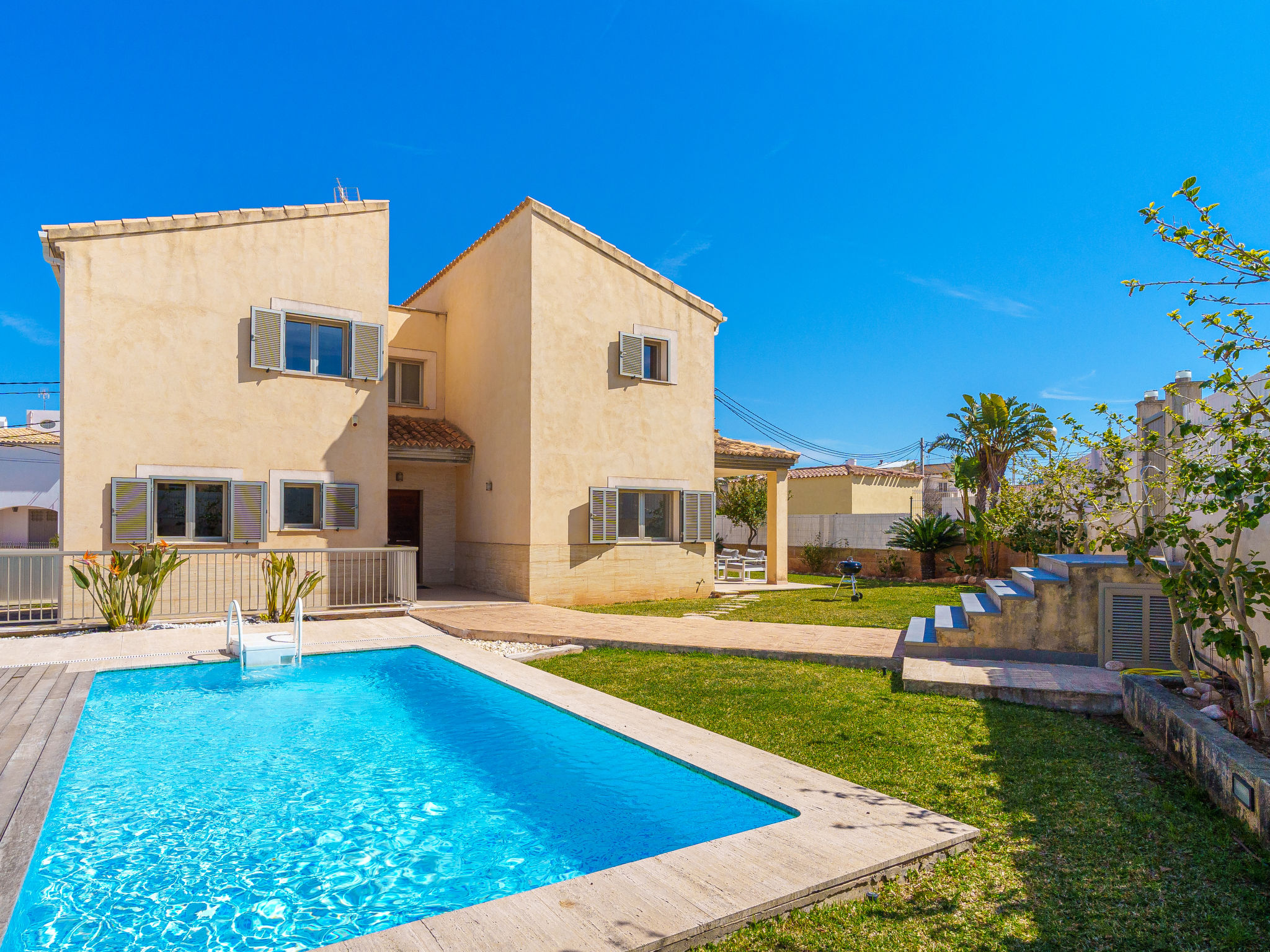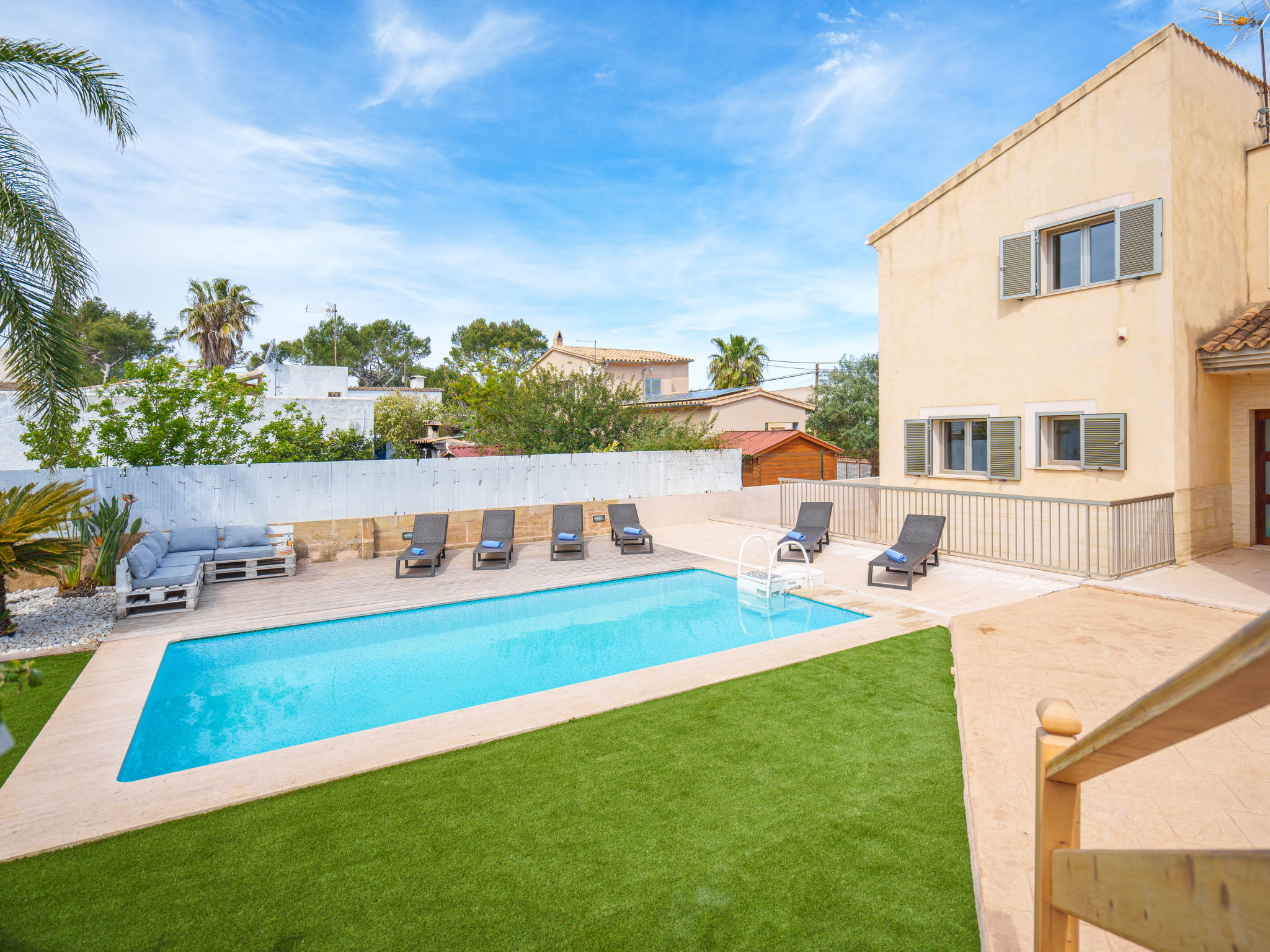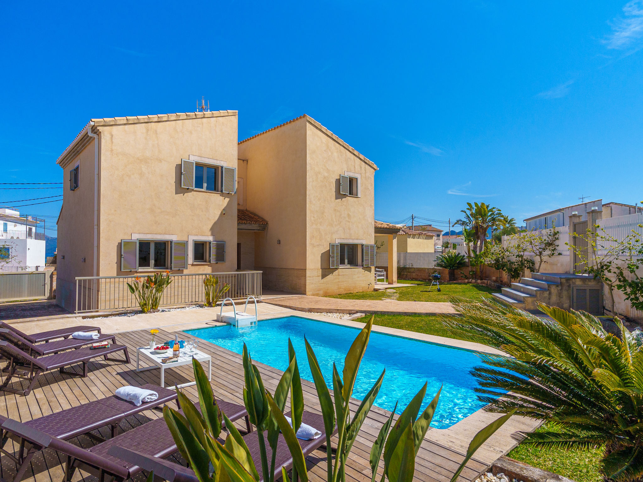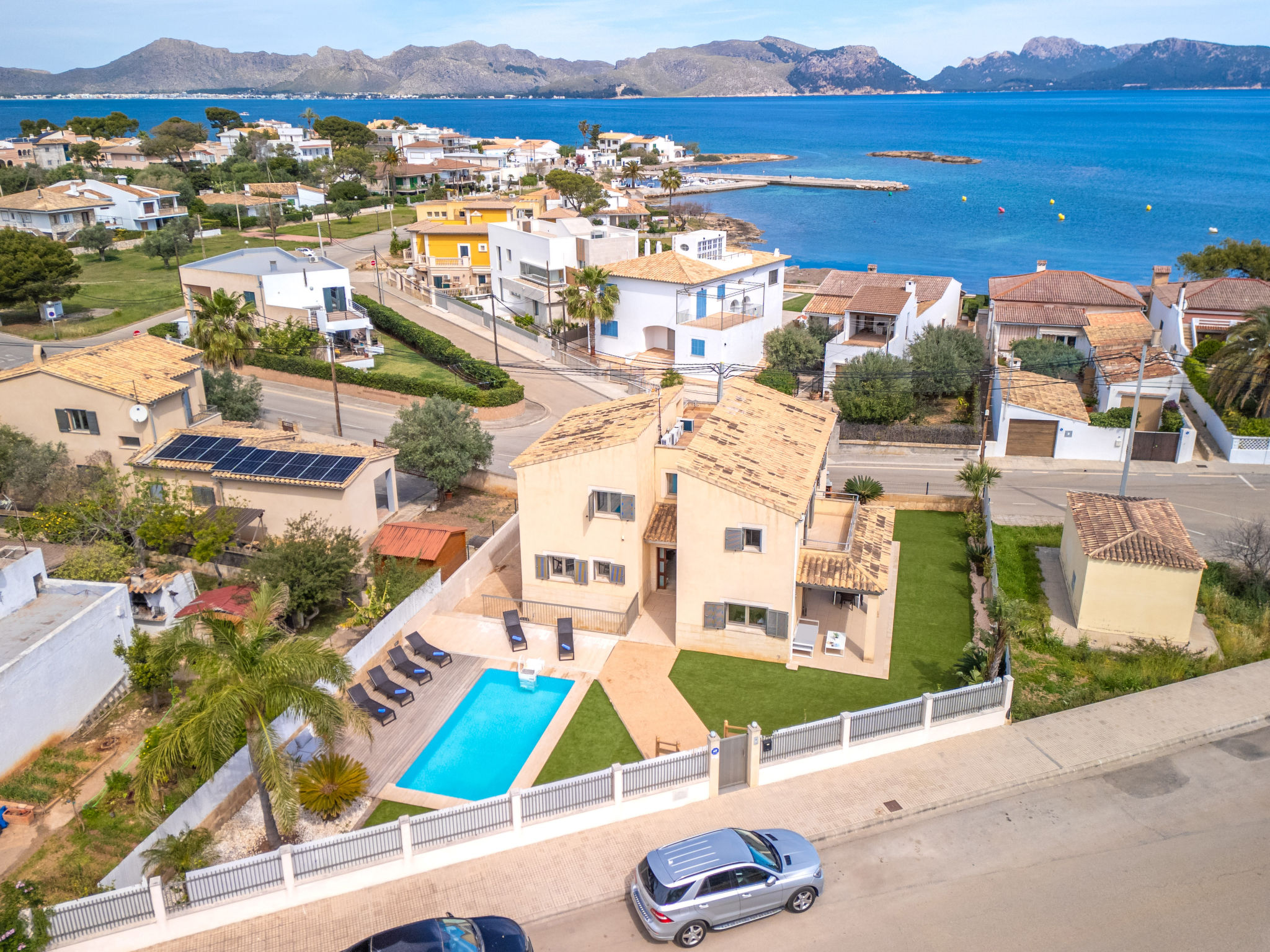 Barcarés 1 km von Alcúdia: Sehr grosse, sehr moderne, alleinstehende Villa "Son Jil", auf 2 Stockwerken, Baujahr 2005. Ruhige, sonnige Lage im Villenviertel, 2 km vom Waldrand, 60 m vom Meer, Strasse zu überqueren. Zur Alleinbenutzung: grosser, gepflegter Garten mit Rasen und Pflanzen, Schwimmbad eckig (8 x 4 m, 150 - 150 cm tief, 01.01.-31.12.) mit Salzelektrolyse-Reinigungssystem. Aussendusche, Sitzplatz, Laube, Pergola, Gartenmöbel, Grill. Im Hause: Internetzugang, Wireless LAN, Zentralheizung, Klimaanlage, Waschmaschine. Parkplatz beim Haus auf dem Grundstück, öffentliches Parkhaus, öffentliche Parkplätze auf der Strasse. Einkaufsgeschäft 1 km, Supermarkt 1.2 km, Einkaufszentrum 45 km, Restaurant, Bar 160 m, Fußgängerzone 50 m, Zentrum zu Fuss in 15 Minuten erreichbar, Bushaltestelle 1.5 km, Fähre 3 km, Sandstrand "Platja Es Morer Vermell" 550 m, Felsstrand "Platja Es Barcarés" 60 m. Sporthafen 250 m, Jacht-Hafen 3 km, Golfplatz (18 Loch) 6 km, Tennis 2.5 km, Reitstall 2.5 km, Sportzentrum 2.5 km, Wanderwege ab Haus 1 km, Radweg 700 m, Kinderspielplatz 500 m. Nahe gelegene Sehenswürdigkeiten: Ermita de la Victoria, Barcarés, Manresa, Sa Marina, Es Malpas. Ciutat Romana de Pollentia, Alcudia. Port d'Alcúdia, Port de Pollença - Pollença, North Beaches. Wandergebiete: Sa Talaia, Es Puig de Sant Martí, Serra Tramuntana Pollença. Bitte beachten: geeignet für Familien, geeignet für Senioren. Objekt geeignet für 8 Erwachsene Jugendgruppen nur auf Anfrage. Flugplatz 60 km vom Haus.