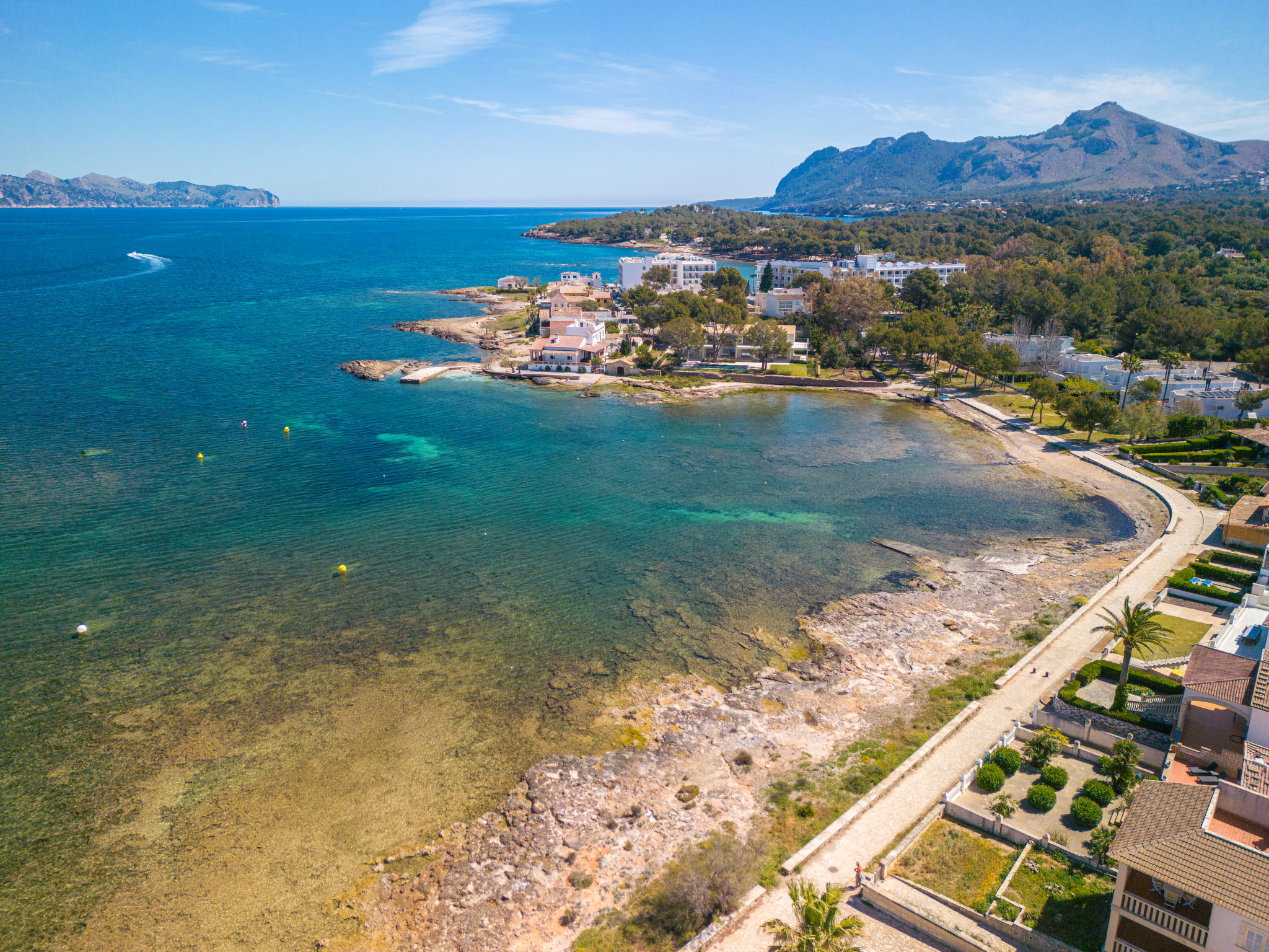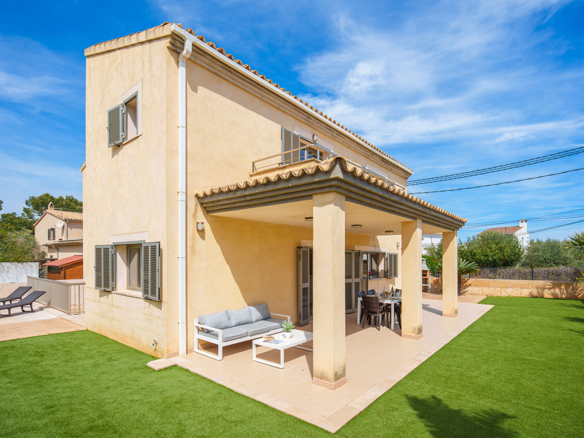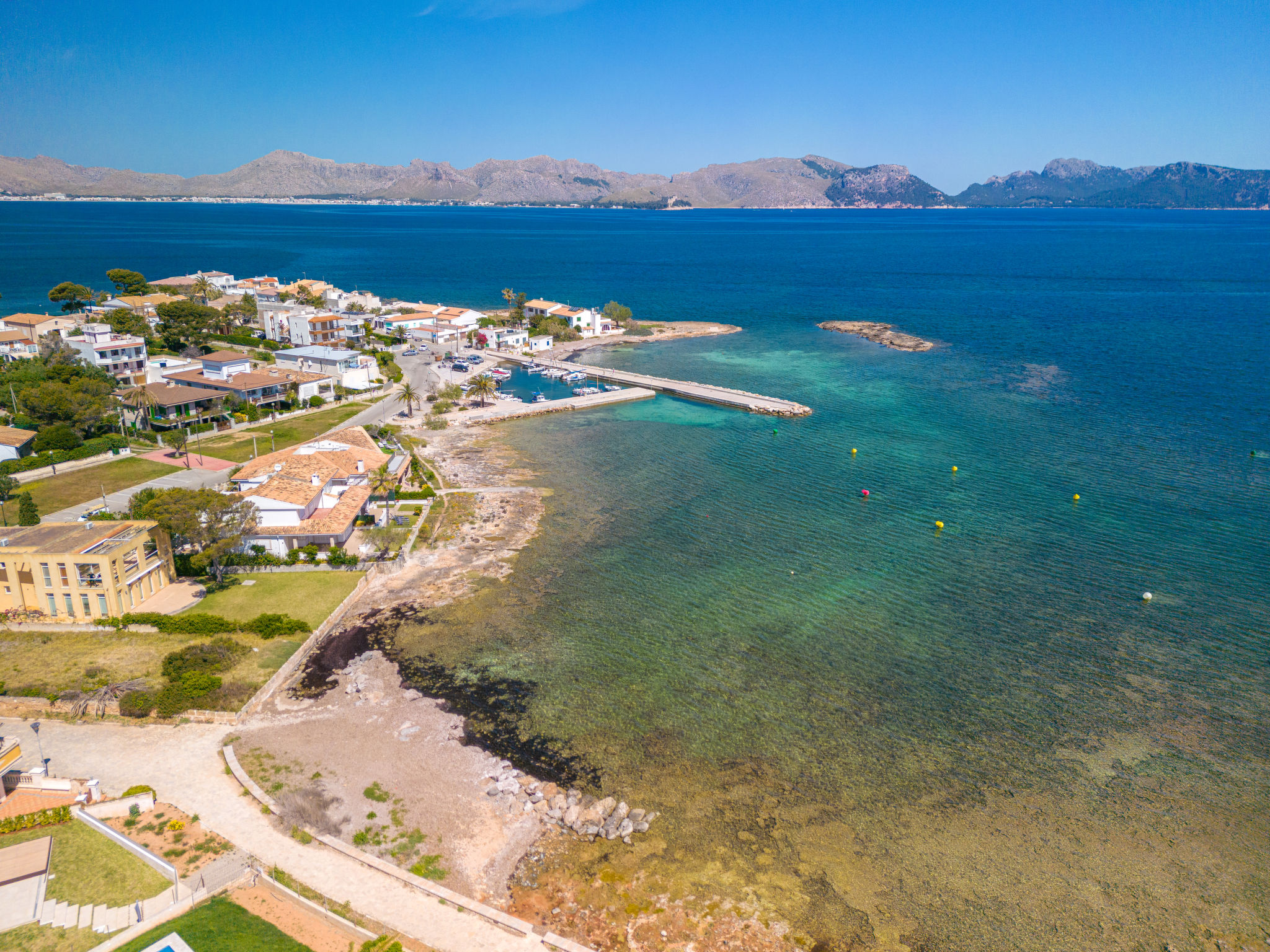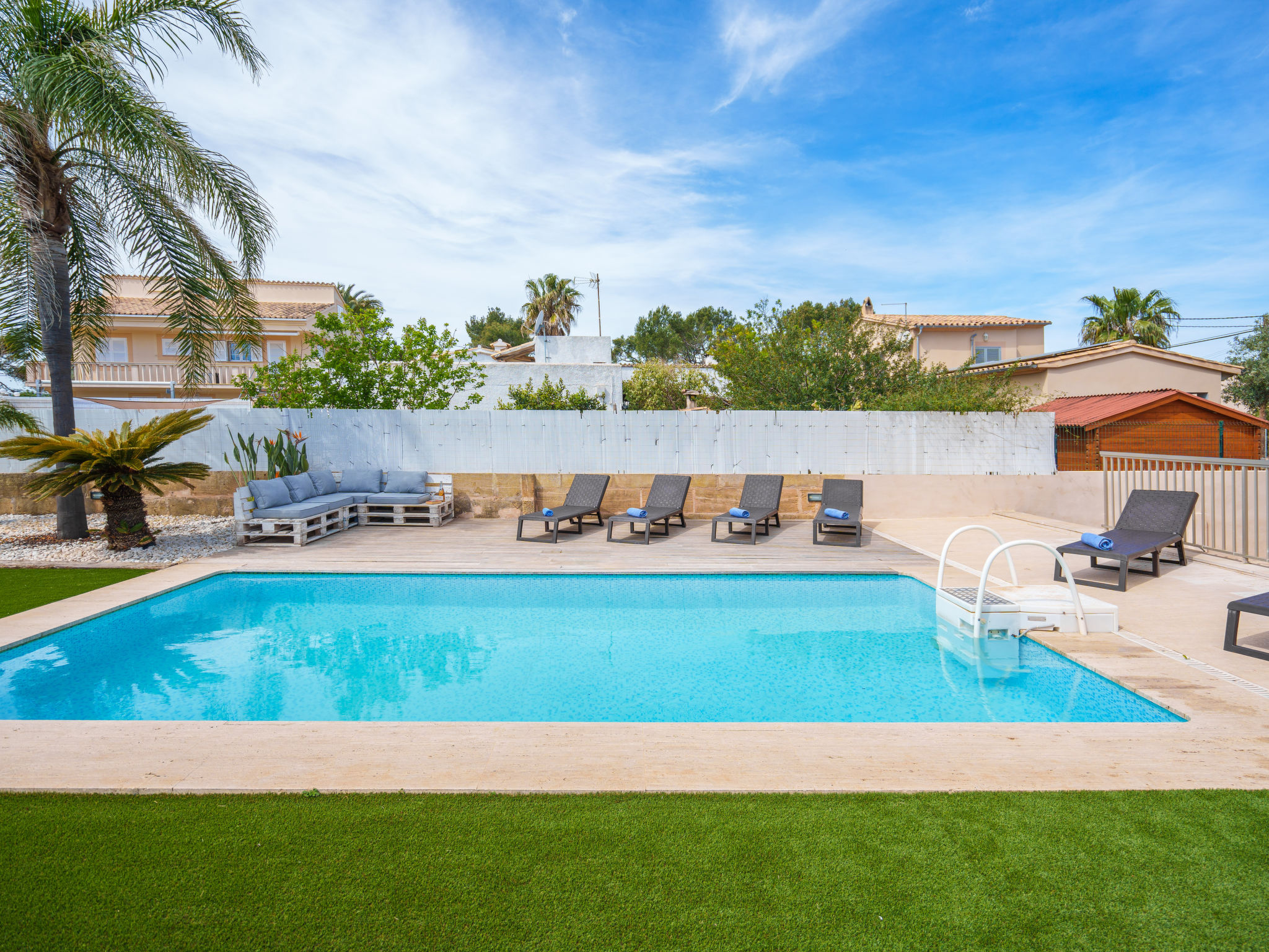 Barcarés 1 km von Alcúdia: Sehr grosse, sehr moderne, alleinstehende Villa "Son Jil", auf 2 Stockwerken, Baujahr 2005. Ruhige, sonnige Lage im Villenviertel, 2 km vom Waldrand, 60 m vom Meer, Strasse zu überqueren. Zur Alleinbenutzung: grosser, gepflegter Garten mit Rasen und Pflanzen, Schwimmbad eckig (8 x 4 m, 150 - 150 cm tief, 01.01.-31.12.) mit Salzelektrolyse-Reinigungssystem. Aussendusche, Sitzplatz, Laube, Pergola, Gartenmöbel, Grill. Im Hause: Internetzugang, Wireless LAN, Zentralheizung, Klimaanlage, Waschmaschine. Parkplatz beim Haus auf dem Grundstück, öffentliches Parkhaus, öffentliche Parkplätze auf der Strasse. Einkaufsgeschäft 1 km, Supermarkt 1.2 km, Einkaufszentrum 45 km, Restaurant, Bar 160 m, Fußgängerzone 50 m, Zentrum zu Fuss in 15 Minuten erreichbar, Bushaltestelle 1.5 km, Fähre 3 km, Sandstrand "Platja Es Morer Vermell" 550 m, Felsstrand "Platja Es Barcarés" 60 m. Sporthafen 250 m, Jacht-Hafen 3 km, Golfplatz (18 Loch) 6 km, Tennis 2.5 km, Reitstall 2.5 km, Sportzentrum 2.5 km, Wanderwege ab Haus 1 km, Radweg 700 m, Kinderspielplatz 500 m. Nahe gelegene Sehenswürdigkeiten: Ermita de la Victoria, Barcarés, Manresa, Sa Marina, Es Malpas. Ciutat Romana de Pollentia, Alcudia. Port d'Alcúdia, Port de Pollença - Pollença, North Beaches. Wandergebiete: Sa Talaia, Es Puig de Sant Martí, Serra Tramuntana Pollença. Bitte beachten: geeignet für Familien, geeignet für Senioren. Objekt geeignet für 8 Erwachsene Jugendgruppen nur auf Anfrage. Flugplatz 60 km vom Haus.