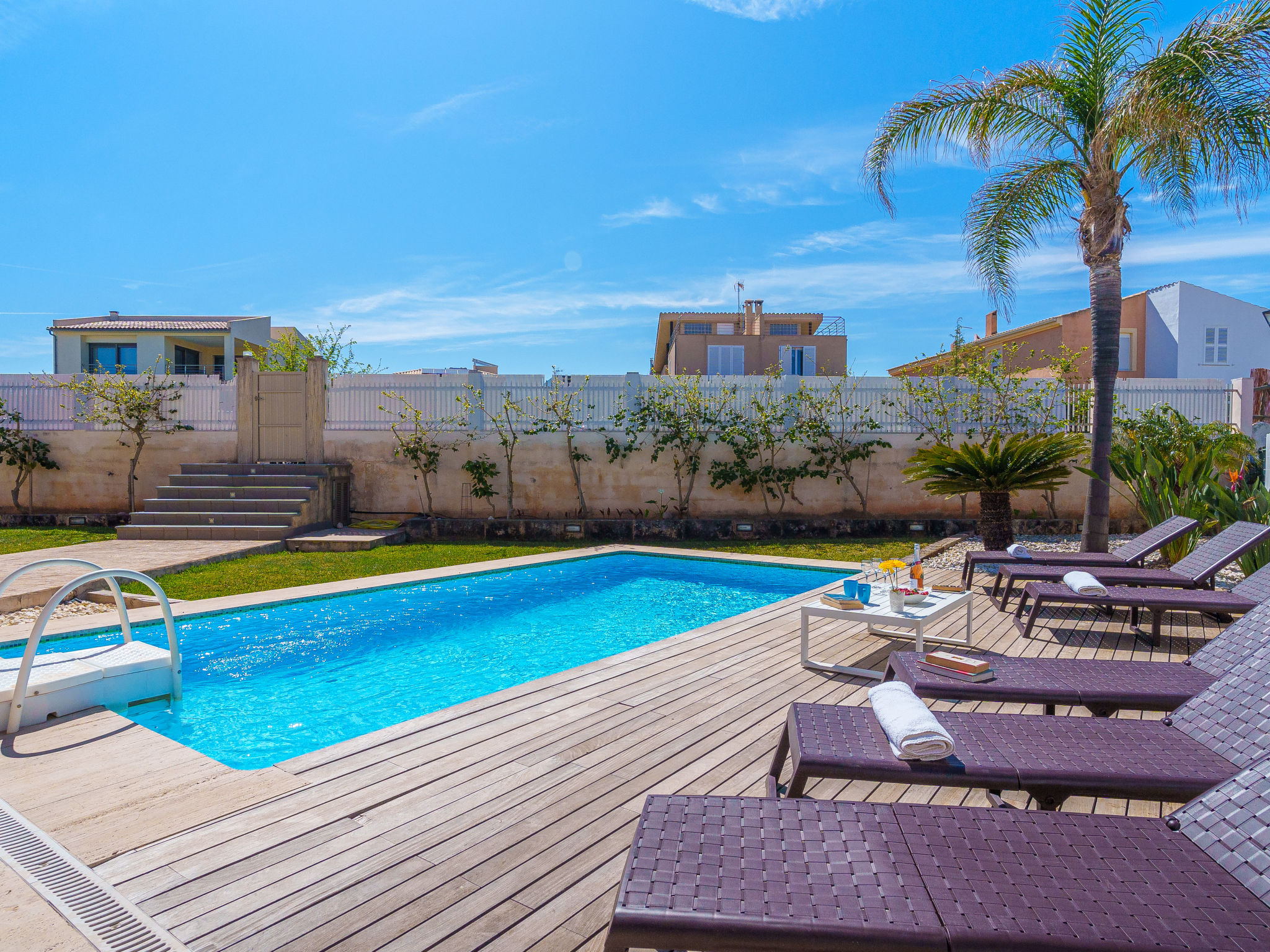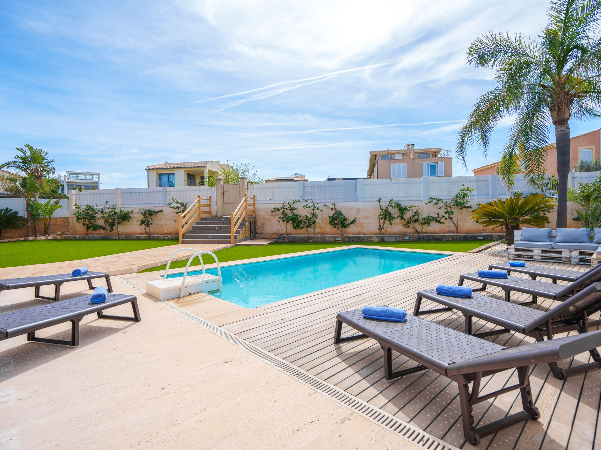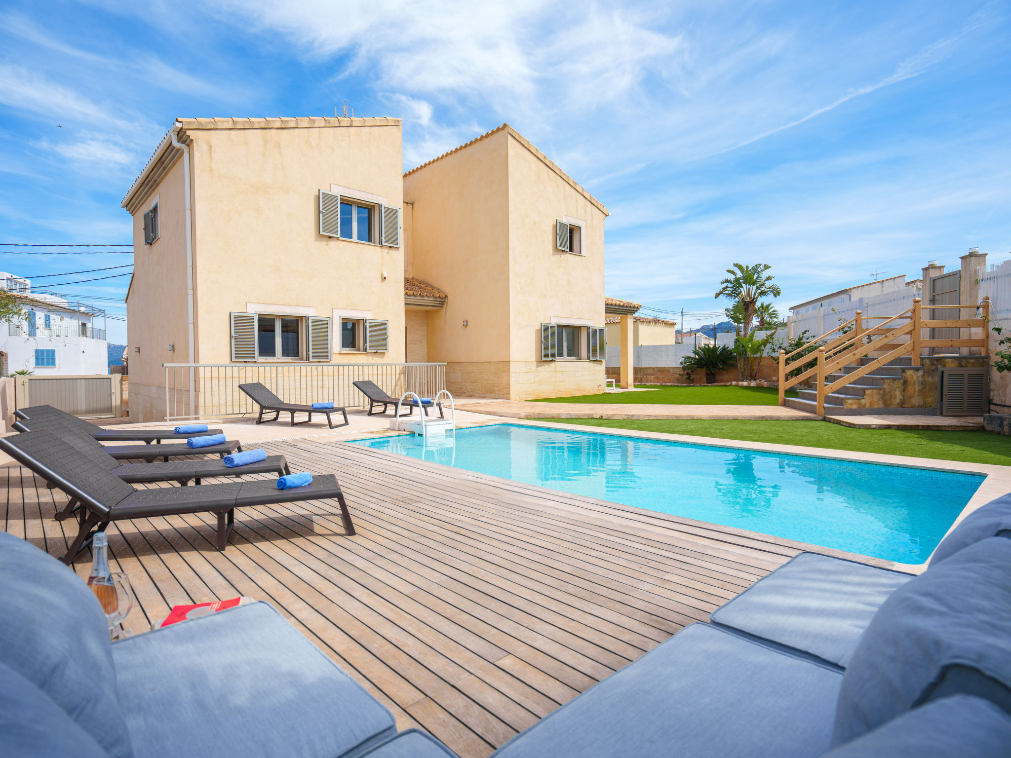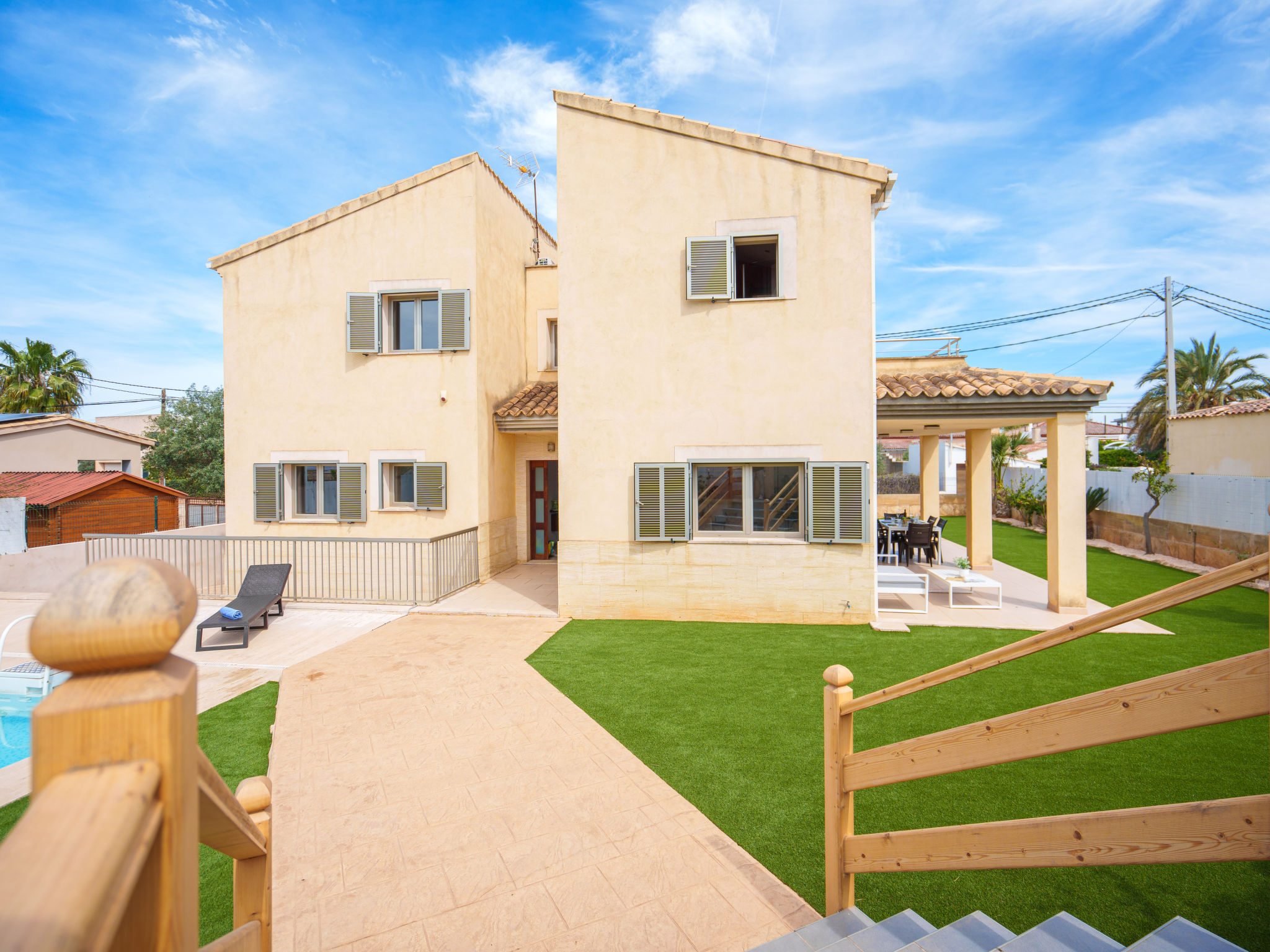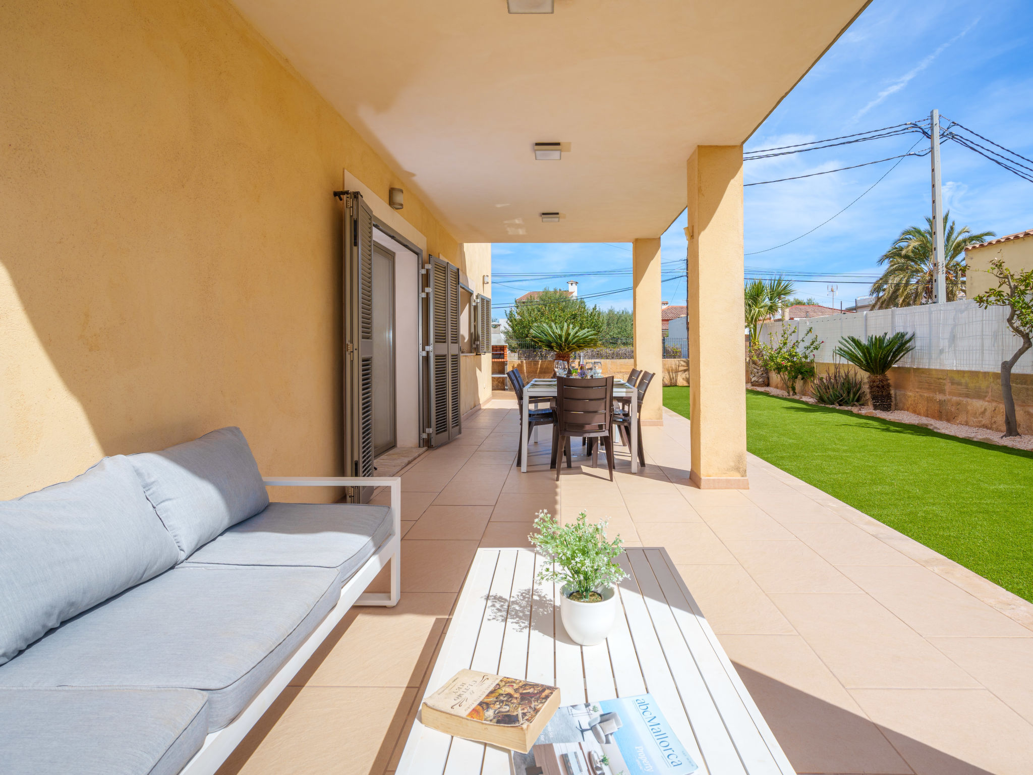 Barcarés 1 km von Alcúdia: Sehr grosse, sehr moderne, alleinstehende Villa "Son Jil", auf 2 Stockwerken, Baujahr 2005. Ruhige, sonnige Lage im Villenviertel, 2 km vom Waldrand, 60 m vom Meer, Strasse zu überqueren. Zur Alleinbenutzung: grosser, gepflegter Garten mit Rasen und Pflanzen, Schwimmbad eckig (8 x 4 m, 150 - 150 cm tief, 01.01.-31.12.) mit Salzelektrolyse-Reinigungssystem. Aussendusche, Sitzplatz, Laube, Pergola, Gartenmöbel, Grill. Im Hause: Internetzugang, Wireless LAN, Zentralheizung, Klimaanlage, Waschmaschine. Parkplatz beim Haus auf dem Grundstück, öffentliches Parkhaus, öffentliche Parkplätze auf der Strasse. Einkaufsgeschäft 1 km, Supermarkt 1.2 km, Einkaufszentrum 45 km, Restaurant, Bar 160 m, Fußgängerzone 50 m, Zentrum zu Fuss in 15 Minuten erreichbar, Bushaltestelle 1.5 km, Fähre 3 km, Sandstrand "Platja Es Morer Vermell" 550 m, Felsstrand "Platja Es Barcarés" 60 m. Sporthafen 250 m, Jacht-Hafen 3 km, Golfplatz (18 Loch) 6 km, Tennis 2.5 km, Reitstall 2.5 km, Sportzentrum 2.5 km, Wanderwege ab Haus 1 km, Radweg 700 m, Kinderspielplatz 500 m. Nahe gelegene Sehenswürdigkeiten: Ermita de la Victoria, Barcarés, Manresa, Sa Marina, Es Malpas. Ciutat Romana de Pollentia, Alcudia. Port d'Alcúdia, Port de Pollença - Pollença, North Beaches. Wandergebiete: Sa Talaia, Es Puig de Sant Martí, Serra Tramuntana Pollença. Bitte beachten: geeignet für Familien, geeignet für Senioren. Objekt geeignet für 8 Erwachsene Jugendgruppen nur auf Anfrage. Flugplatz 60 km vom Haus.