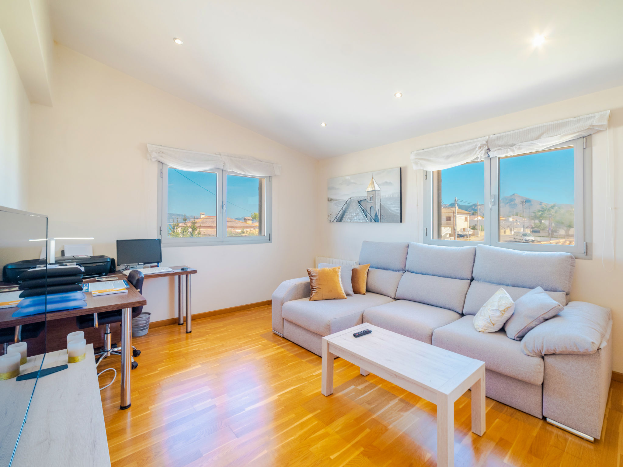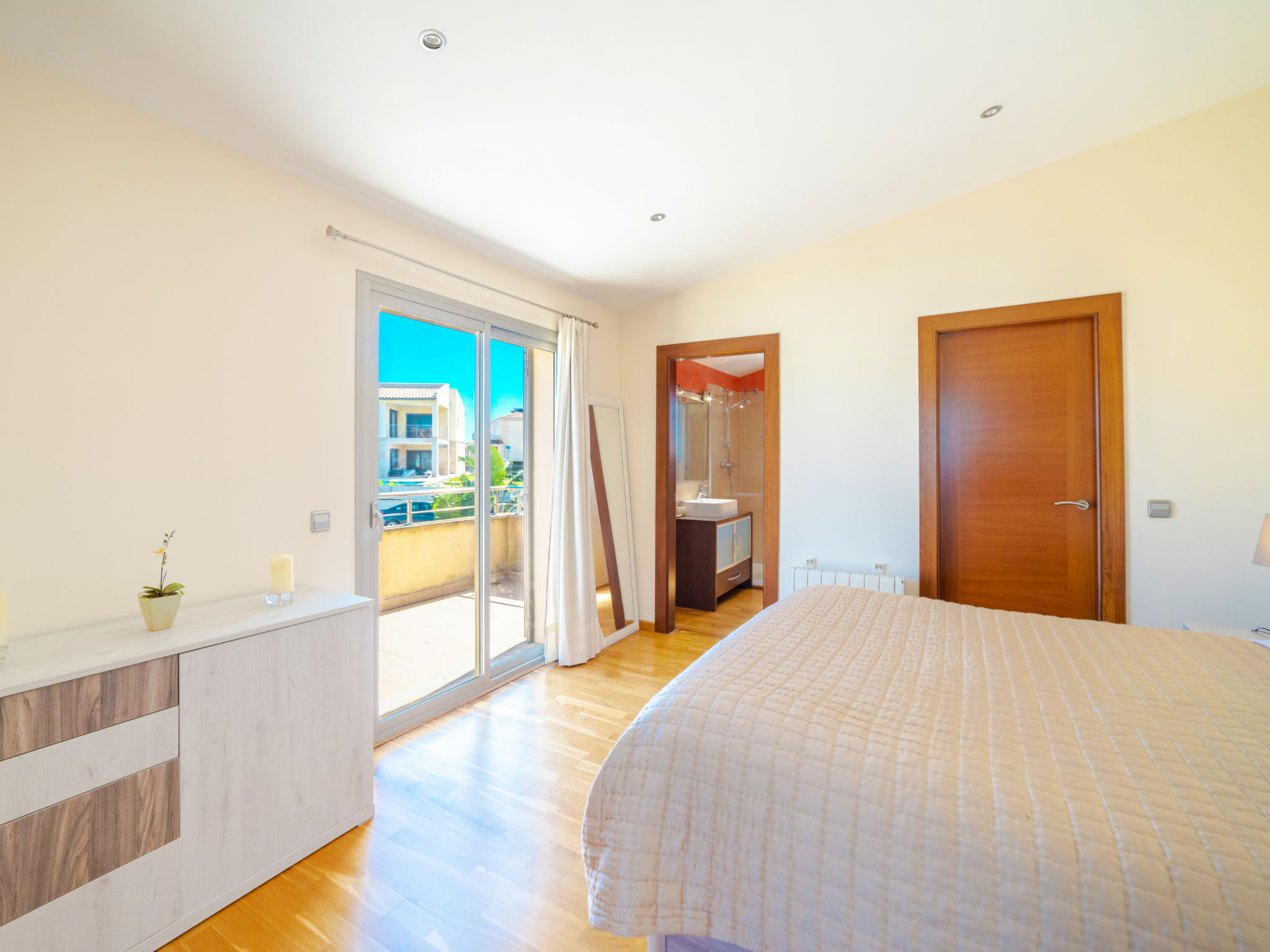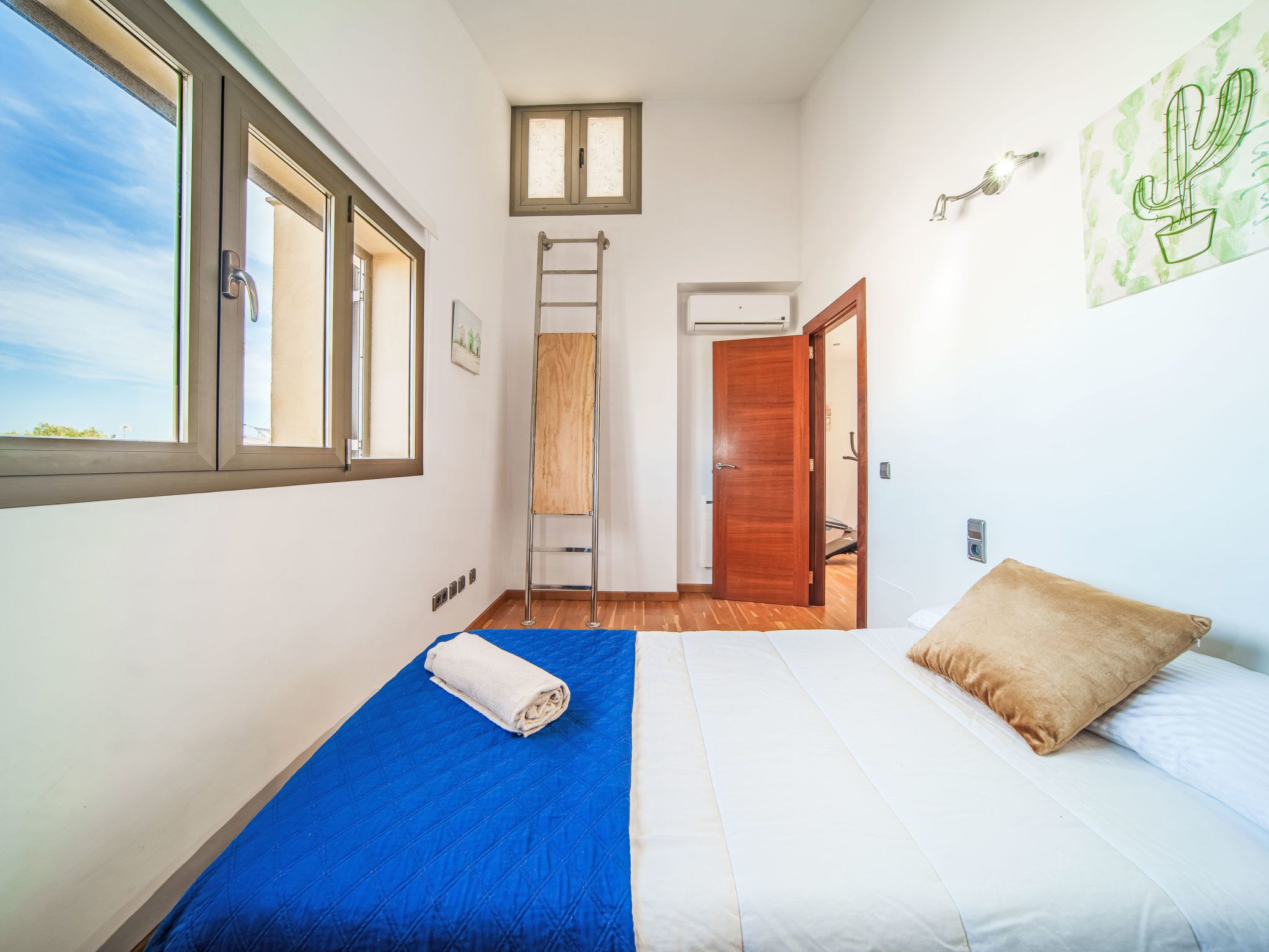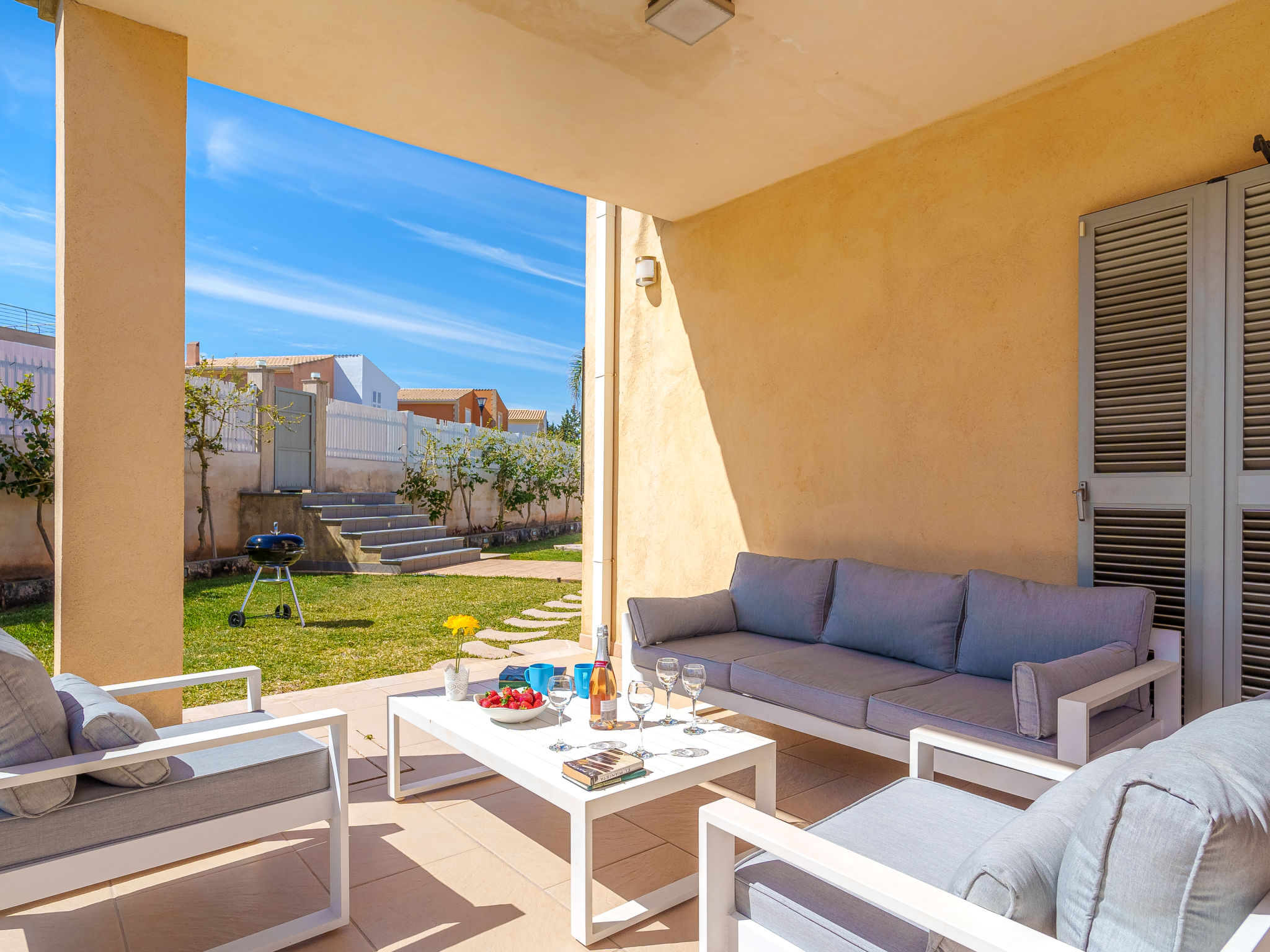 Barcarés 1 km von Alcúdia: Sehr grosse, sehr moderne, alleinstehende Villa "Son Jil", auf 2 Stockwerken, Baujahr 2005. Ruhige, sonnige Lage im Villenviertel, 2 km vom Waldrand, 60 m vom Meer, Strasse zu überqueren. Zur Alleinbenutzung: grosser, gepflegter Garten mit Rasen und Pflanzen, Schwimmbad eckig (8 x 4 m, 150 - 150 cm tief, 01.01.-31.12.) mit Salzelektrolyse-Reinigungssystem. Aussendusche, Sitzplatz, Laube, Pergola, Gartenmöbel, Grill. Im Hause: Internetzugang, Wireless LAN, Zentralheizung, Klimaanlage, Waschmaschine. Parkplatz beim Haus auf dem Grundstück, öffentliches Parkhaus, öffentliche Parkplätze auf der Strasse. Einkaufsgeschäft 1 km, Supermarkt 1.2 km, Einkaufszentrum 45 km, Restaurant, Bar 160 m, Fußgängerzone 50 m, Zentrum zu Fuss in 15 Minuten erreichbar, Bushaltestelle 1.5 km, Fähre 3 km, Sandstrand "Platja Es Morer Vermell" 550 m, Felsstrand "Platja Es Barcarés" 60 m. Sporthafen 250 m, Jacht-Hafen 3 km, Golfplatz (18 Loch) 6 km, Tennis 2.5 km, Reitstall 2.5 km, Sportzentrum 2.5 km, Wanderwege ab Haus 1 km, Radweg 700 m, Kinderspielplatz 500 m. Nahe gelegene Sehenswürdigkeiten: Ermita de la Victoria, Barcarés, Manresa, Sa Marina, Es Malpas. Ciutat Romana de Pollentia, Alcudia. Port d'Alcúdia, Port de Pollença - Pollença, North Beaches. Wandergebiete: Sa Talaia, Es Puig de Sant Martí, Serra Tramuntana Pollença. Bitte beachten: geeignet für Familien, geeignet für Senioren. Objekt geeignet für 8 Erwachsene Jugendgruppen nur auf Anfrage. Flugplatz 60 km vom Haus.