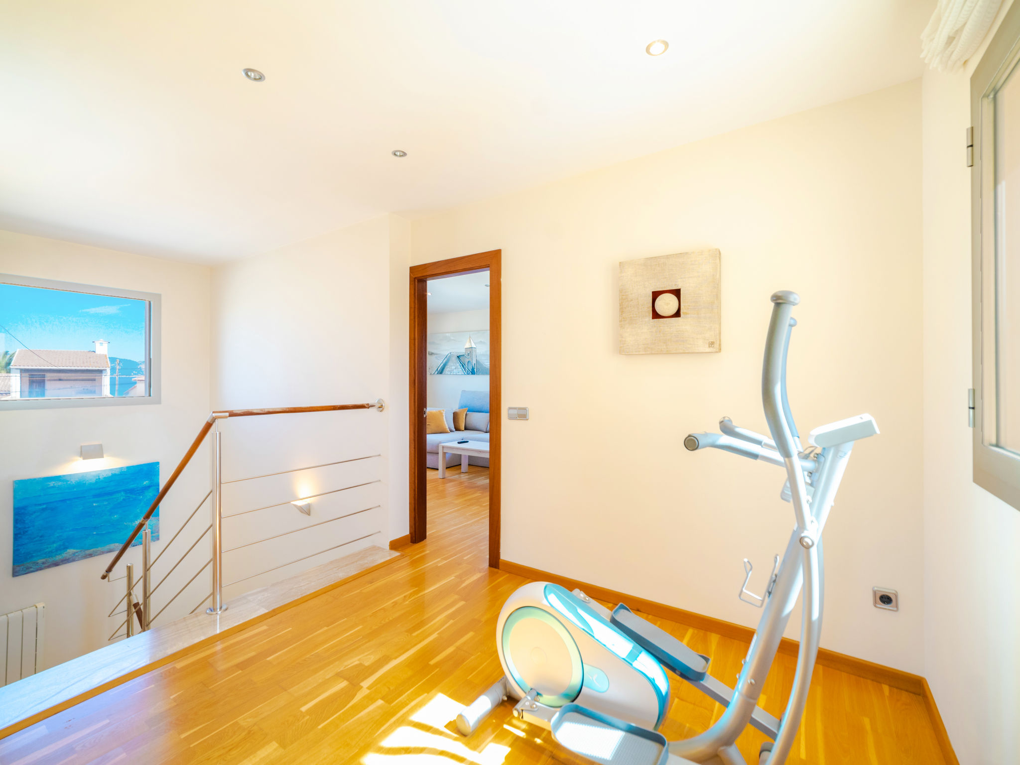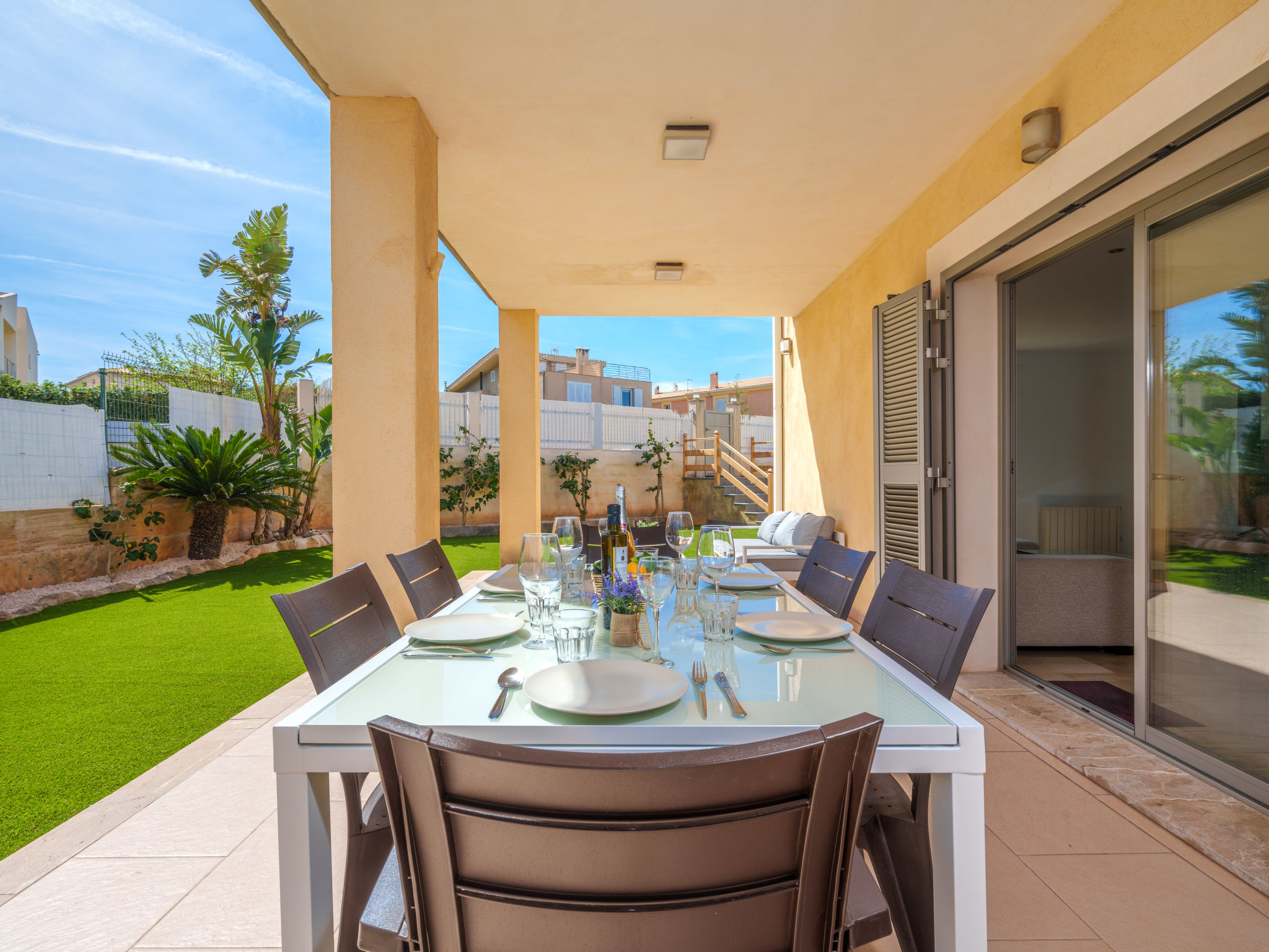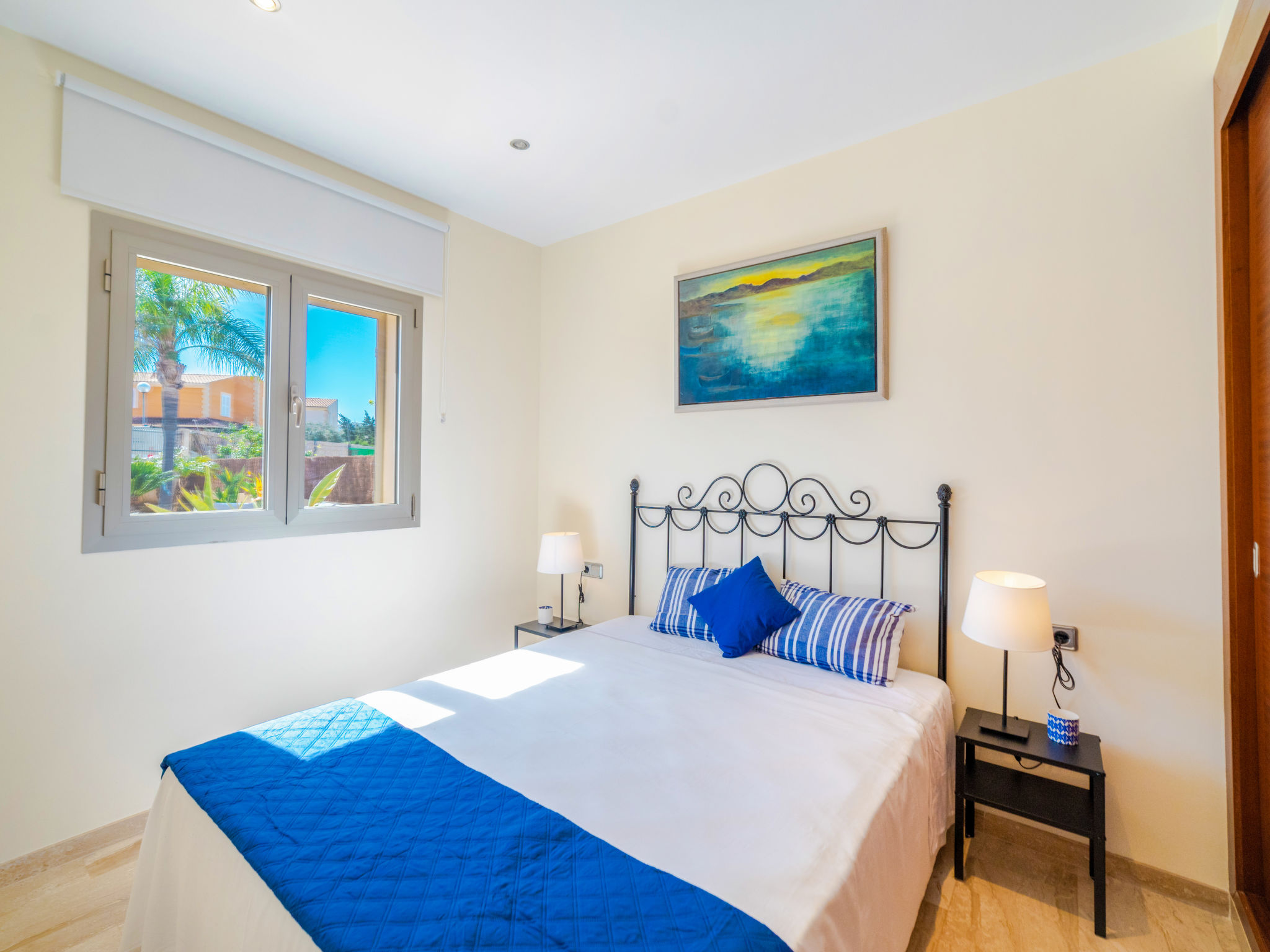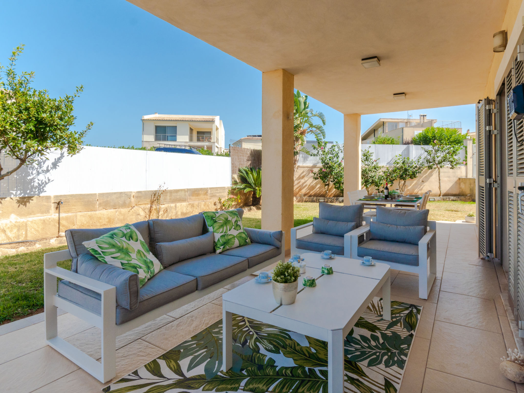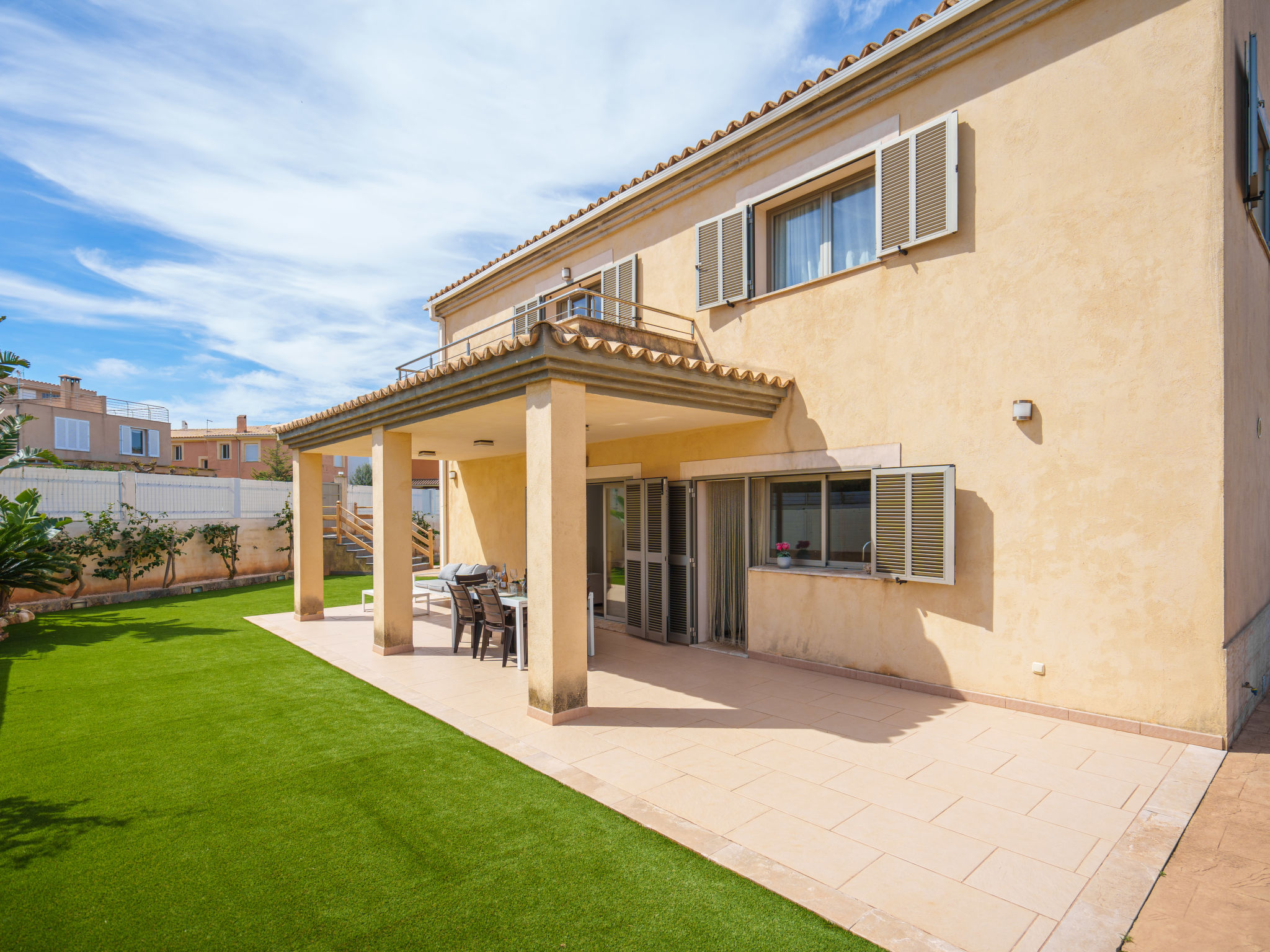 Barcarés 1 km von Alcúdia: Sehr grosse, sehr moderne, alleinstehende Villa "Son Jil", auf 2 Stockwerken, Baujahr 2005. Ruhige, sonnige Lage im Villenviertel, 2 km vom Waldrand, 60 m vom Meer, Strasse zu überqueren. Zur Alleinbenutzung: grosser, gepflegter Garten mit Rasen und Pflanzen, Schwimmbad eckig (8 x 4 m, 150 - 150 cm tief, 01.01.-31.12.) mit Salzelektrolyse-Reinigungssystem. Aussendusche, Sitzplatz, Laube, Pergola, Gartenmöbel, Grill. Im Hause: Internetzugang, Wireless LAN, Zentralheizung, Klimaanlage, Waschmaschine. Parkplatz beim Haus auf dem Grundstück, öffentliches Parkhaus, öffentliche Parkplätze auf der Strasse. Einkaufsgeschäft 1 km, Supermarkt 1.2 km, Einkaufszentrum 45 km, Restaurant, Bar 160 m, Fußgängerzone 50 m, Zentrum zu Fuss in 15 Minuten erreichbar, Bushaltestelle 1.5 km, Fähre 3 km, Sandstrand "Platja Es Morer Vermell" 550 m, Felsstrand "Platja Es Barcarés" 60 m. Sporthafen 250 m, Jacht-Hafen 3 km, Golfplatz (18 Loch) 6 km, Tennis 2.5 km, Reitstall 2.5 km, Sportzentrum 2.5 km, Wanderwege ab Haus 1 km, Radweg 700 m, Kinderspielplatz 500 m. Nahe gelegene Sehenswürdigkeiten: Ermita de la Victoria, Barcarés, Manresa, Sa Marina, Es Malpas. Ciutat Romana de Pollentia, Alcudia. Port d'Alcúdia, Port de Pollença - Pollença, North Beaches. Wandergebiete: Sa Talaia, Es Puig de Sant Martí, Serra Tramuntana Pollença. Bitte beachten: geeignet für Familien, geeignet für Senioren. Objekt geeignet für 8 Erwachsene Jugendgruppen nur auf Anfrage. Flugplatz 60 km vom Haus.