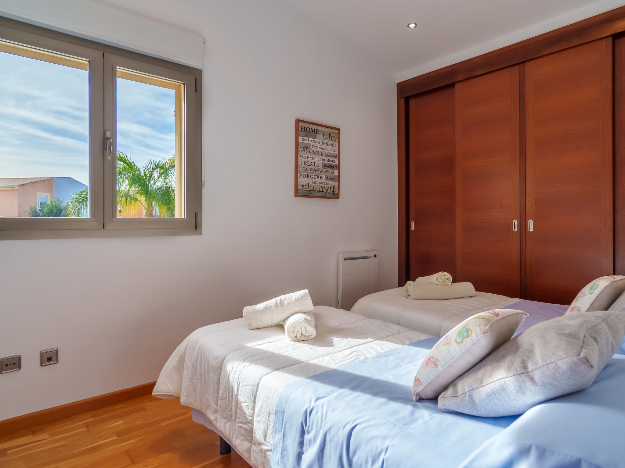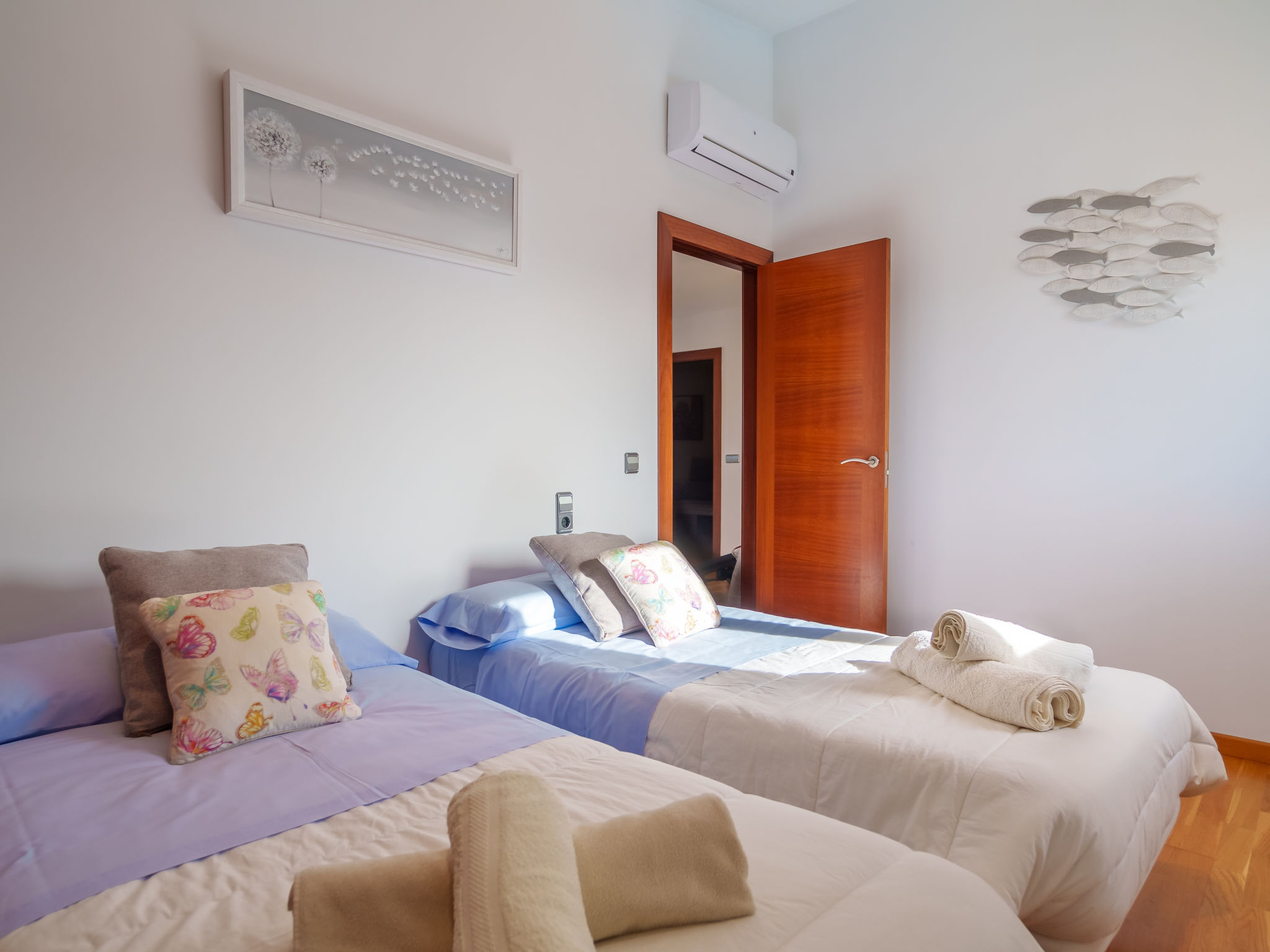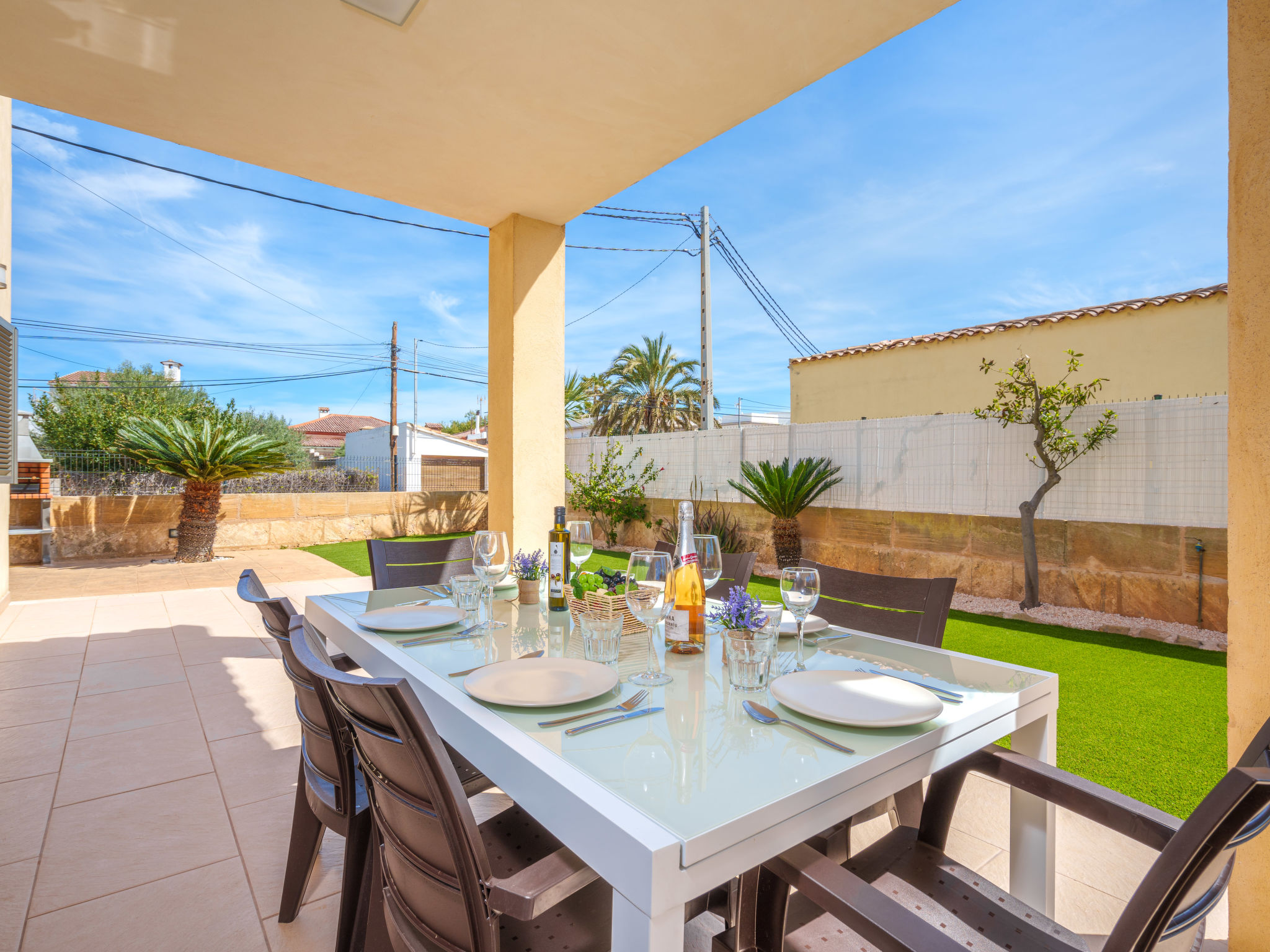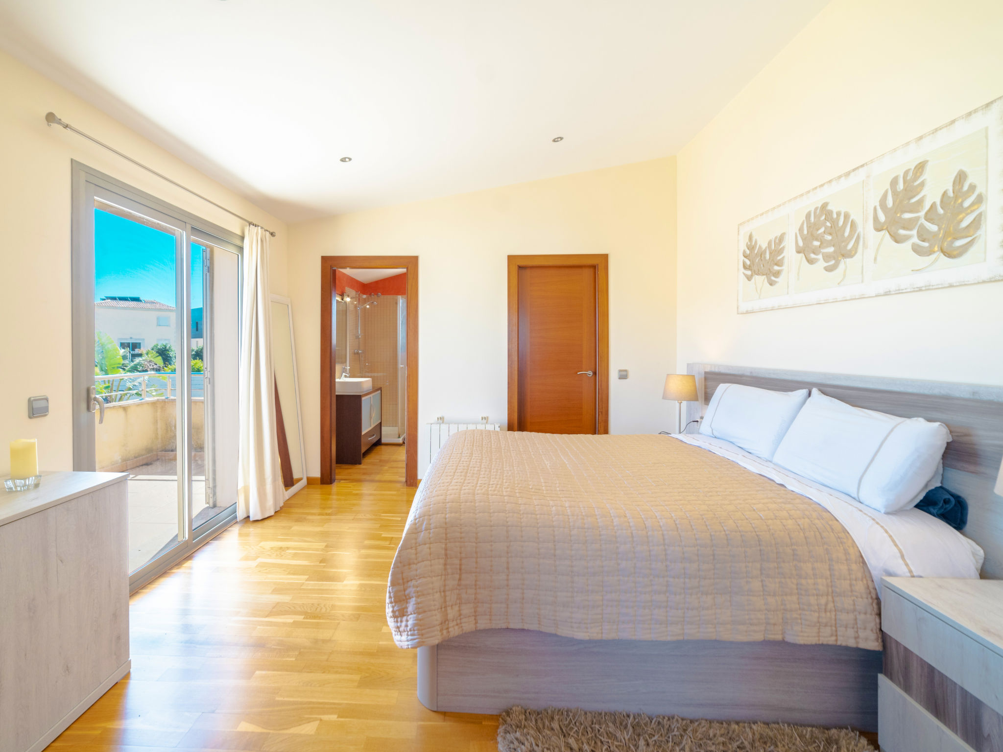 Barcarés 1 km von Alcúdia: Sehr grosse, sehr moderne, alleinstehende Villa "Son Jil", auf 2 Stockwerken, Baujahr 2005. Ruhige, sonnige Lage im Villenviertel, 2 km vom Waldrand, 60 m vom Meer, Strasse zu überqueren. Zur Alleinbenutzung: grosser, gepflegter Garten mit Rasen und Pflanzen, Schwimmbad eckig (8 x 4 m, 150 - 150 cm tief, 01.01.-31.12.) mit Salzelektrolyse-Reinigungssystem. Aussendusche, Sitzplatz, Laube, Pergola, Gartenmöbel, Grill. Im Hause: Internetzugang, Wireless LAN, Zentralheizung, Klimaanlage, Waschmaschine. Parkplatz beim Haus auf dem Grundstück, öffentliches Parkhaus, öffentliche Parkplätze auf der Strasse. Einkaufsgeschäft 1 km, Supermarkt 1.2 km, Einkaufszentrum 45 km, Restaurant, Bar 160 m, Fußgängerzone 50 m, Zentrum zu Fuss in 15 Minuten erreichbar, Bushaltestelle 1.5 km, Fähre 3 km, Sandstrand "Platja Es Morer Vermell" 550 m, Felsstrand "Platja Es Barcarés" 60 m. Sporthafen 250 m, Jacht-Hafen 3 km, Golfplatz (18 Loch) 6 km, Tennis 2.5 km, Reitstall 2.5 km, Sportzentrum 2.5 km, Wanderwege ab Haus 1 km, Radweg 700 m, Kinderspielplatz 500 m. Nahe gelegene Sehenswürdigkeiten: Ermita de la Victoria, Barcarés, Manresa, Sa Marina, Es Malpas. Ciutat Romana de Pollentia, Alcudia. Port d'Alcúdia, Port de Pollença - Pollença, North Beaches. Wandergebiete: Sa Talaia, Es Puig de Sant Martí, Serra Tramuntana Pollença. Bitte beachten: geeignet für Familien, geeignet für Senioren. Objekt geeignet für 8 Erwachsene Jugendgruppen nur auf Anfrage. Flugplatz 60 km vom Haus.