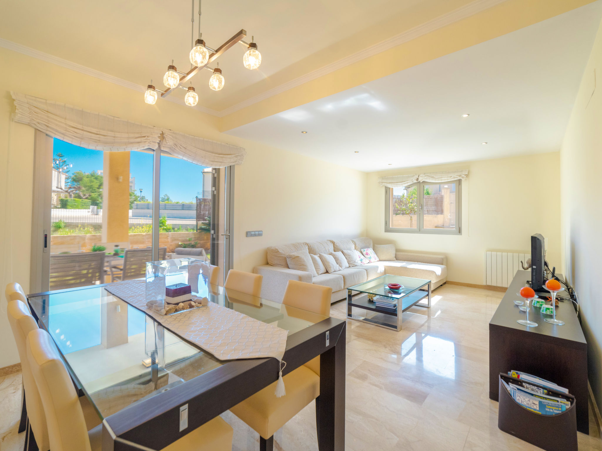 "Son Jil", 6-Zimmer-Villa 500 m2 auf 2 Stockwerken. Objekt geeignet für 8 Erwachsene. Geräumig und hell, sehr komfortabel und schön eingerichtet: grosses Wohn-/Esszimmer mit Panoramafenster mit Esstisch, TV und Flachbildschirm. Ausgang zum Gartensitzplatz, zum Schwimmbad. 1 Doppelzimmer mit Panoramafenster mit 1 franz. Bett (150 cm, Länge 190 cm). Wohnküche (4 Kochplatten, Backofen, Geschirrspüler, Mikrowelle, Tiefkühler, elektrische Kaffeemaschine) mit Esstisch. Dusche/WC. Obergeschoss: 1 grosses Doppelzimmer mit Panoramafenster begehbarer Kleiderschrank mit 1 franz. Bett (200 cm, Länge 200 cm), Dusche/WC, TV, Flachbildschirm, Klimaanlage und Warmluftheizung. Ausgang zum Balkon. 1 Doppelzimmer mit Panoramafenster mit 2 Betten (90 cm, Länge 190 cm), Klimaanlage und Warmluftheizung. 1 Doppelzimmer mit Panoramafenster mit 1 Ausziehbett (2 Pers. 2 x 90 cm, Länge 190 cm), Klimaanlage und Warmluftheizung. Bad/WC. Grosser Balkon, grosser Gartensitzplatz, Rasen, Laube. Terrassenmöbel, Gartengrill, Liegestühle, Loggia. Sicht auf das Meer, die Berge und die Ortschaft. Zur Verfügung: Waschmaschine, Bügeleisen, Kinderhochstuhl, Babybett, Haartrockner. Internet (Wireless LAN, gratis). Parkplatz (eingezäunt) beim Haus. Geeignet für Familien. ETV12609