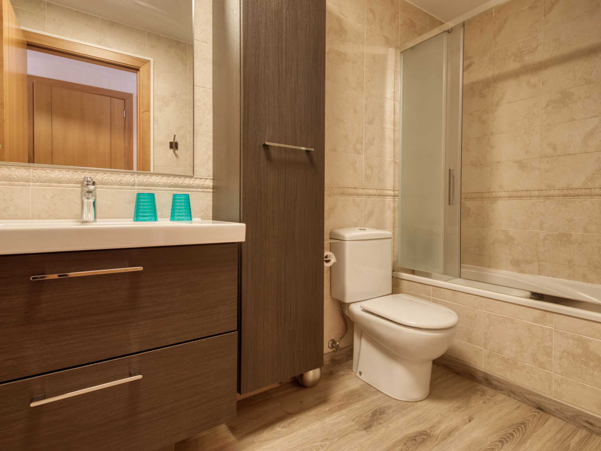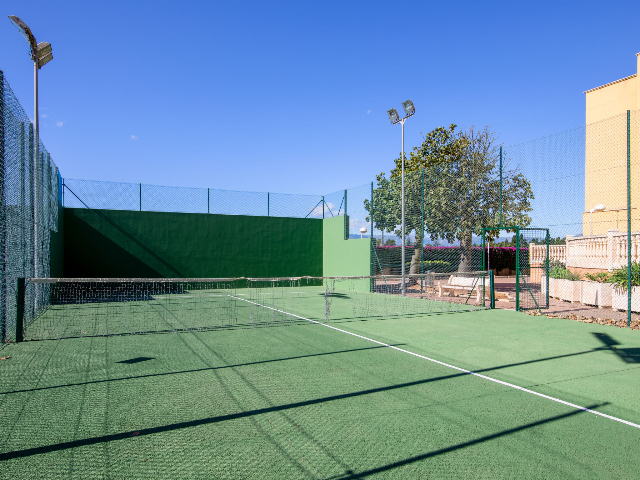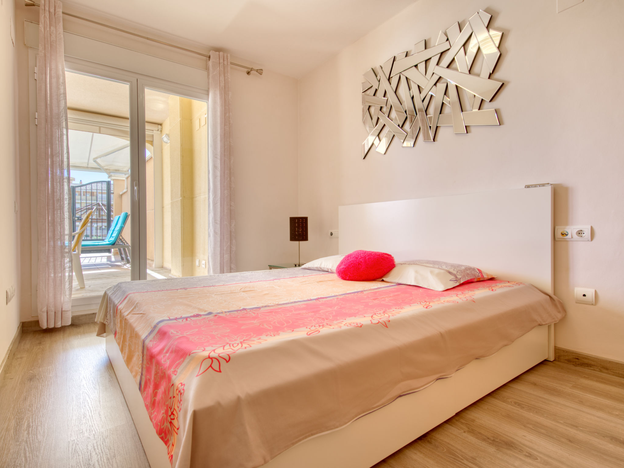"Aquamarine", 3-Zimmer-Wohnung 80 m2, im Erdgeschoss. Geräumig und hell, sehr schön und gemütlich eingerichtet: Wohn-/Esszimmer mit Sat-TV, Klimaanlage und Warmluftheizung. Ausgang zum Gartensitzplatz, zum Schwimmbad. 1 Zimmer mit 1 franz. Bett (160 cm, Länge 200 cm), Bad/WC, Klimaanlage und Warmluftheizung. Ausgang zur Terrasse, zum Schwimmbad. 1 Zimmer mit 2 Betten (90 cm, Länge 190 cm), Klimaanlage und Warmluftheizung. Offene Küche (Backofen, Geschirrspüler, 4 Glaskeramikherd Platten, Mikrowelle, Tiefkühler, elektrische Kaffeemaschine). Dusche/WC. Grosse Terrasse 35 m2. Zur Verfügung: Waschmaschine, Bügeleisen, Kinderhochstuhl, Babybett, Haartrockner. Internet (Wireless LAN, gratis). Garage Nr. pk 2. 2 Paddeltennisplätze / Fussbodenheizung. VT-481901-A