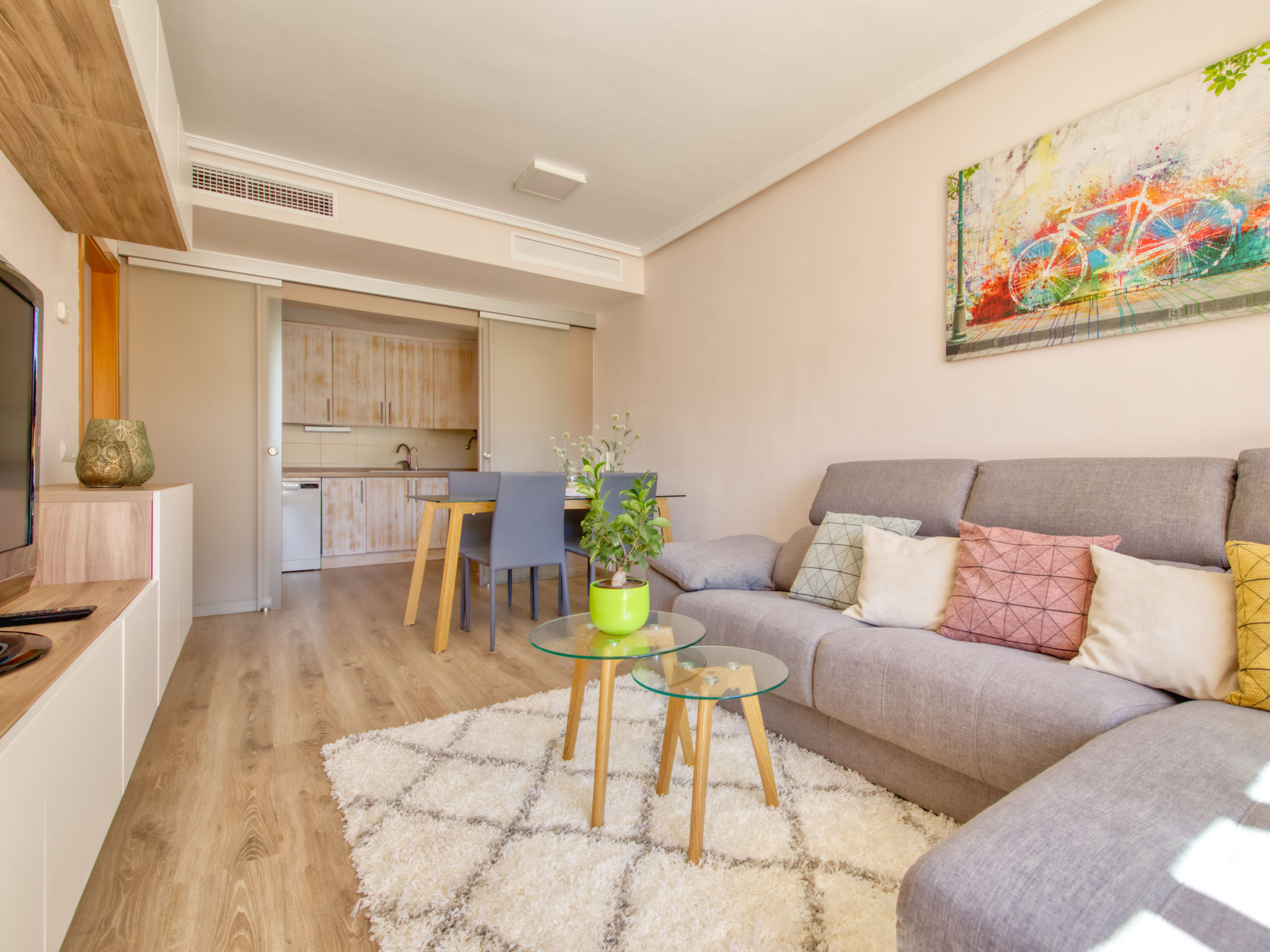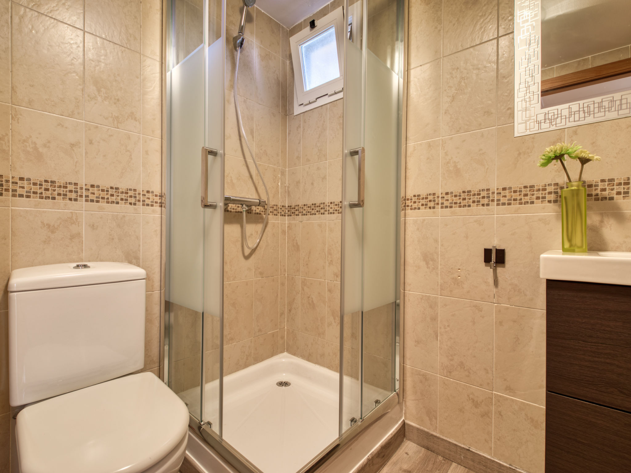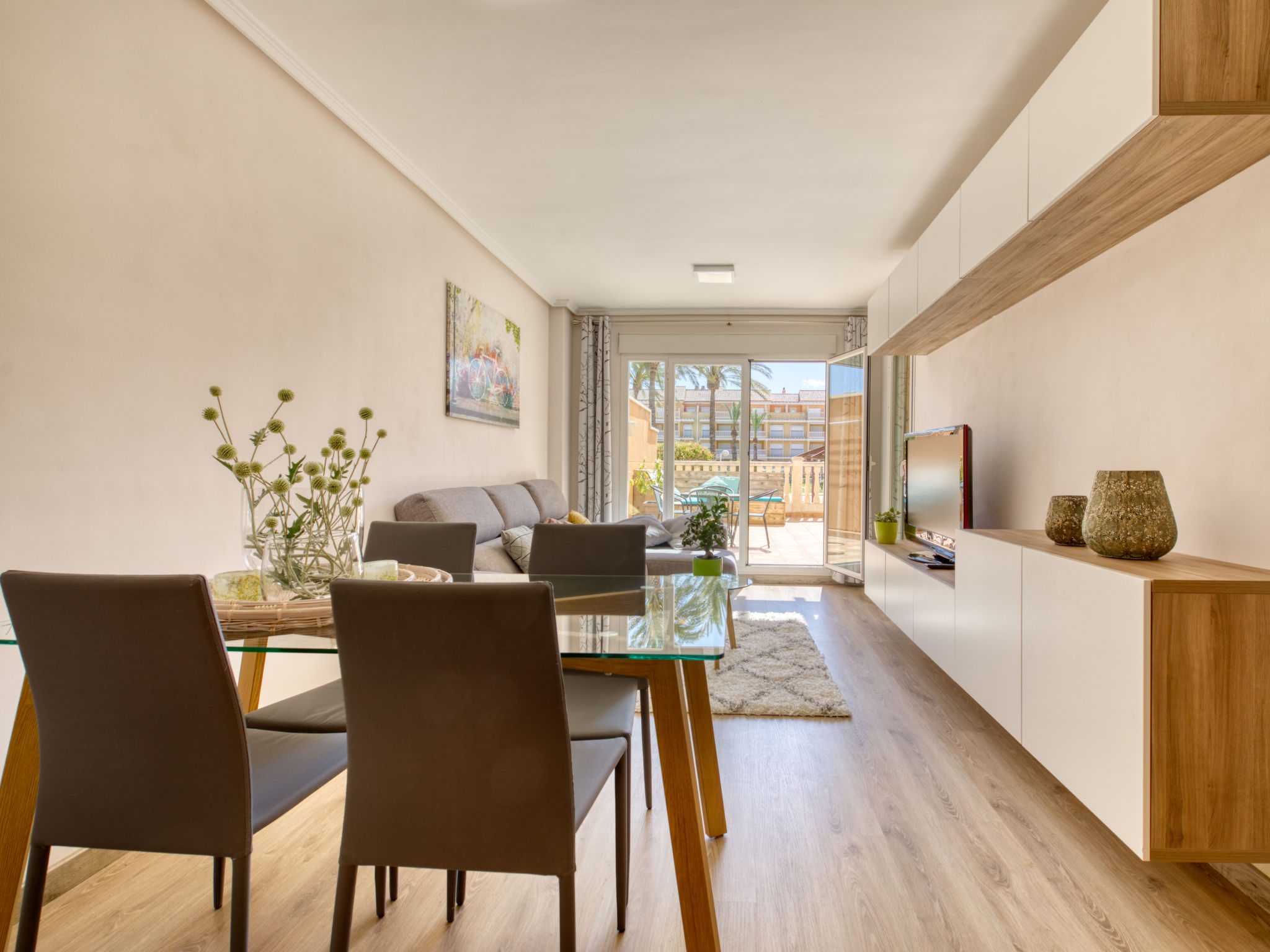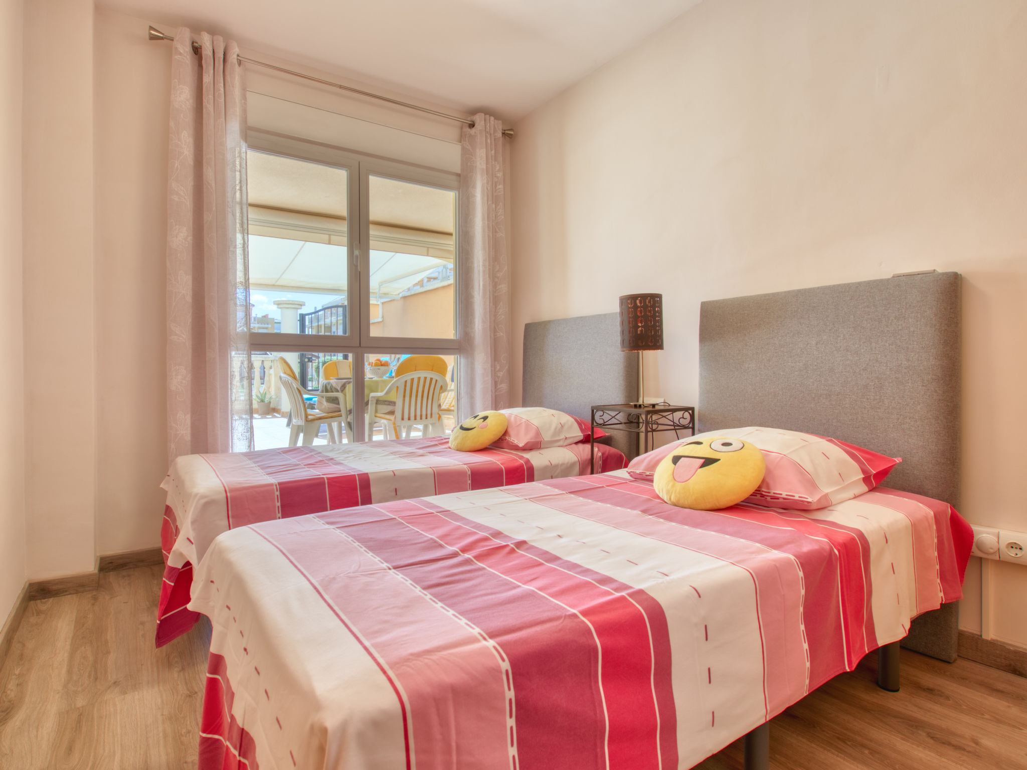 "Aquamarine", 3-Zimmer-Wohnung 80 m2, im Erdgeschoss. Geräumig und hell, sehr schön und gemütlich eingerichtet: Wohn-/Esszimmer mit Sat-TV, Klimaanlage und Warmluftheizung. Ausgang zum Gartensitzplatz, zum Schwimmbad. 1 Zimmer mit 1 franz. Bett (160 cm, Länge 200 cm), Bad/WC, Klimaanlage und Warmluftheizung. Ausgang zur Terrasse, zum Schwimmbad. 1 Zimmer mit 2 Betten (90 cm, Länge 190 cm), Klimaanlage und Warmluftheizung. Offene Küche (Backofen, Geschirrspüler, 4 Glaskeramikherd Platten, Mikrowelle, Tiefkühler, elektrische Kaffeemaschine). Dusche/WC. Grosse Terrasse 35 m2. Zur Verfügung: Waschmaschine, Bügeleisen, Kinderhochstuhl, Babybett, Haartrockner. Internet (Wireless LAN, gratis). Garage Nr. pk 2. 2 Paddeltennisplätze / Fussbodenheizung. VT-481901-A