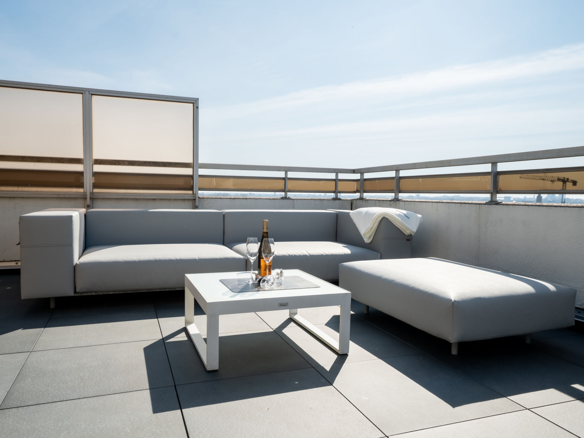 "Seaview 1", 3-Zimmer-Attikawohnung 115 m2 auf 2 Stockwerken im 9. Stock, Südwestlage. Vollständig renoviert im Jahre 2021, komfortabel und modern eingerichtet: Eingang. Wohn-/Esszimmer mit Esstisch, Digital-TV und Internationale TV-Sender. 1 Doppelzimmer mit 1 Doppelbett (180 cm, Länge 200 cm). Offene Küche (Backofen, Geschirrspüler, 4 Glaskeramikherd Platten, Toaster, Wasserkocher, Mikrowelle, elektrische Kaffeemaschine). Dusche/WC. Obergeschoss: 1 Doppelzimmer mit 1 Doppelbett (180 cm, Länge 200 cm), Digital-TV und Internationale TV-Sender. Kochnische (Geschirrspüler, 4 Glaskeramikherd Platten, Kombinationsmikrowelle). Dusche/WC. 2 kleine Balkone 3 m2, Südwestlage und Nordostlage, grosse Terrasse 30 m2, Südwestlage. Terrassenmöbel. Schöne Sicht auf das Meer. Zur Verfügung: Waschmaschine, Haartrockner. Internet (Wireless LAN, gratis). Parkplatz Nr. 76 (1 Auto). Bitte beachten: Nichtraucher-Haus. Rauchmelder, Feuerlöscher.