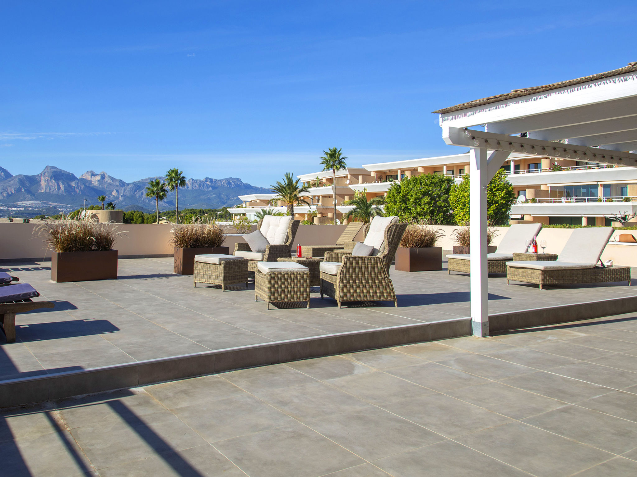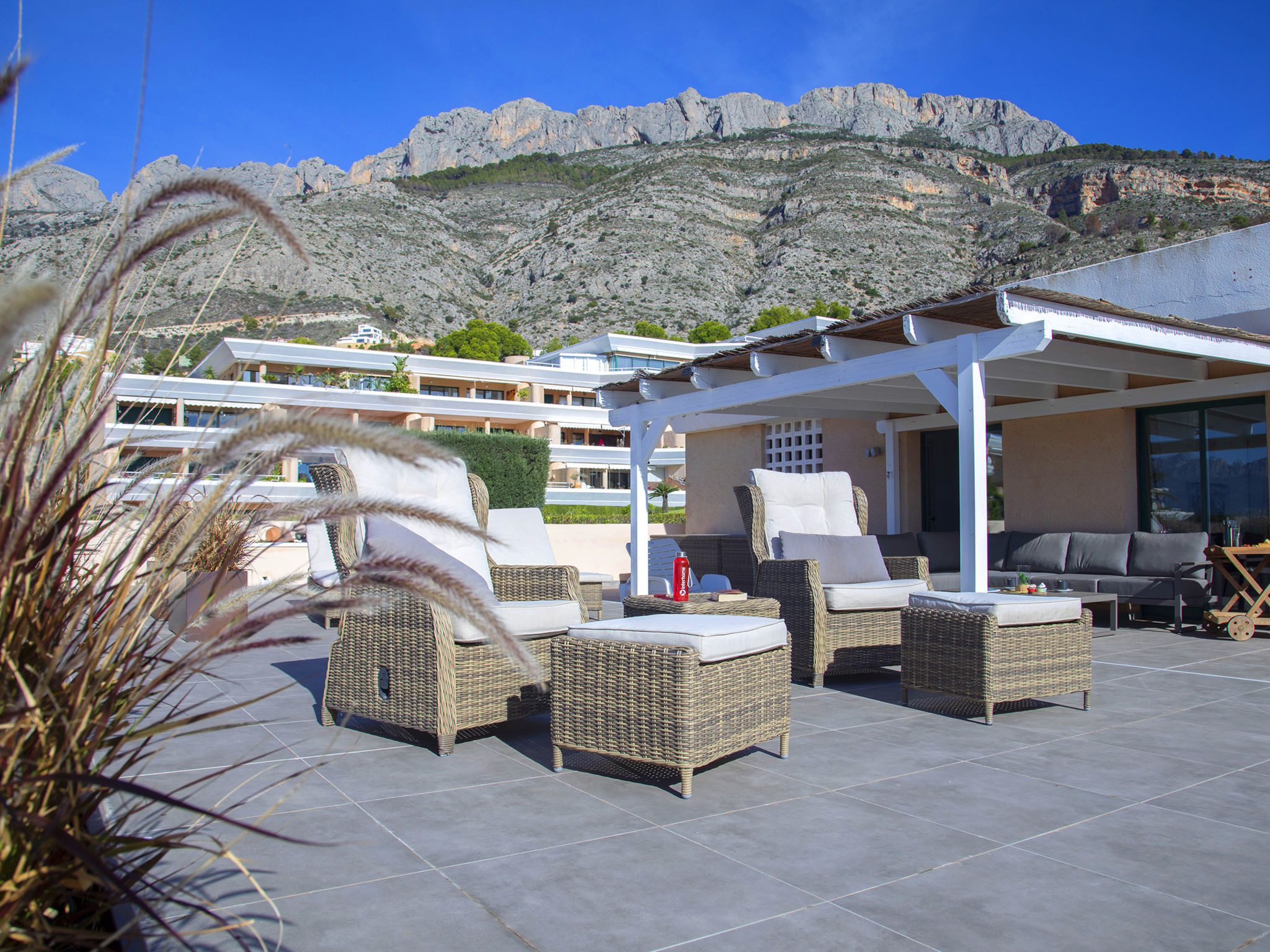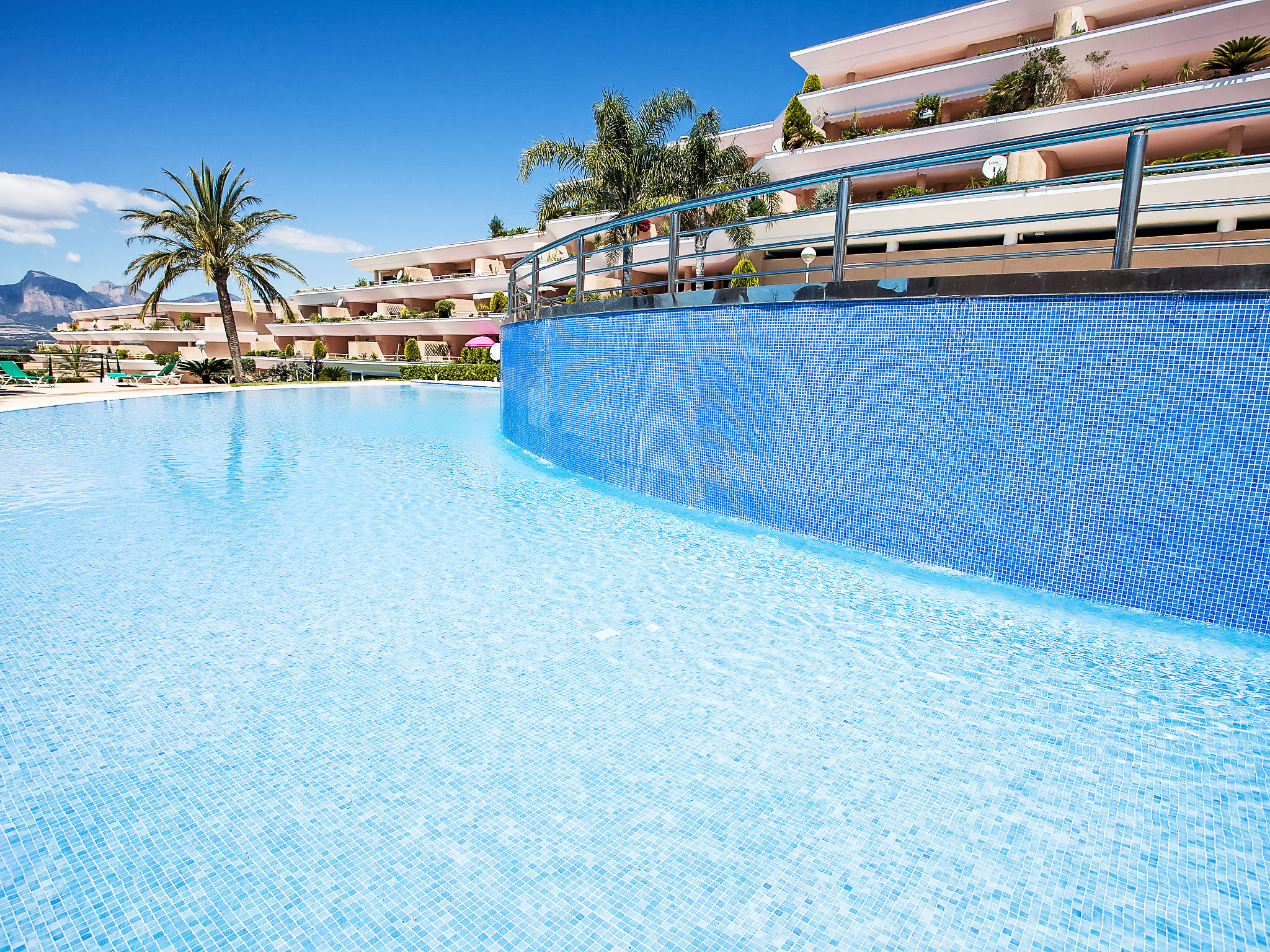 Sierra de Altea: Schönes Appartementhaus "Altea La Nova". 2.2 km vom Zentrum von Altea la Vieja, 6 km vom Zentrum von Altea, sonnige, erhöhte Lage, verkehrsberuhigte Zone, 3.5 km vom Meer, 3.5 km vom Strand. Zur Mitbenutzung: Grundstück (eingezäunt), Garten mit Rasen, Schwimmbad (saisonale Verfügbarkeit: 01.Mai.-30.Sep.) mit Innentreppe. Kinderbecken, Aussendusche, Terrasse. Im Hause: Empfang, Fahrstuhl. Einkaufsgeschäft 2.2 km, Lebensmittelgeschäft 2.2 km, Supermarkt 2.2 km, Restaurant 3 km, Bar 2.2 km, Bäckerei 2.2 km, Café 2.2 km, Internet-Café 2.2 km, Fußgängerzone 2.2 km, Fahrradverleih 2.2 km, Biergarten 2.2 km, Zentrum zu Fuss in 33 Minuten erreichbar, Sandstrand "Playa Puerto Blanco -Calpe-" 12 km, Badebucht 5 km. Sporthafen 7 km, Jacht-Hafen 7 km, Golfplatz (9 Loch) 1 km, Surfschule 7 km, Segelschule 7 km. Nahe gelegene Sehenswürdigkeiten: Aqualandia 20 km, Mundomar 20 km, Terra Mitica 25 km, Terra Natura 25 km, Fuentes del Algar 22 km, Guadalest 25 km. Wandergebiete: Peñon de Ifach 15 km. Der Besitzer akzeptiert keine Jugendgruppen.