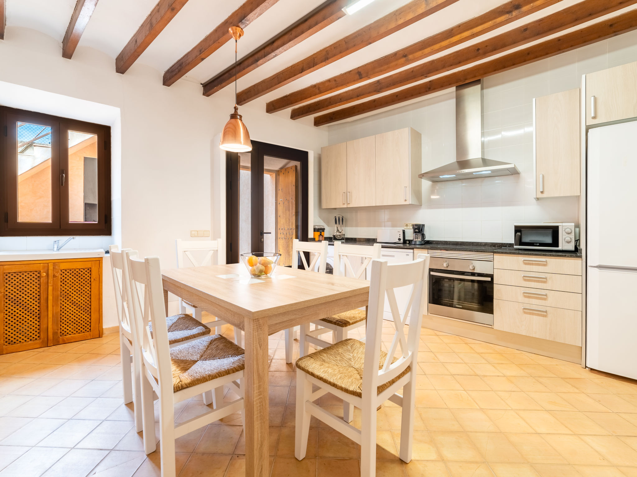 "Boutique House", 6-Zimmer-Haus 140 m2 auf 2 Stockwerken. Objekt geeignet für 6 Erwachsene. Zweckmässig und gemütlich eingerichtet: grosser Salon mit Sat-TV, Digital-TV, Internationale TV-Sender und Flachbildschirm. Ausgang zur Terrasse. Wohnküche (Backofen, Geschirrspüler, 3 Glaskeramikherd Platten, Toaster, Wasserkocher, Mikrowelle, Tiefkühler, elektrische Kaffeemaschine) mit Esstisch. Ausgang zur Terrasse. Bad oder Dusche/WC. Obergeschoss: 1 grosses Doppelzimmer mit 1 franz. Bett (150 cm, Länge 190 cm), Ventilator. 1 grosses Doppelzimmer mit 1 franz. Bett (150 cm, Länge 190 cm), Ventilator. 1 grosses Doppelzimmer mit 1 franz. Bett (150 cm, Länge 190 cm), Ventilator. Bad oder Dusche/WC. Terrassenmöbel, Gartengrill, Liegestühle (2). Fernsicht auf das Meer, die Berge, die Ortschaft und das Städtchen. Zur Verfügung: Waschmaschine, Bügeleisen, Kinderhochstuhl, Babybett bis 2 Jahre, Haartrockner. Internet (Wireless LAN, gratis). Geeignet für Familien. 2022016ET