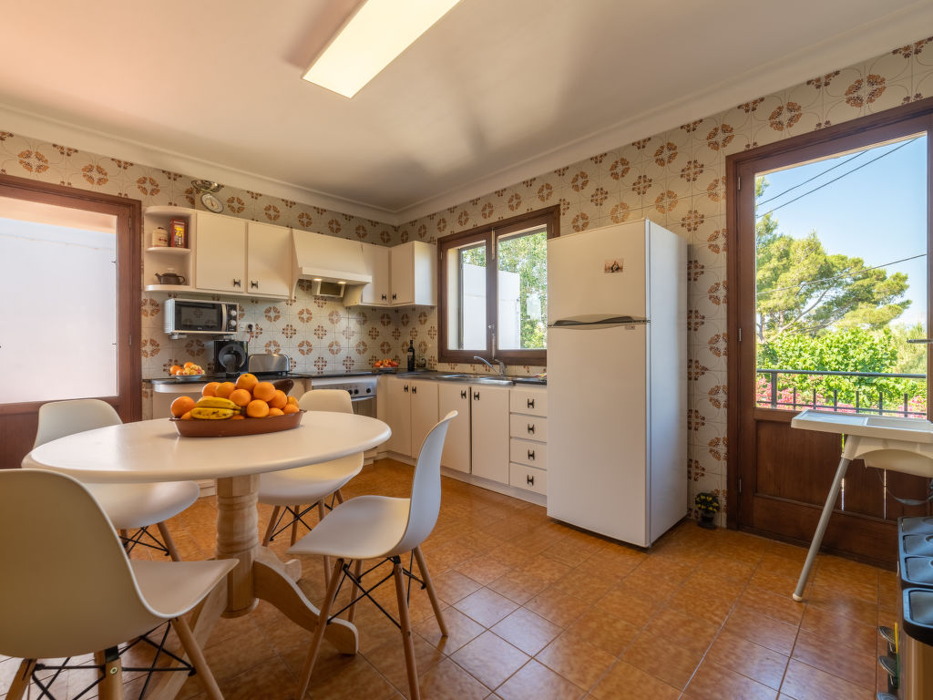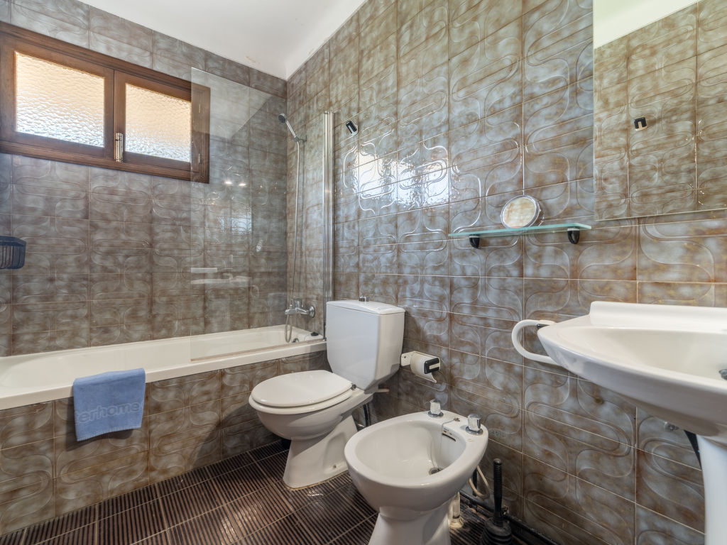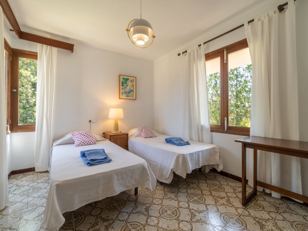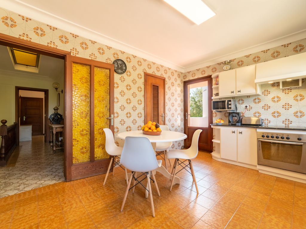 "Can Jeroni", 5-Zimmer-Haus 163 m2 im 1. Stock. Objekt geeignet für. Geräumig und hell: grosses Wohnzimmer mit Digital-TV und Flachbildschirm. Ausgang zum Balkon. Grosses Esszimmer mit Panoramafenster mit Esstisch. Ausgang zum Balkon. 1 grosses Doppelzimmer mit Panoramafenster mit 1 franz. Bett (150 cm, Länge 190 cm), Klimaanlage und Warmluftheizung. 1 grosses Doppelzimmer mit Panoramafenster mit 1 franz. Bett (135 cm, Länge 190 cm), Klimaanlage und Warmluftheizung. 1 grosses Doppelzimmer mit Panoramafenster mit 2 Betten (90 cm, Länge 190 cm), Klimaanlage und Warmluftheizung. 1 Zimmer mit Panoramafenster mit 1 Bett (90 cm, Länge 190 cm). Wohnküche (Backofen, Geschirrspüler, 3 Glaskeramikherd Platten, Toaster, Wasserkocher, Mikrowelle, Tiefkühler, elektrische Kaffeemaschine) mit Esstisch. Ausgang zum Gartensitzplatz. Bad/Bidet/WC, Dusche/WC. Grosser Balkon, grosser Gartensitzplatz, Rasen, Laube. Terrassenmöbel, Balkonmöbel, Gartengrill, Liegestühle, Loggia, Abstellkammer. Sicht auf die Ortschaft. Zur Verfügung: Waschmaschine, Bügeleisen, Kinderhochstuhl, Babybett bis 2 Jahre, Haartrockner. Internet (Wireless LAN, gratis). Parkplatz. ETV11431