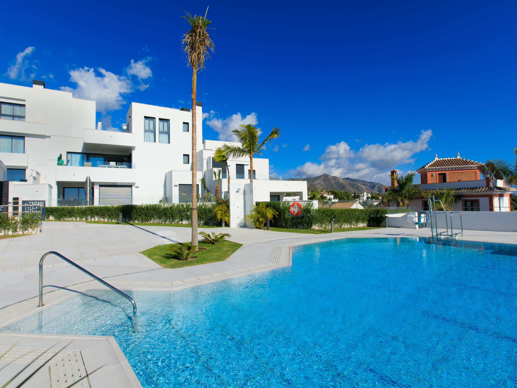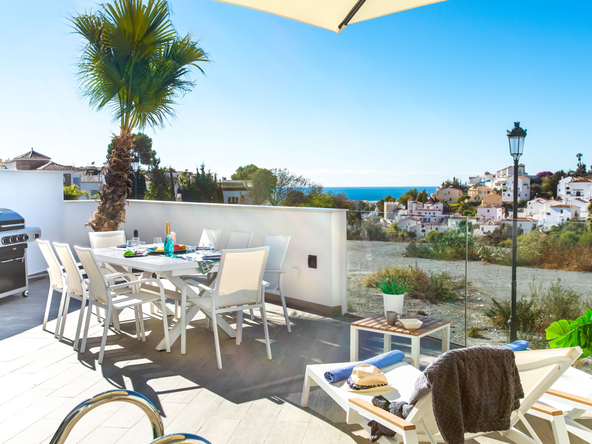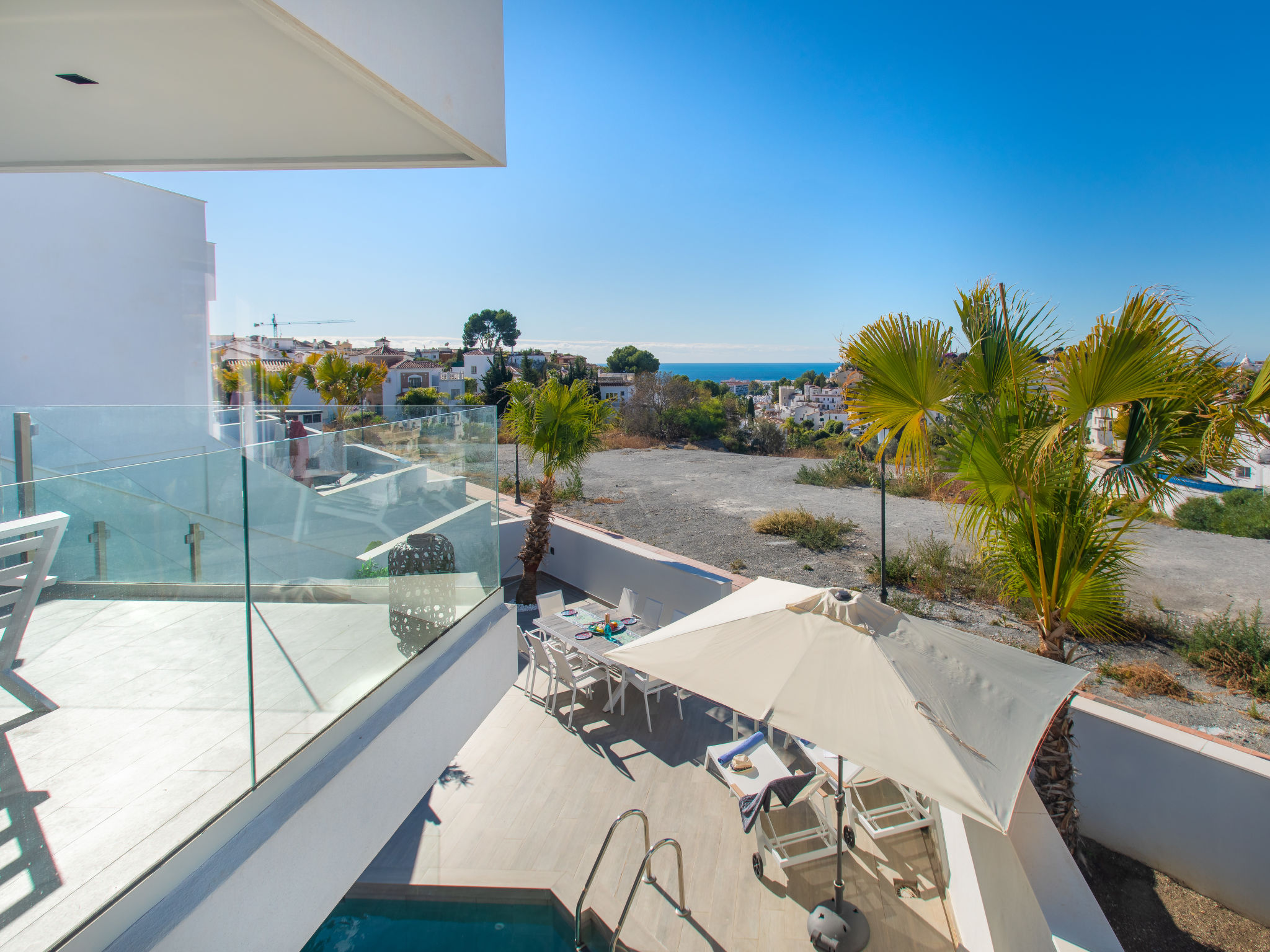 "Royal Palm", 5-Zimmer-Reihenhaus 180 m2 auf 3 Stockwerken, Südlage. Geräumig und hell, komfortabel und luxuriös eingerichtet: Wohn-/Esszimmer mit sep. WC, Digital-TV und Klimaanlage. Ausgang zur Terrasse, zum Schwimmbad. Offene Küche (Backofen, Geschirrspüler, 4 Glaskeramikherd Platten, Toaster, Wasserkocher, Mikrowelle, Tiefkühler, elektrische Kaffeemaschine). Ausgang zur Terrasse. Sep. WC. Unteres Geschoss: Salon mit 2 Diwanbetten und Klimaanlage. Dusche/WC. Obergeschoss: 1 Zimmer mit 1 franz. Bett (160 cm, Länge 200 cm), Dusche/WC und Klimaanlage. Ausgang zur Terrasse, zum Schwimmbad. 1 Zimmer mit 1 franz. Bett (160 cm, Länge 200 cm), Klimaanlage. 1 Zimmer mit 1 franz. Bett (160 cm, Länge 200 cm), Klimaanlage. Dusche/WC. 2 grosse Terrassen. Terrassenmöbel, Gartengrill, Liegestühle. Sehr schöne Sicht auf das Meer. Zur Verfügung: Waschmaschine, Bügeleisen, Kinderhochstuhl, Babybett bis 3 Jahre, Haartrockner. Internet (Wireless LAN, gratis). VFT/MA46718