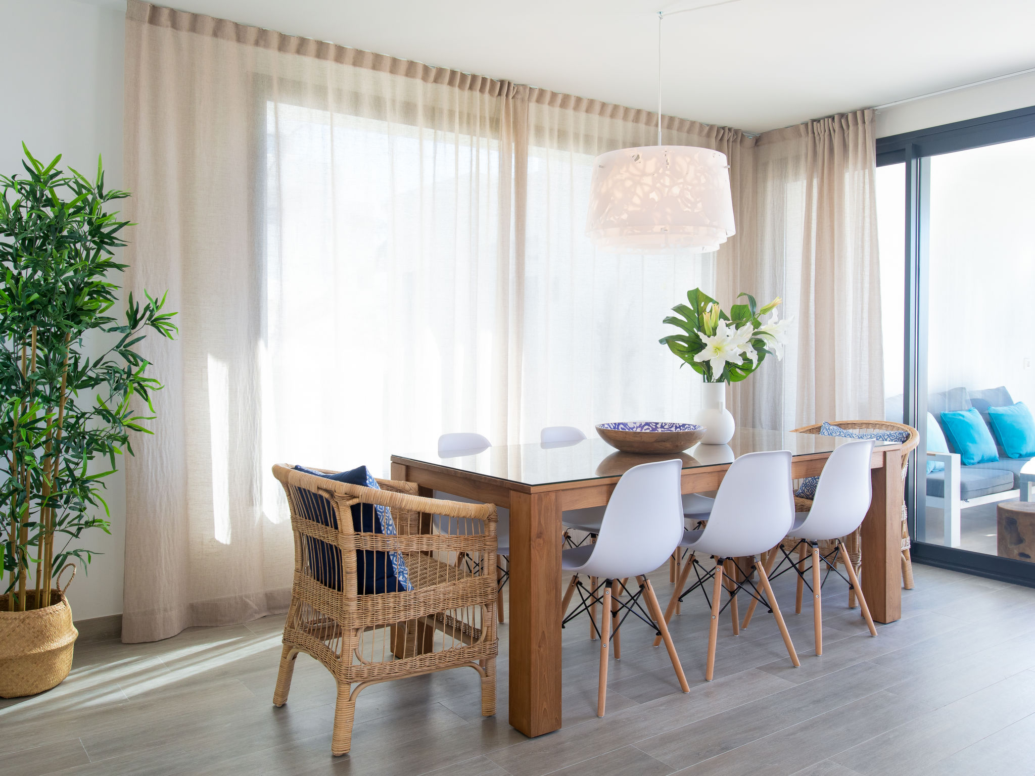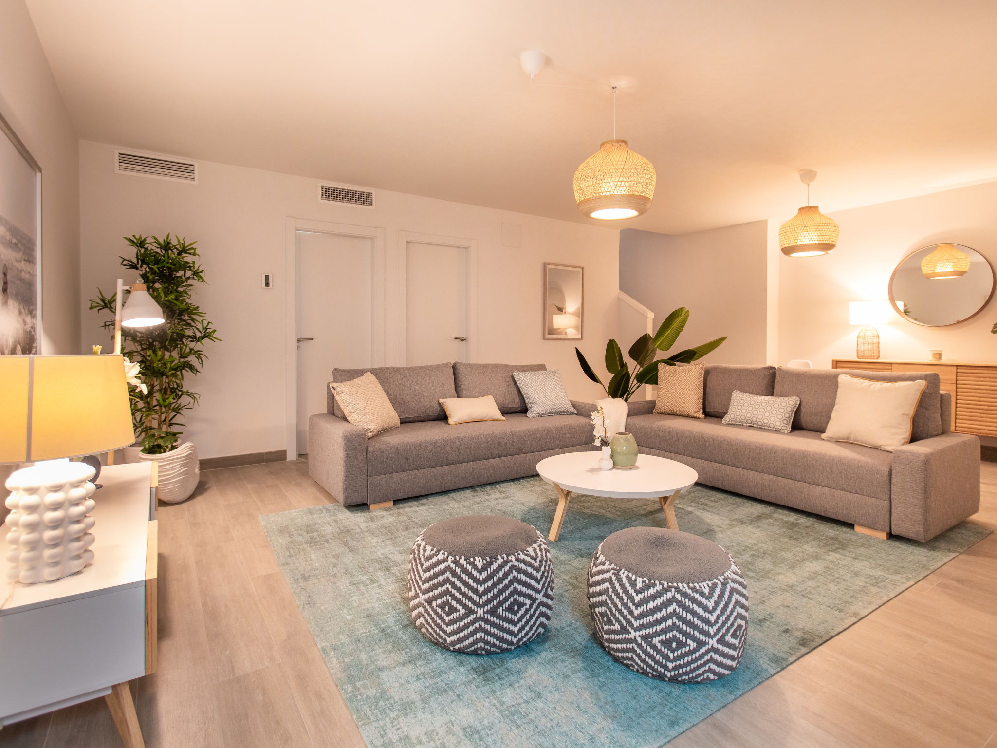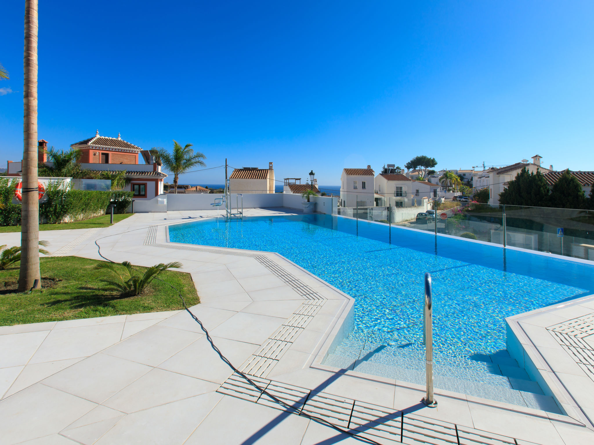 "Royal Palm", 5-Zimmer-Reihenhaus 180 m2 auf 3 Stockwerken, Südlage. Geräumig und hell, komfortabel und luxuriös eingerichtet: Wohn-/Esszimmer mit sep. WC, Digital-TV und Klimaanlage. Ausgang zur Terrasse, zum Schwimmbad. Offene Küche (Backofen, Geschirrspüler, 4 Glaskeramikherd Platten, Toaster, Wasserkocher, Mikrowelle, Tiefkühler, elektrische Kaffeemaschine). Ausgang zur Terrasse. Sep. WC. Unteres Geschoss: Salon mit 2 Diwanbetten und Klimaanlage. Dusche/WC. Obergeschoss: 1 Zimmer mit 1 franz. Bett (160 cm, Länge 200 cm), Dusche/WC und Klimaanlage. Ausgang zur Terrasse, zum Schwimmbad. 1 Zimmer mit 1 franz. Bett (160 cm, Länge 200 cm), Klimaanlage. 1 Zimmer mit 1 franz. Bett (160 cm, Länge 200 cm), Klimaanlage. Dusche/WC. 2 grosse Terrassen. Terrassenmöbel, Gartengrill, Liegestühle. Sehr schöne Sicht auf das Meer. Zur Verfügung: Waschmaschine, Bügeleisen, Kinderhochstuhl, Babybett bis 3 Jahre, Haartrockner. Internet (Wireless LAN, gratis). VFT/MA46718