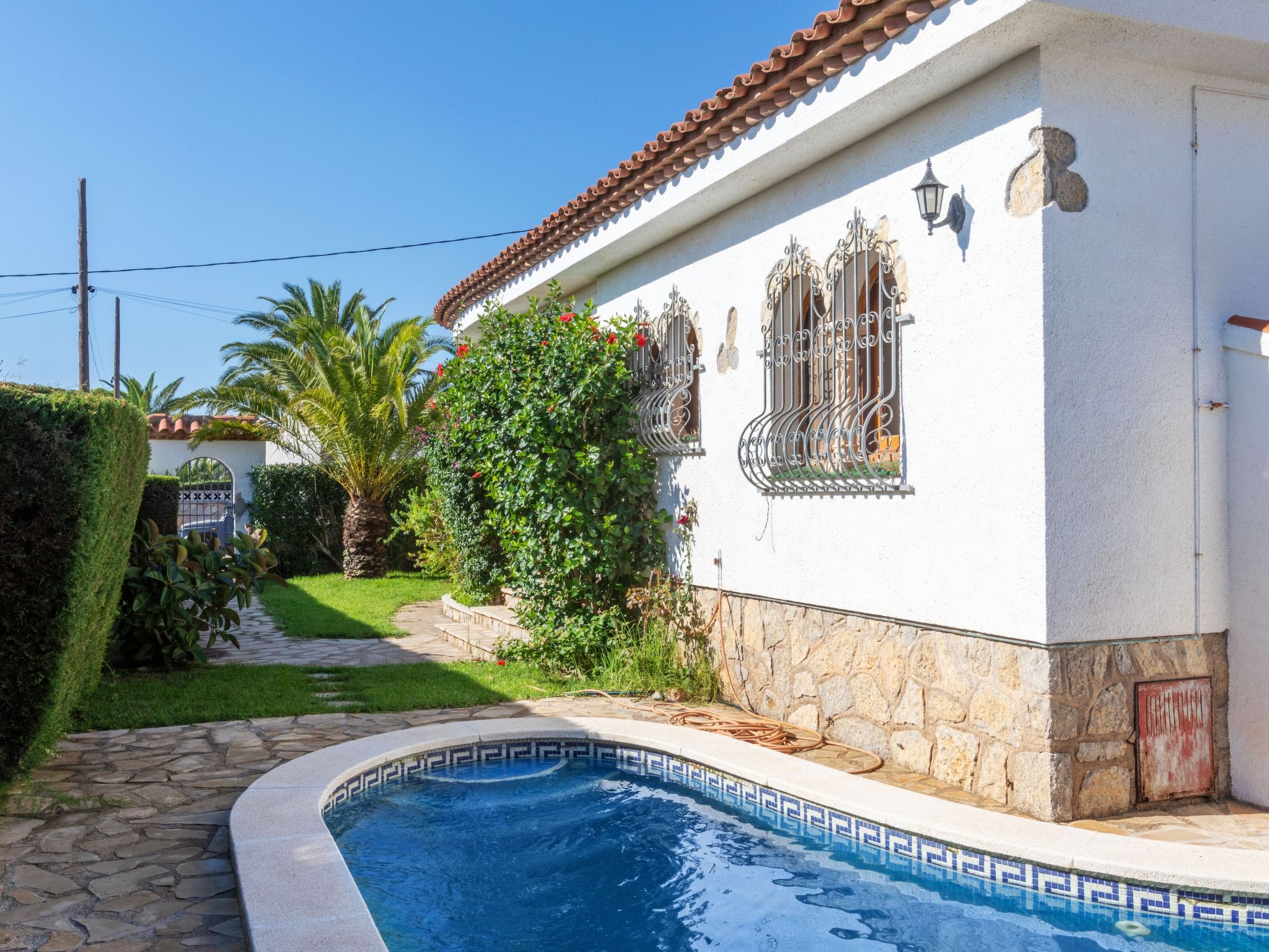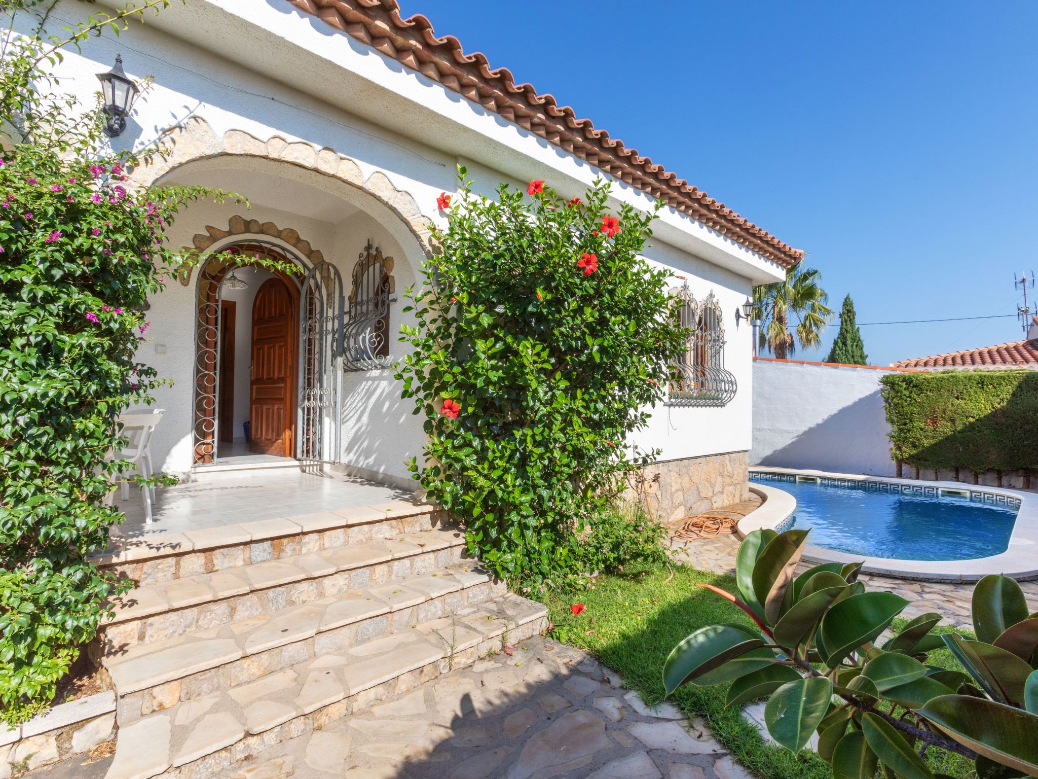 Miami Platja: Schöne, einfache, komfortable Villa "Masboquera". Im Ort, 800 m vom Zentrum von Miami Platja, ruhige, sonnige Lage, 1.7 km vom Strand, an einer Strasse. Zur Alleinbenutzung: Garten 500 m2 (eingezäunt) mit Rasen, Schwimmbad nierenförmig (9 x 4 m, 80 - 190 cm tief, 01.01.-31.12.). Pergola, Gartenmöbel, Grill, Poolpflege durch den Besitzer/Gärtner Parkplatz beim Haus, Einzelgarage. Einkaufsgeschäft 800 m, Supermarkt 1 km, Einkaufszentrum 1 km, Restaurant 500 m, Bäckerei 1 km, Internet-Café 1 km, Bushaltestelle 1.2 km, Bahnstation 3.7 km, Sandstrand 1.3 km, Tauchzentrum 4 km. Sporthafen 4 km, Golfplatz 6 km, Reitstall 6 km. Nahe gelegene Sehenswürdigkeiten: Parque Portaventura 28 km, parque acuático Aquopolis 31 km, parque Natural del Delta del Ebro 53 km, Tarragona 37 km, Reus 30 km, Barcelona 132 km.