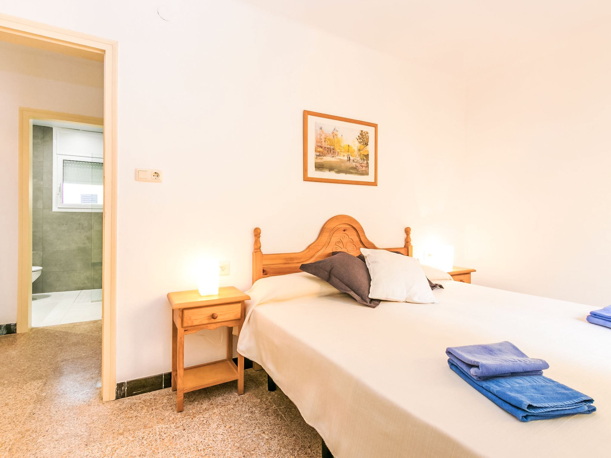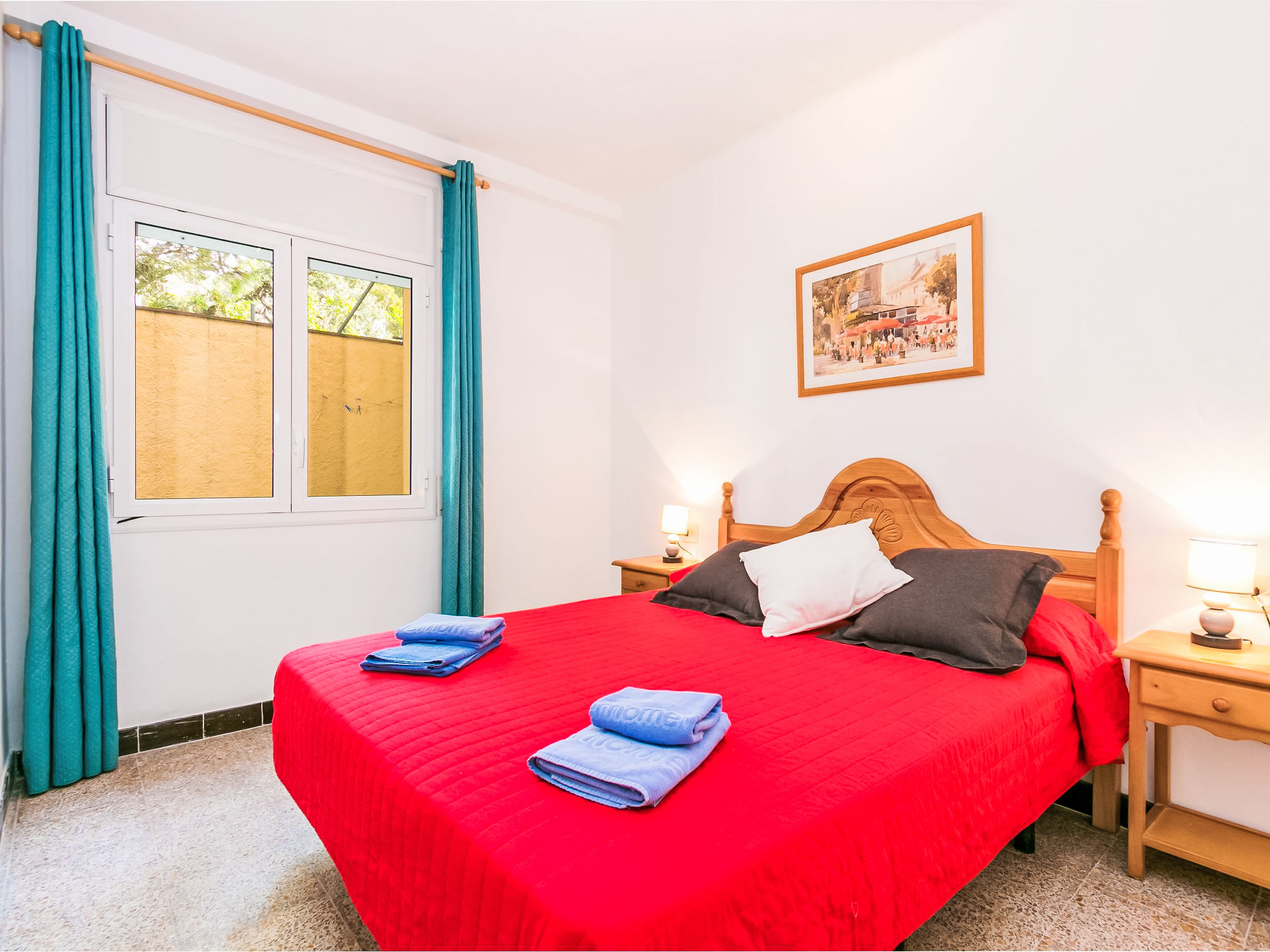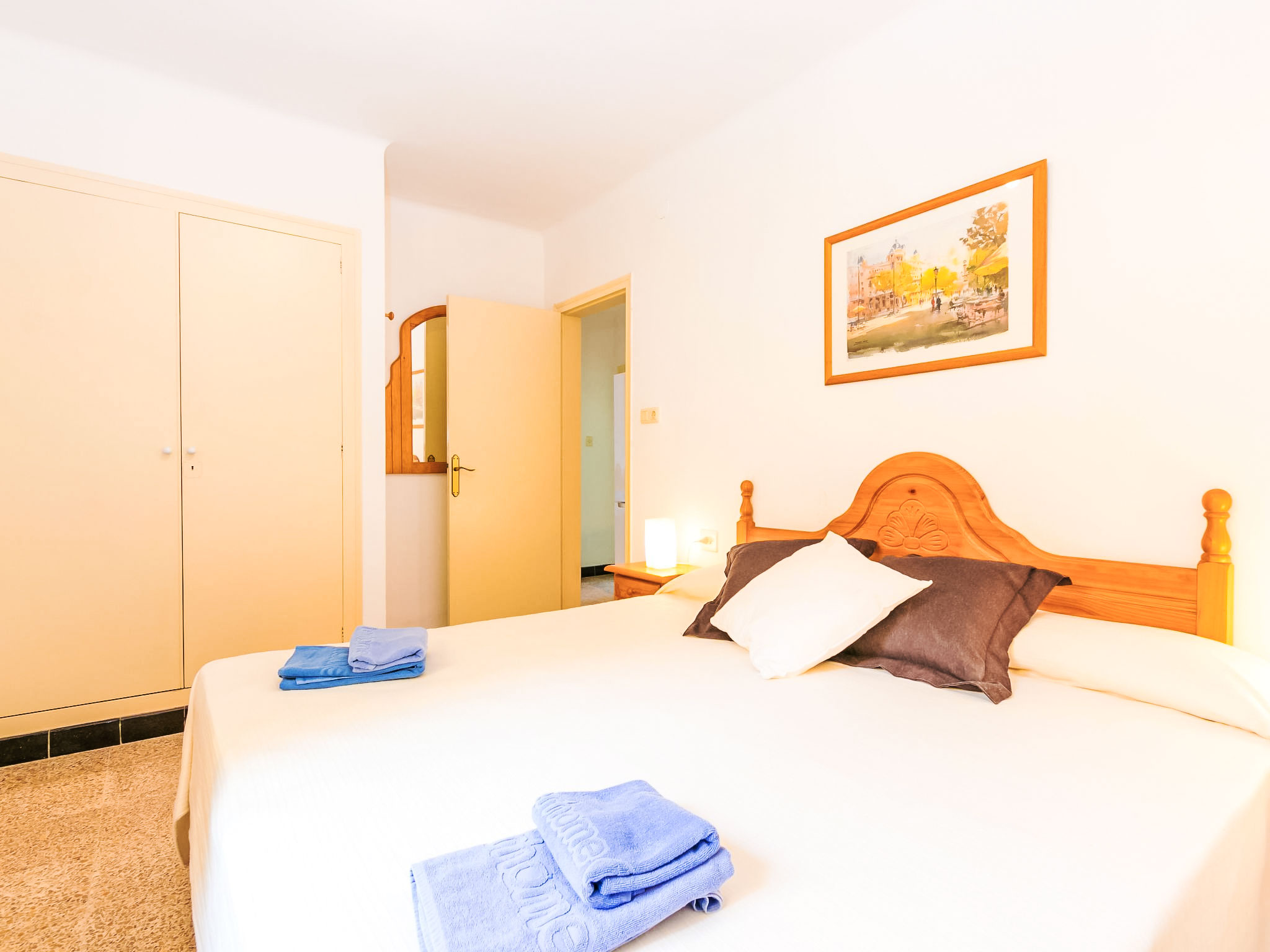 4-Zimmer-Wohnung 83 m2. Hell, zweckmässig und komfortabel eingerichtet: Wohn-/Esszimmer mit Sat-TV und Digital-TV (Flachbildschirm). Ausgang zur Terrasse. 2 Zimmer, jedes Zimmer mit 2 Betten (90 cm). 1 Zimmer mit 1 franz. Bett (150 cm). Küche (4 Glaskeramikherd Platten, Toaster, Mikrowelle, Tiefkühler, elektrische Kaffeemaschine). Dusche/WC. Zur Verfügung: Waschmaschine. Internet (Wireless LAN, gratis). Garage Nr. 5. Bitte beachten: Parkplatz nur für kleine Wagen. TV nur ES, DE. Maße der Garage von Wand zu Wand: Länge 4,80 x Breite 2,40. HUTG007516