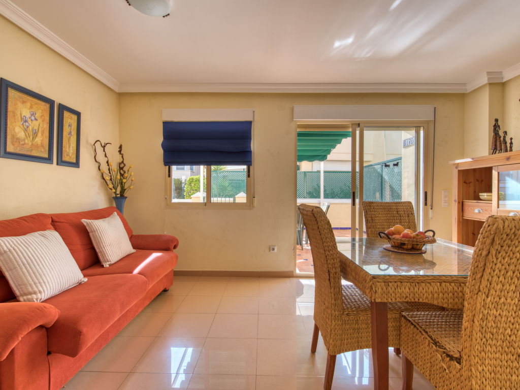 "Medina Sol I", 3-Zimmer-Wohnung im Erdgeschoss. Komfortabel und gemütlich eingerichtet: Wohn-/Esszimmer mit Digital-TV, Klimaanlage und Warmluftheizung. Ausgang zur Terrasse, zum Schwimmbad. 1 Zimmer mit 1 franz. Bett (140 cm, Länge 190 cm), Bad/Bidet/WC, Klimaanlage und Warmluftheizung. 1 Zimmer mit 2 Betten (90 cm, Länge 180 cm), Klimaanlage und Warmluftheizung. Küche (Backofen, 4 Glaskeramikherd Platten, Toaster, Wasserkocher, Mikrowelle, Tiefkühler, elektrische Kaffeemaschine). Dusche/WC. Grosse Terrasse 38 m2, überdacht, Südlage, grosse Terrasse 31 m2, überdacht, Nordlage. Terrassenmöbel, Gartengrill. Zur Verfügung: Waschmaschine, Bügeleisen, Kinderhochstuhl, Babybett, Haartrockner. Bitte beachten: geeignet für Familien. TV nur ES. R0000000001