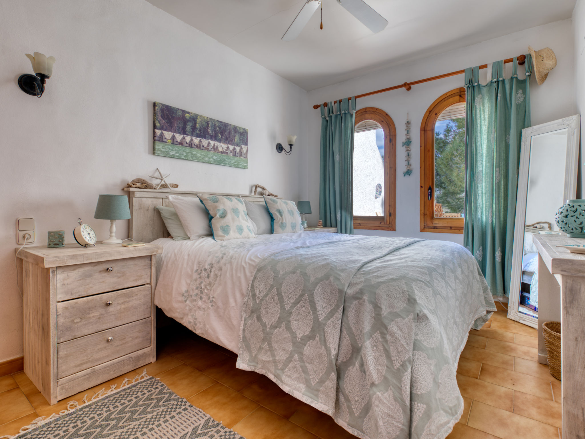 "Los Lagos", 2-Zimmer-Wohnung 59 m2. Wohn-/Esszimmer mit 1 Diwanbett, Digital-TV und Ventilator. Ausgang zur Terrasse, zum Schwimmbad. 1 Zimmer mit 1 franz. Bett (150 cm, Länge 190 cm), Ventilator. Offene Küche (Backofen, 3 Glaskeramikherd Platten, Mikrowelle, Tiefkühler, elektrische Kaffeemaschine). Bad/Dusche/Bidet/WC. Terrassenmöbel. Zur Verfügung: Waschmaschine, Bügeleisen, Kinderhochstuhl, Babybett, Haartrockner. Internet (Wireless LAN, gratis). AT-465046-A