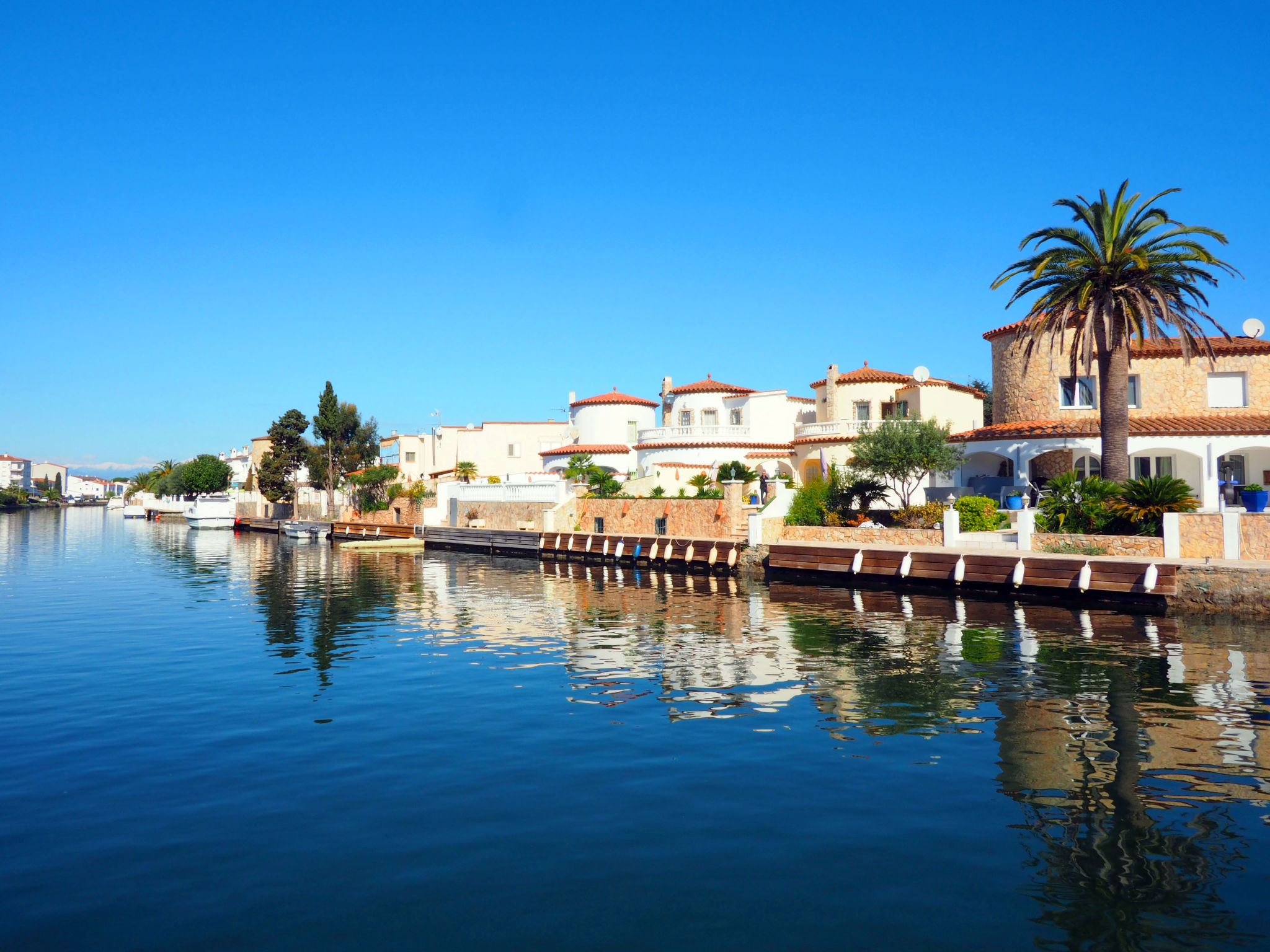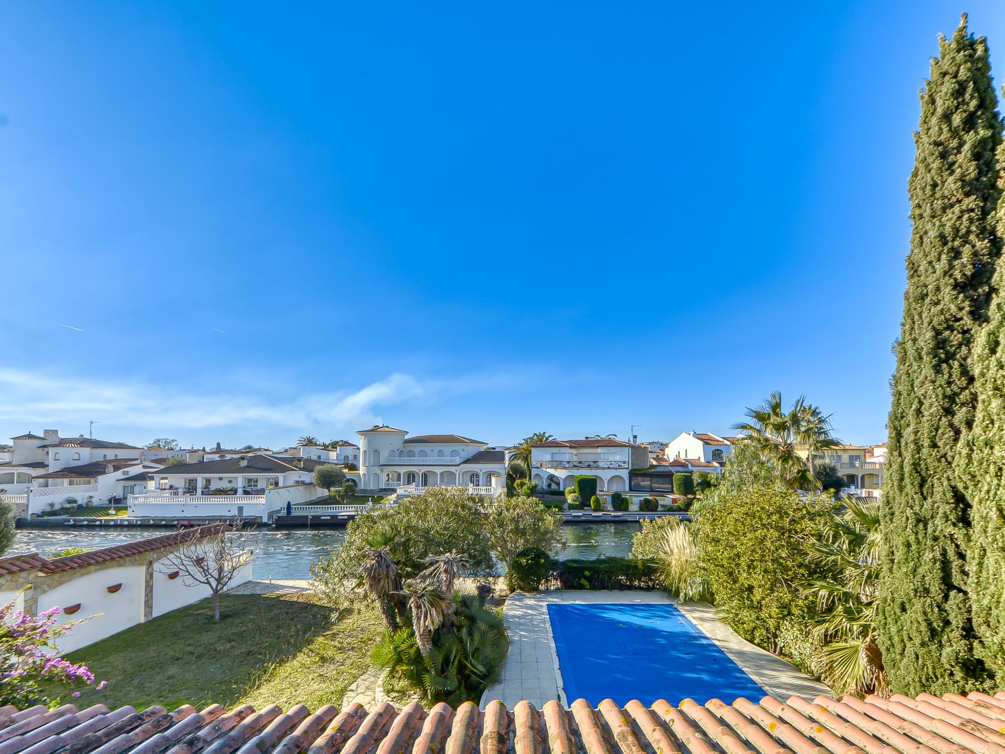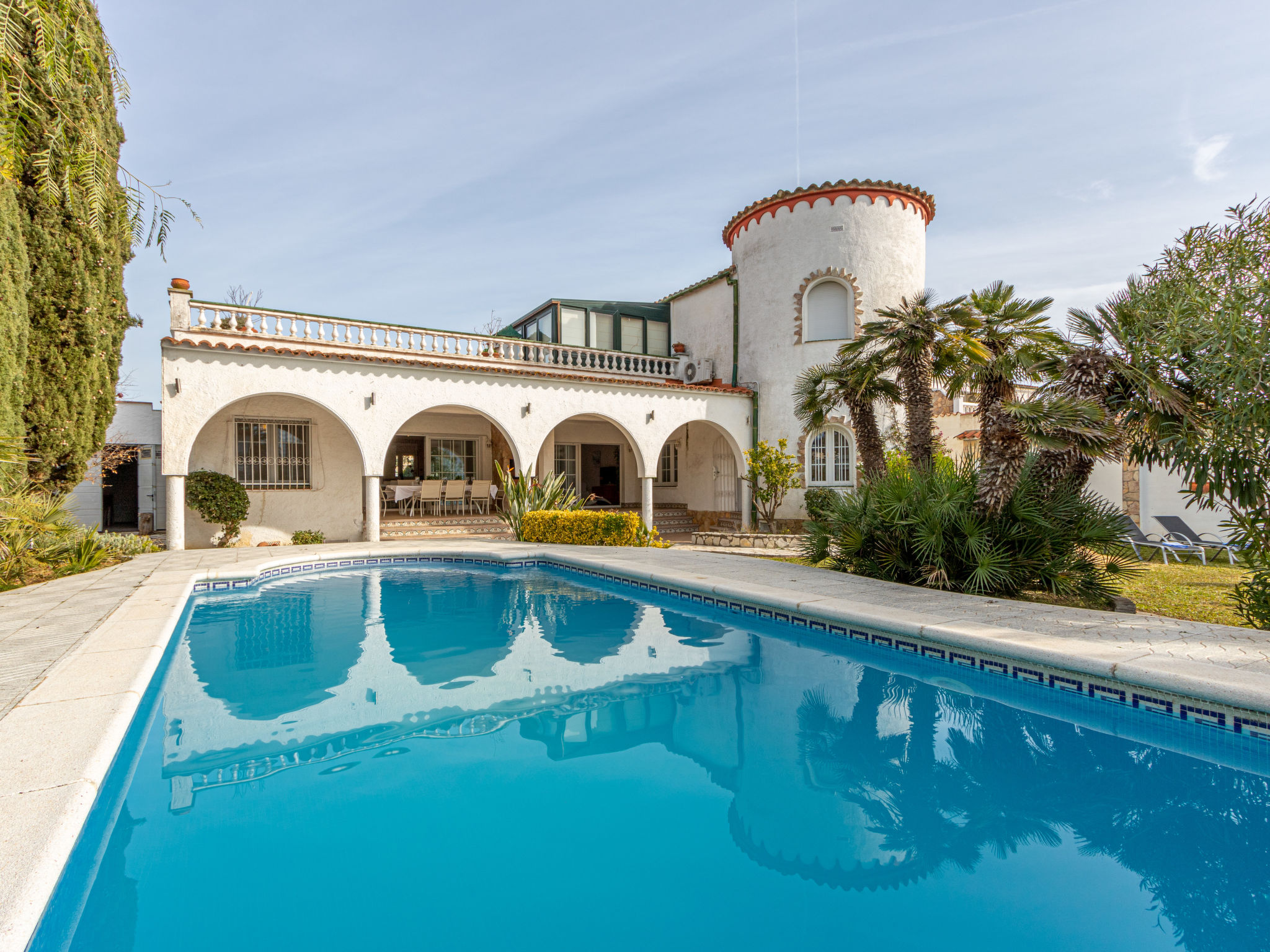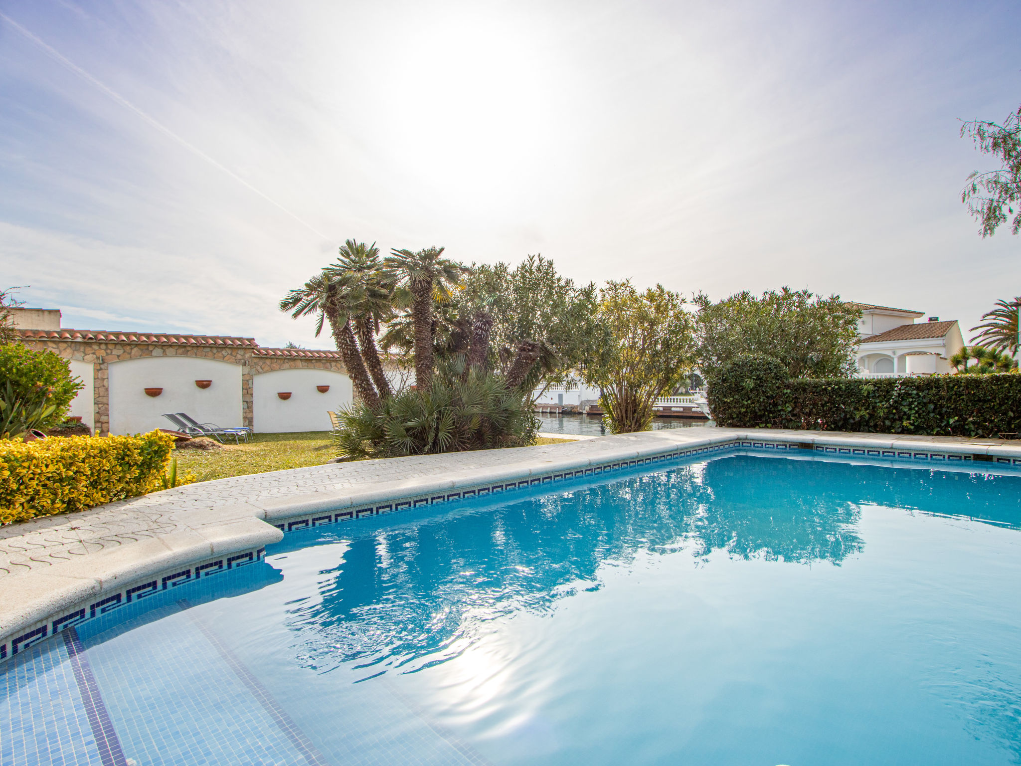 Casa al canal: Sehr grosses, modernes, gemütliches Einfamilienhaus "Residencia Marítima", renoviert. Im Ortsteil Pení, 1.5 km vom Zentrum von Empuriabrava, ruhige, sonnige Lage im Villenviertel, verkehrsberuhigte Zone, 1.6 km vom Meer, 1.6 km vom Strand, direkt am Kanal. Zur Alleinbenutzung: grosser, schöner Garten mit Rasen und Pflanzen, Schwimmbad eckig (8 x 4 m, 100 - 190 cm tief, 01.01.-31.12.). Laube, Terrasse, Gartenmöbel, Grill. Im Hause: Waschmaschine. Parkplatz (für 3 Autos) beim Haus auf dem Grundstück. Einkaufsgeschäft, Lebensmittelgeschäft 350 m, Supermarkt, Restaurant, Bar 400 m, Bäckerei 350 m, Sandstrand "Empuriabrava" 1.6 km. Sporthafen 2 km, Golfplatz (18 Loch) 15 km, Surfschule 1.5 km, Segelschule 1.5 km, Minigolf 800 m, Reitstall 2 km, Wanderwege ab Haus 600 m, Radweg 400 m. Nahe gelegene Sehenswürdigkeiten: Centro paracaidismo y túnel del viento 2 km, Parque Acuático Roses 6 km, Museo Dalí Figueres 15 km, Castillo de Perelada 12 km, Ruïnas de St. Martí de Empúries 21 km, Monasterio de Sant Pere de Rodes 23 km. Bitte beachten: Jugendgruppen nur auf Anfrage. Private Bootsanlegestelle, auf Anfrage.
