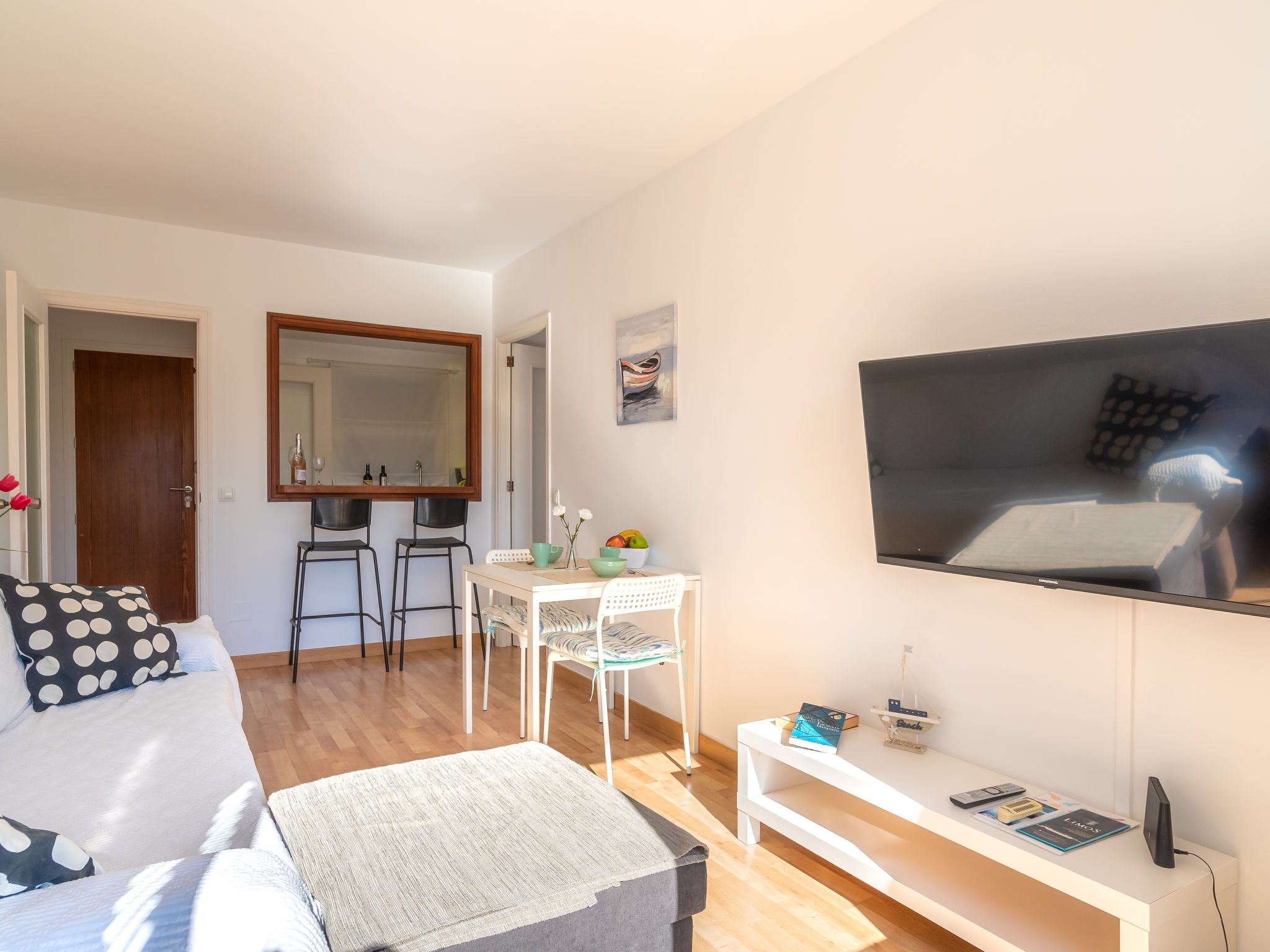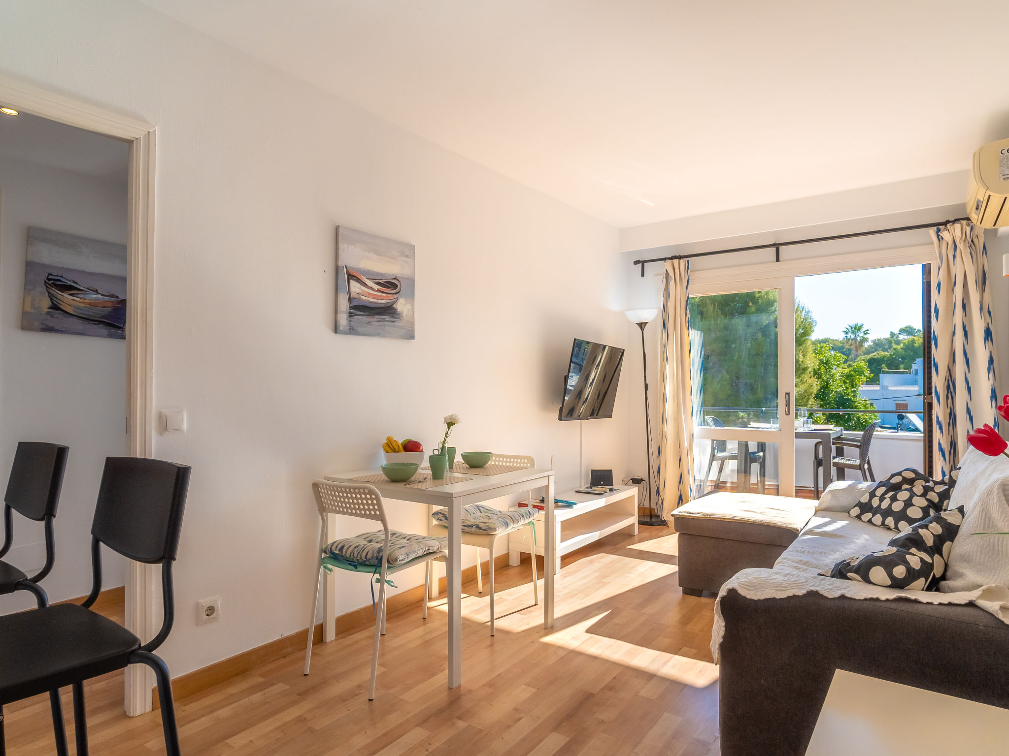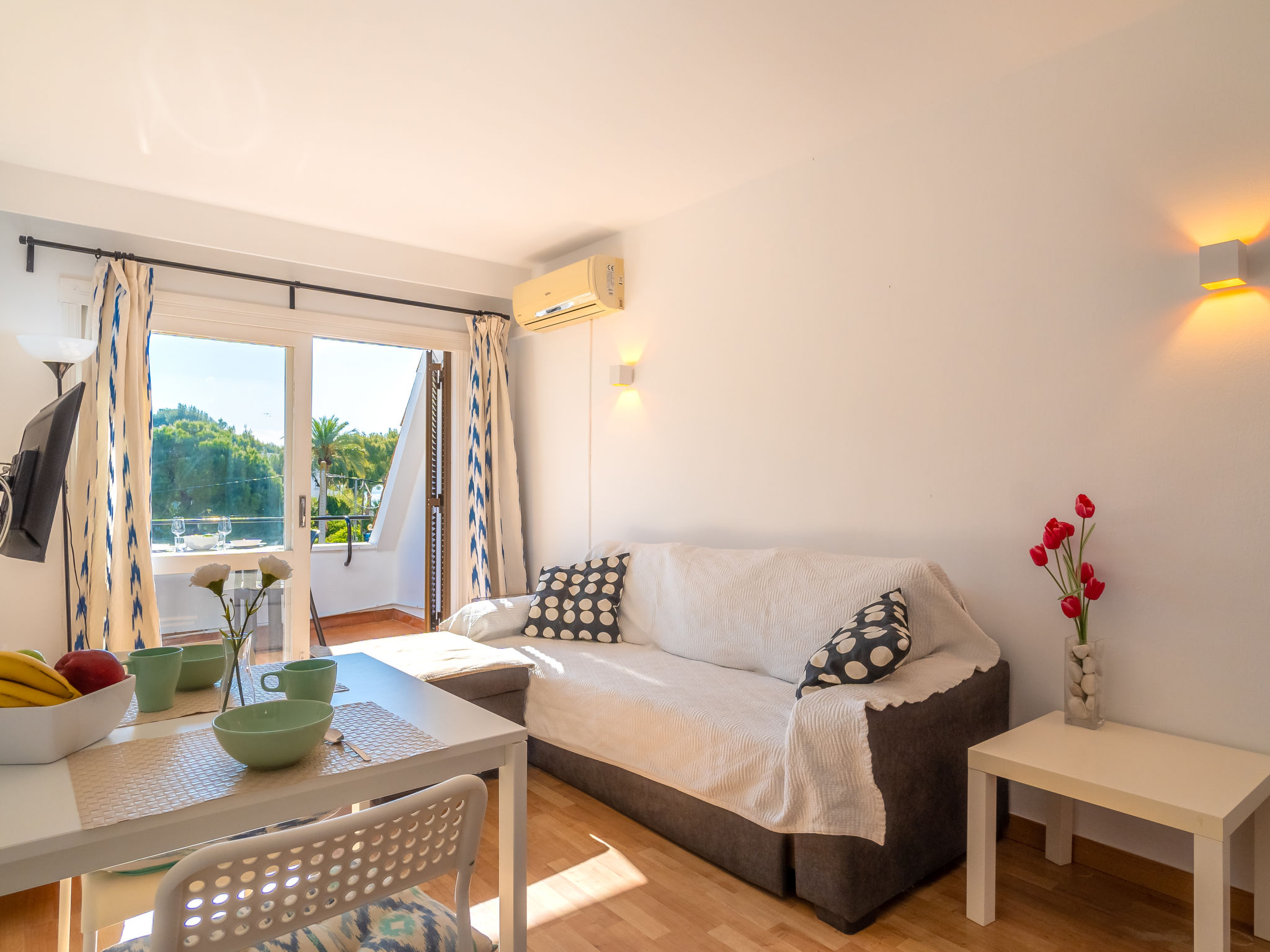 "Las Sirenas", 1-Zimmer-Wohnung 46 m2. Objekt geeignet für 2 Erwachsene. Hell, komfortabel eingerichtet: Wohn-/Esszimmer mit Panoramafenster mit 1 Diwanbett, Esstisch, Sat-TV, Digital-TV, Flachbildschirm, Klimaanlage und Warmluftheizung. Ausgang zur Terrasse. 1 Doppelzimmer mit 1 Doppelbett (150 cm, Länge 200 cm). Ausgang zur Terrasse. Kleine Küche (3 Induktionskochplatten, Toaster, Wasserkocher, Mikrowelle, Tiefkühler) mit Bar. Bad oder Dusche/WC. Grosser Balkon, grosse Terrasse. Terrassenmöbel, Balkonmöbel, Gartengrill, Liegestühle (2). Sicht auf die Ortschaft. Zur Verfügung: Waschmaschine, Bügeleisen, Kinderhochstuhl, Babybett bis 2 Jahre, Haartrockner. Internet (Wireless LAN, gratis). Parkplatz (eingezäunt, 1 Auto) beim Haus. Geeignet für Familien. 20214423
