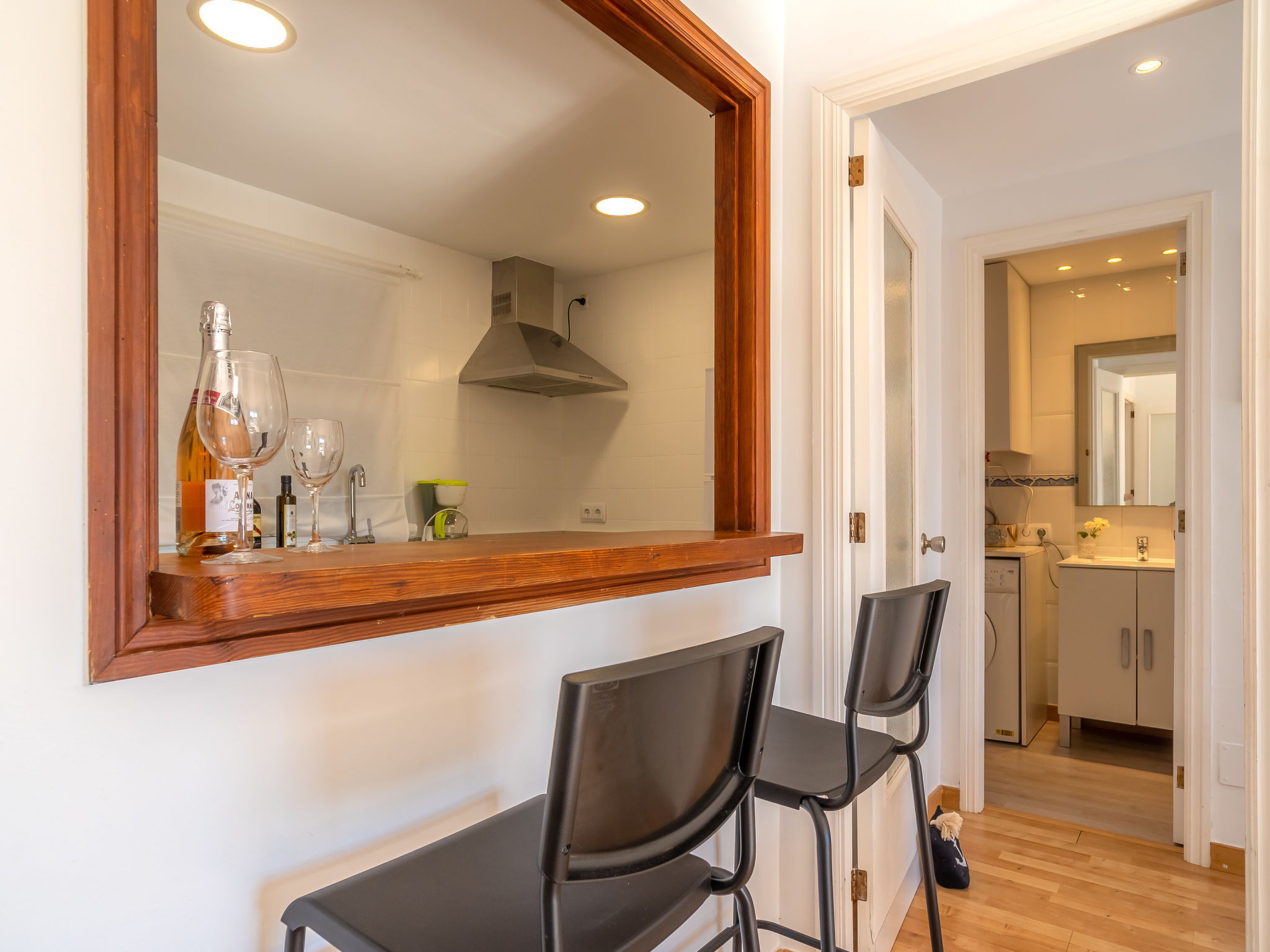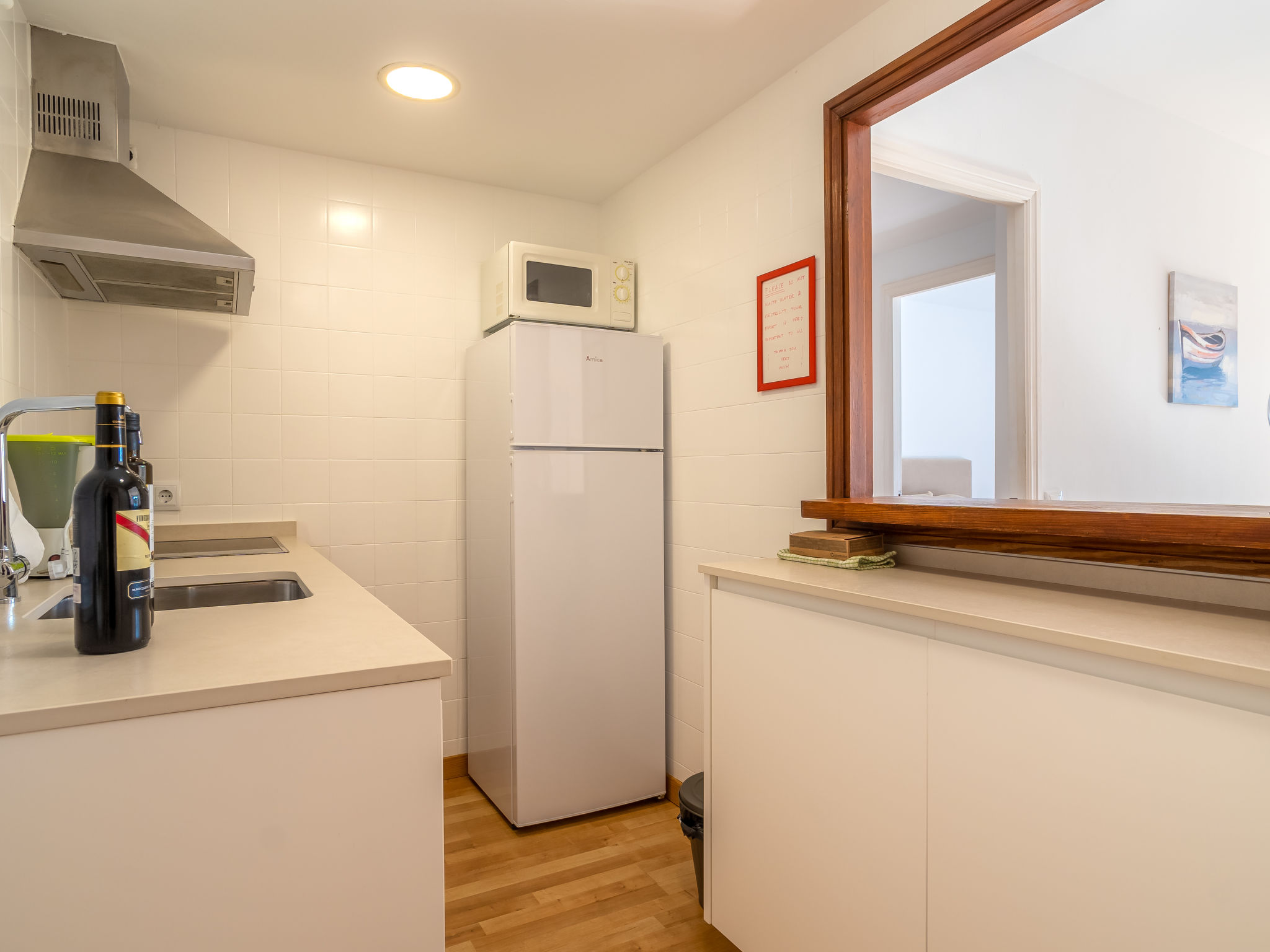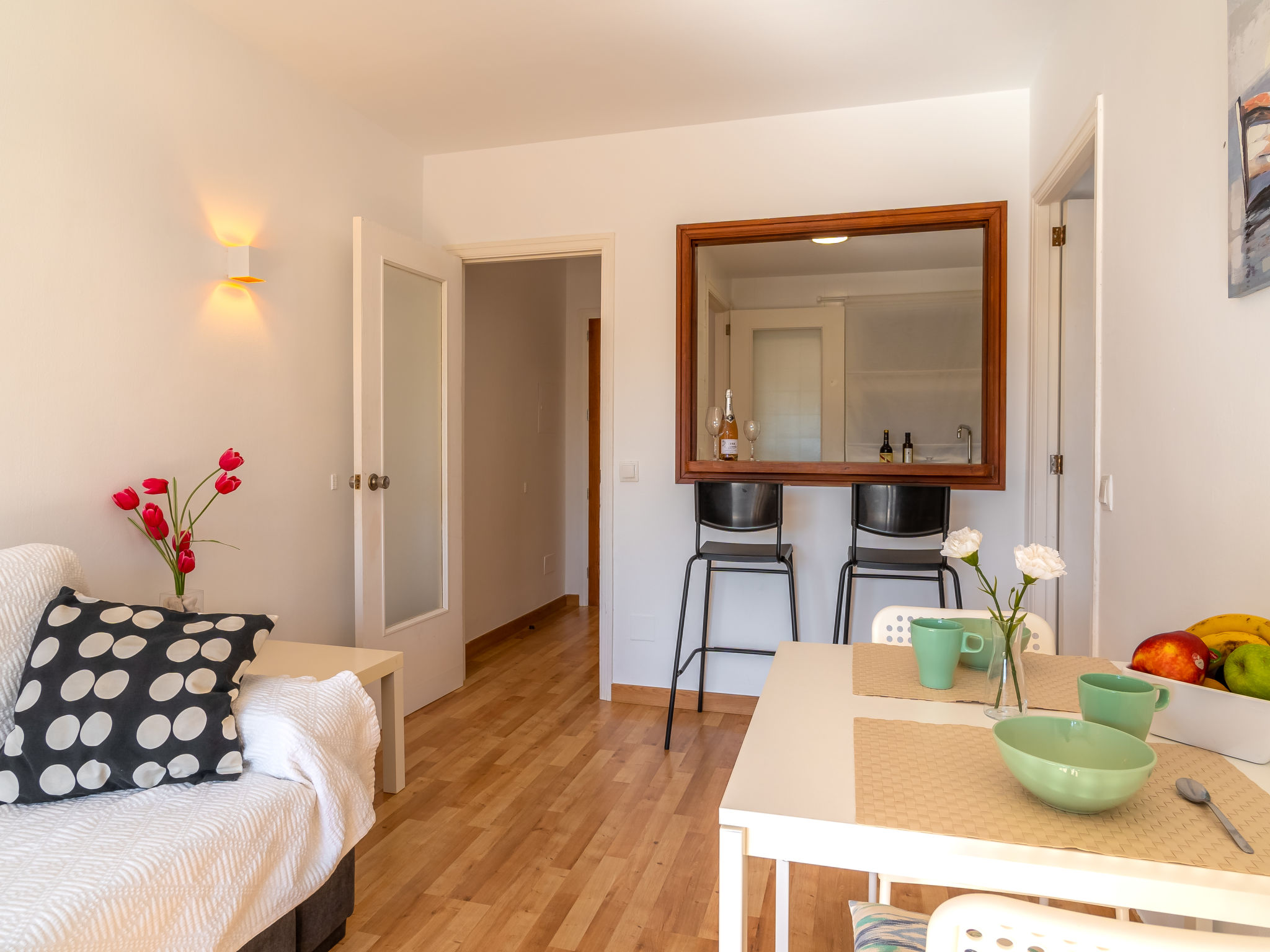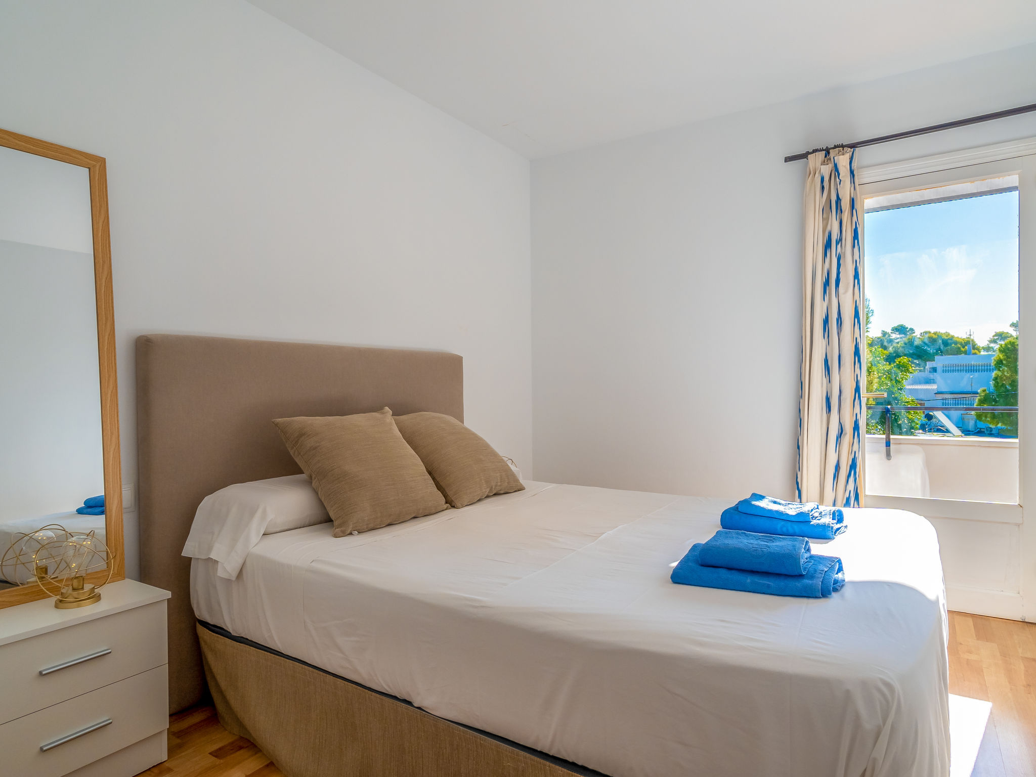"Las Sirenas", 1-Zimmer-Wohnung 46 m2. Objekt geeignet für 2 Erwachsene. Hell, komfortabel eingerichtet: Wohn-/Esszimmer mit Panoramafenster mit 1 Diwanbett, Esstisch, Sat-TV, Digital-TV, Flachbildschirm, Klimaanlage und Warmluftheizung. Ausgang zur Terrasse. 1 Doppelzimmer mit 1 Doppelbett (150 cm, Länge 200 cm). Ausgang zur Terrasse. Kleine Küche (3 Induktionskochplatten, Toaster, Wasserkocher, Mikrowelle, Tiefkühler) mit Bar. Bad oder Dusche/WC. Grosser Balkon, grosse Terrasse. Terrassenmöbel, Balkonmöbel, Gartengrill, Liegestühle (2). Sicht auf die Ortschaft. Zur Verfügung: Waschmaschine, Bügeleisen, Kinderhochstuhl, Babybett bis 2 Jahre, Haartrockner. Internet (Wireless LAN, gratis). Parkplatz (eingezäunt, 1 Auto) beim Haus. Geeignet für Familien. 20214423