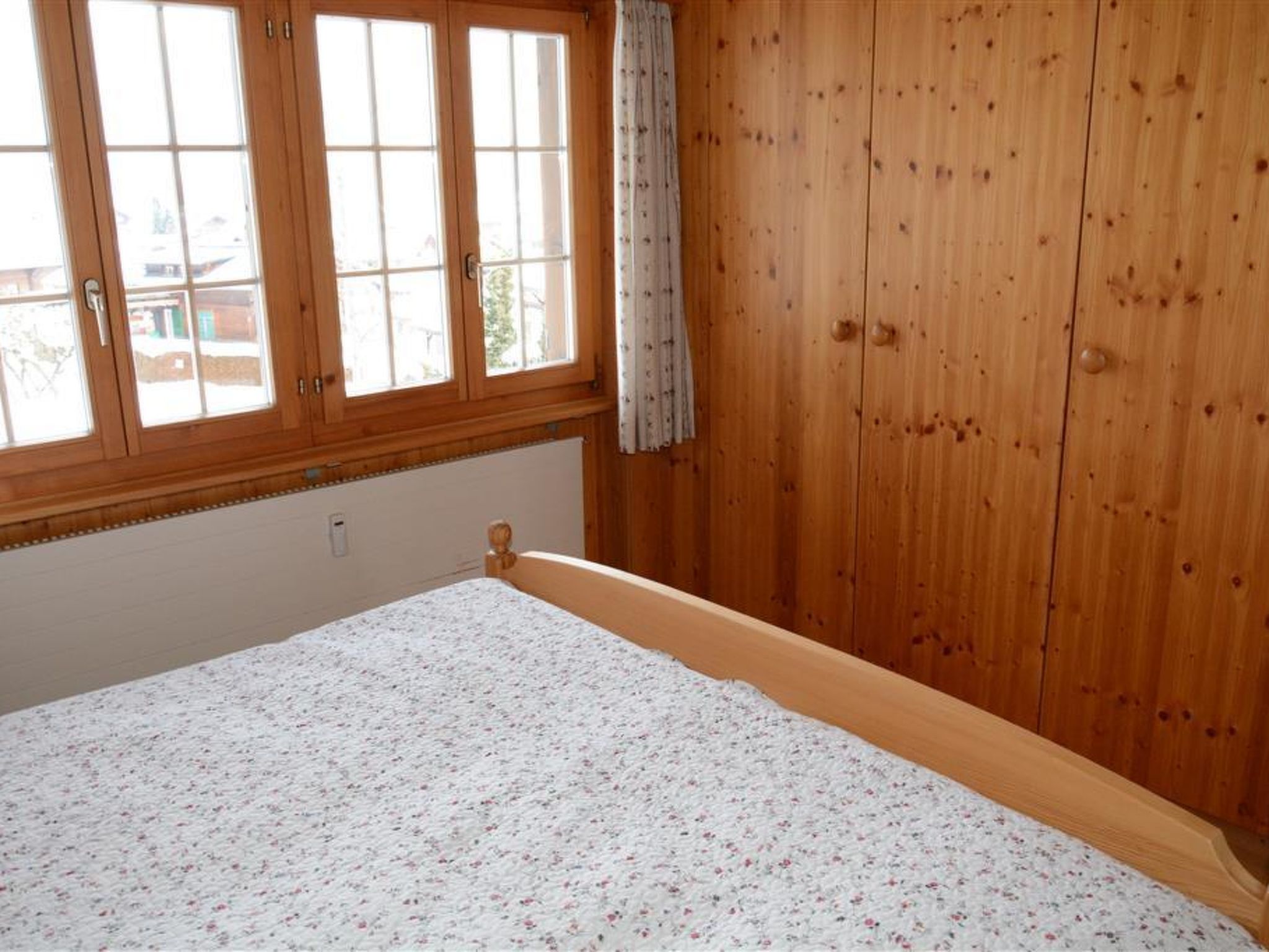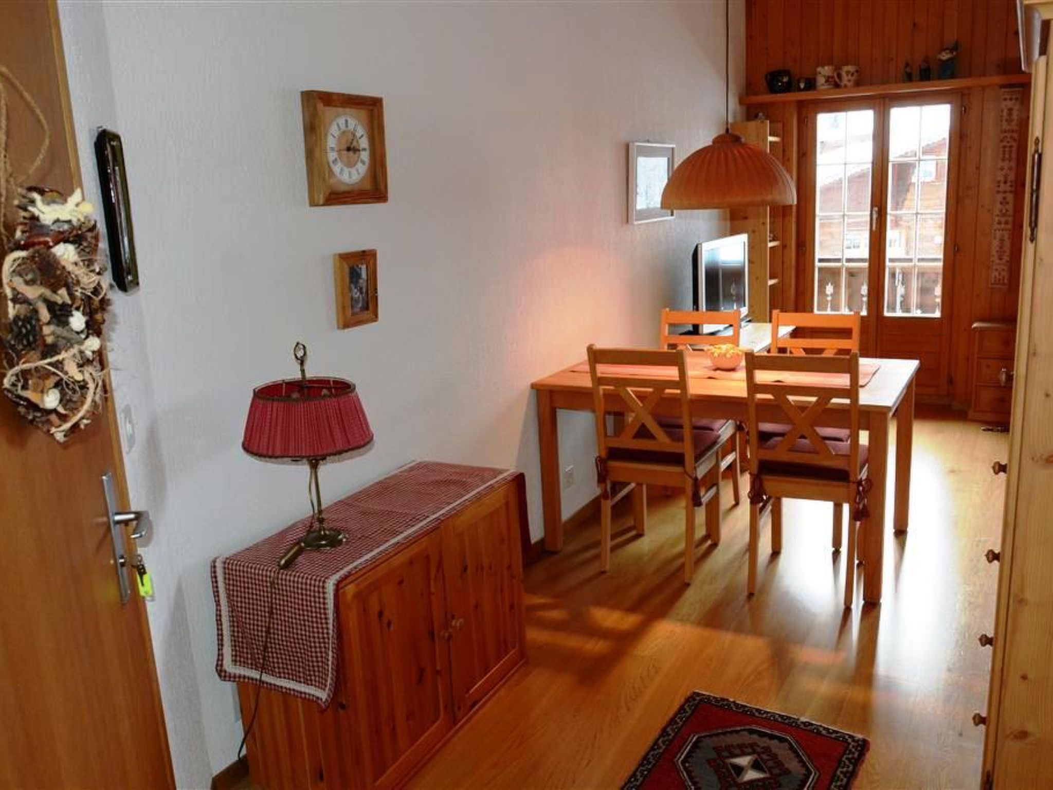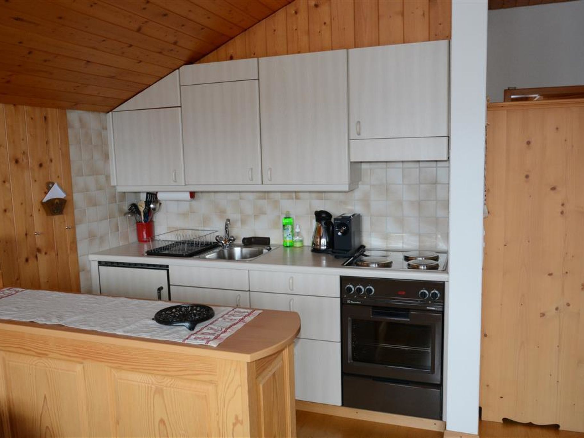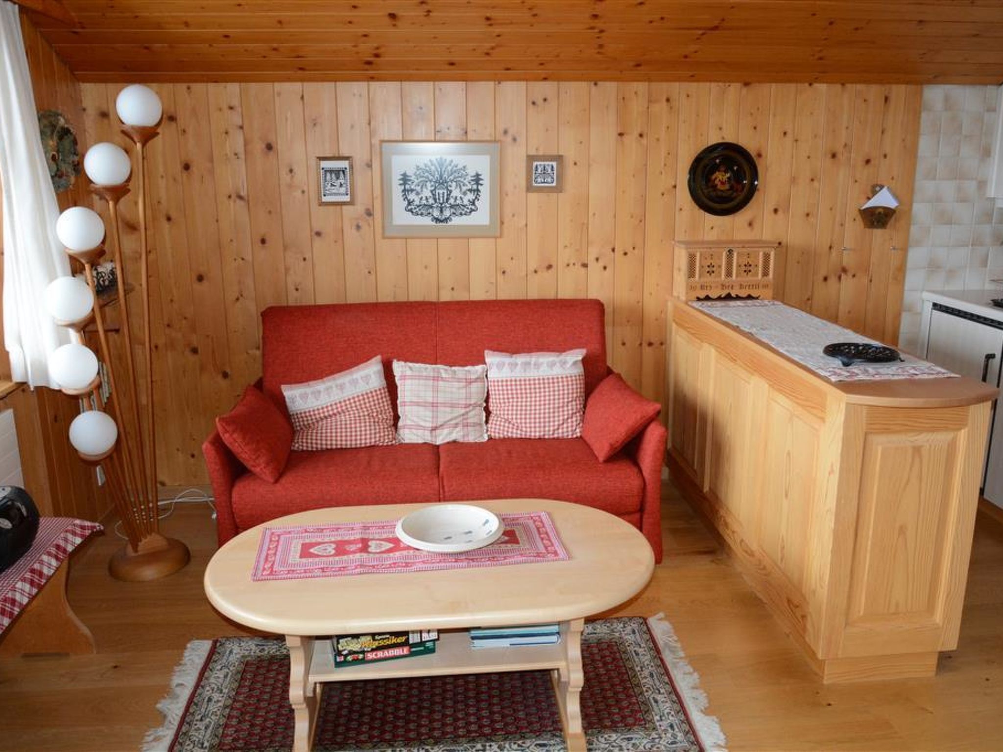 Wohnzimmer mit Essecke, Ausziehsofa (150x190cm), TV/Radio/CD und offener Küche (u.a. ausgestattet mit Kapsel-Kaffeemaschine (Delizio), Fondue-, Raclette-Set und Backofen). Badezimmer mit Badewanne/WC. 1 Doppelschlafzimmer (2x90x200cm) mit Kleiderschrank. WiFi.
