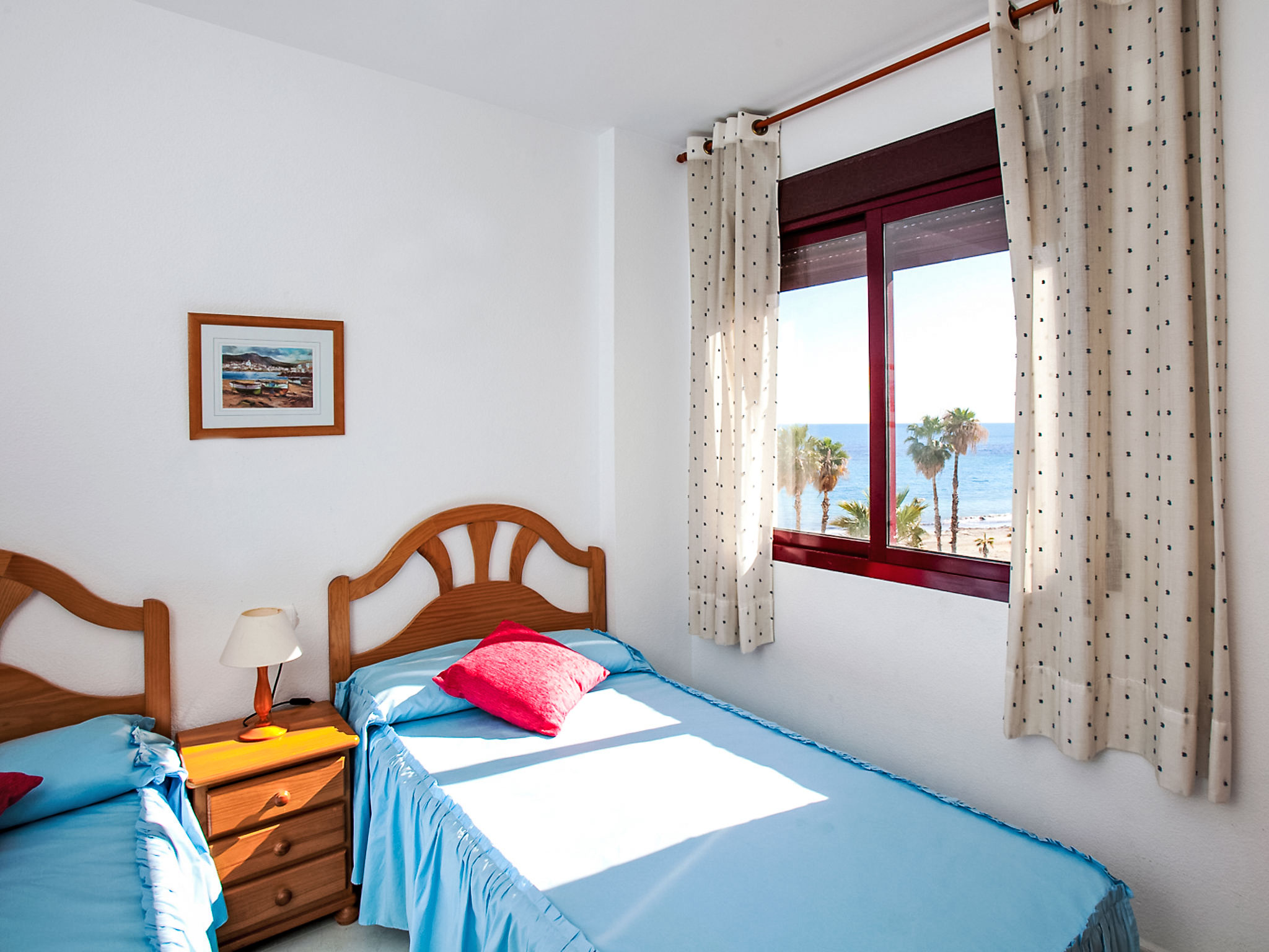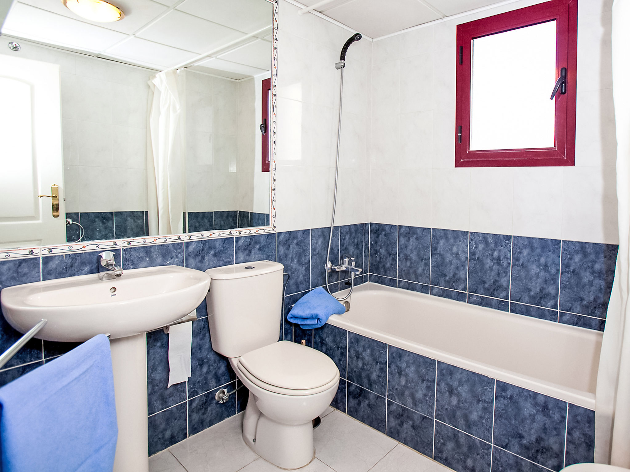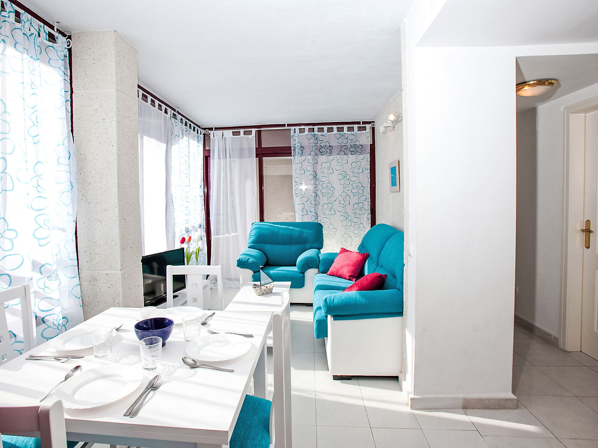 "Topacio IV", 3-Zimmer-Wohnung 63 m2 im 4. Stock. Hell, zweckmässig und schön eingerichtet: Wohn-/Esszimmer mit Digital-TV, Internationale TV-Sender, Klimaanlage, Warmluftheizung und Boiler. Ausgang zur Terrasse. 1 Zimmer mit 2 Betten (90 cm, Länge 180 cm). 1 Zimmer mit 1 franz. Bett (135 cm, Länge 190 cm). Offene Küche (Backofen, 3 Glaskeramikherd Platten, Mikrowelle, elektrische Kaffeemaschine) mit Esstisch. Bad/Bidet/WC. Kleine Terrasse. Terrassenmöbel. Seitliche Sicht auf das Meer. Zur Verfügung: Waschmaschine, Bügeleisen. Internet (Wireless LAN, gratis). Garage Nr. 35. Bitte beachten: geeignet für Familien. Parkplatz nur für kleine Wagen. AT-440236-A