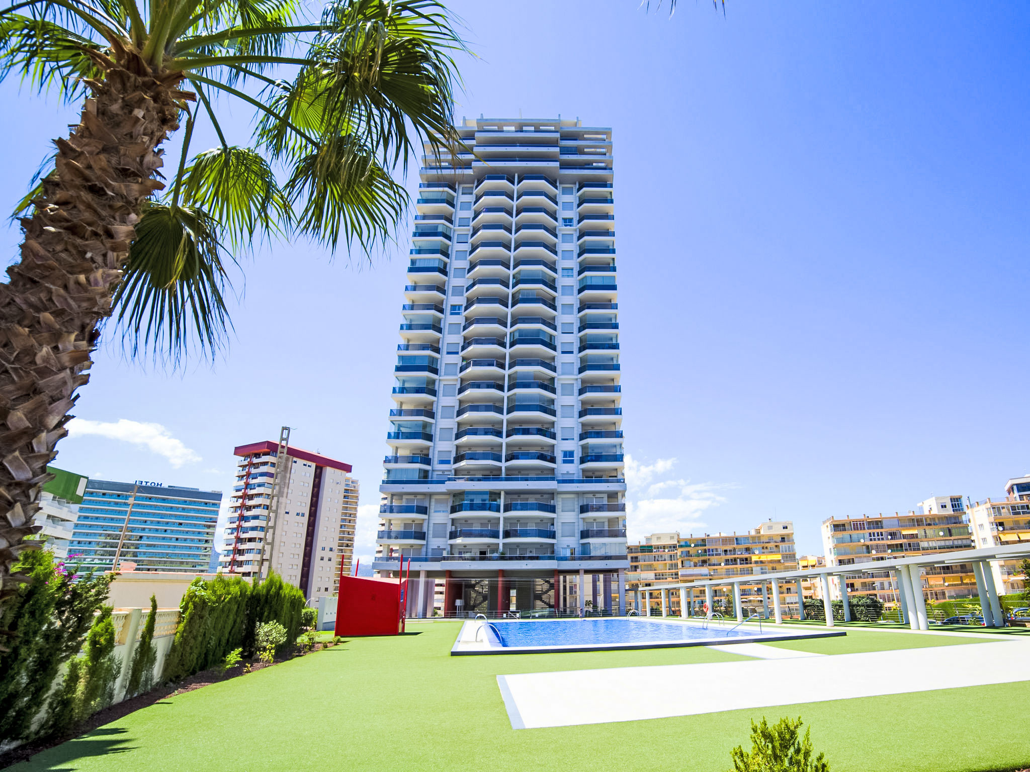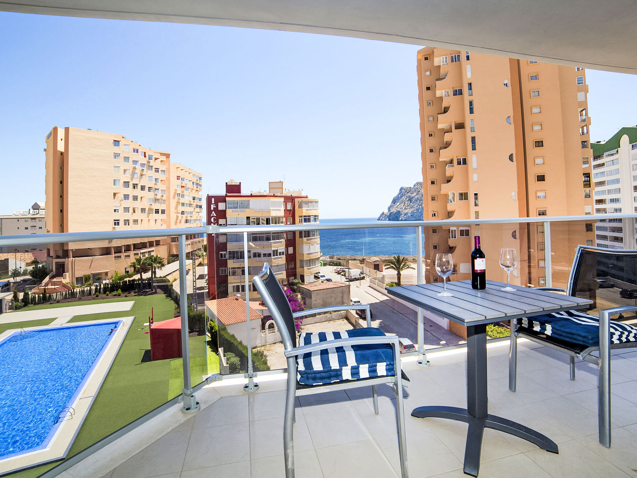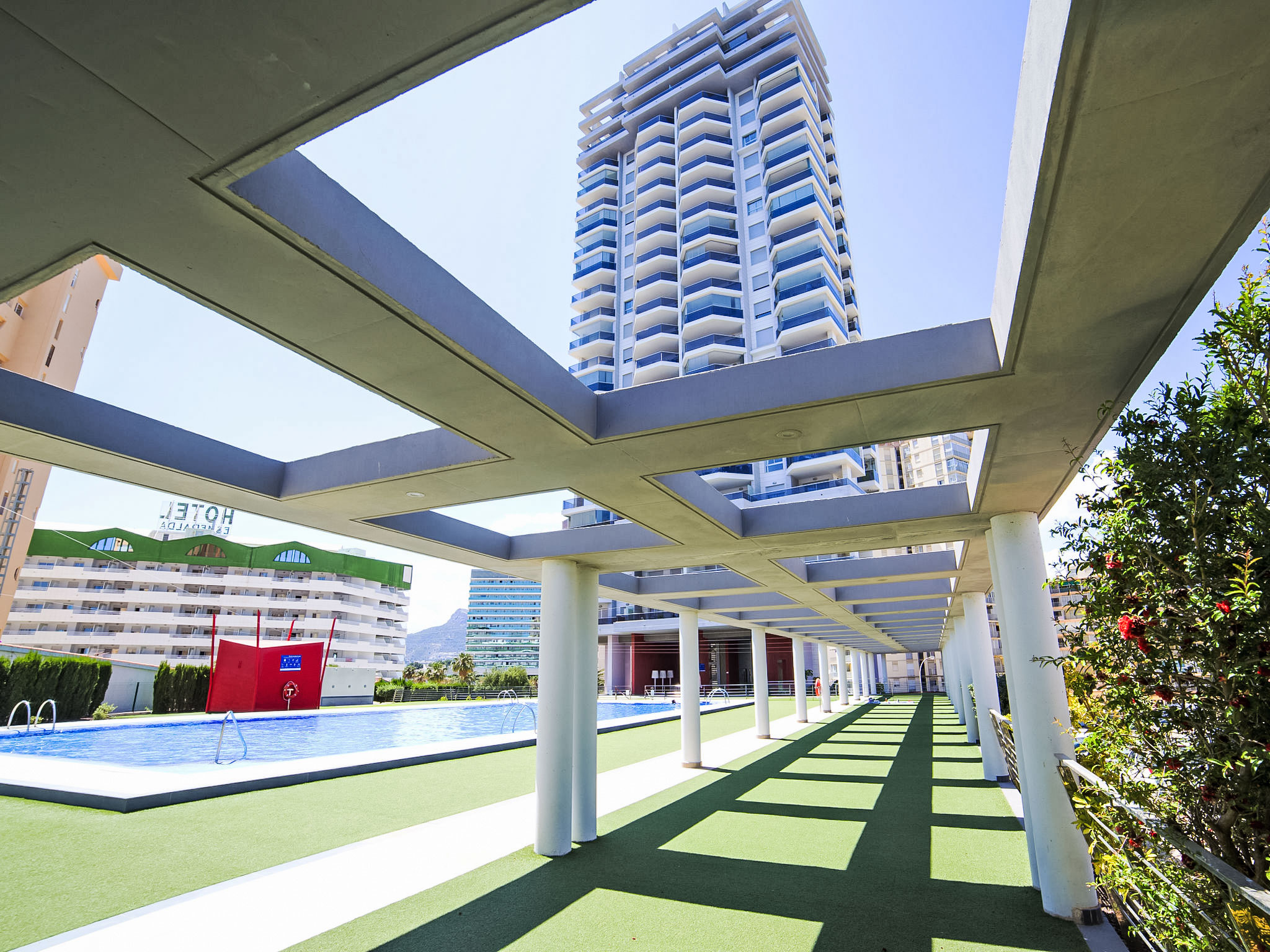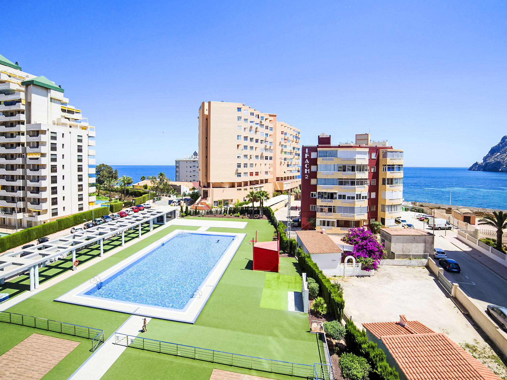 Playa de la Fossa: Grosses, sehr schönes Appartementhaus "Entremares". Im Ort, 3.6 km vom Zentrum von Calpe, ruhige, sonnige Lage, 200 m vom Meer, 250 m vom Strand, in einer Sackgasse. Zur Mitbenutzung: Grundstück (eingezäunt), Schwimmbad (saisonale Verfügbarkeit: 01.Jan.-31.Dez.). Aussendusche. Im Hause: Fahrstuhl. Lebensmittelgeschäft, Supermarkt 350 m, Restaurant 300 m, Bäckerei 350 m, Café 65 m, Fahrradverleih 170 m, Sandstrand "Playa de la Fossa" 300 m. Sporthafen 2.4 km, Jacht-Hafen 2.4 km, Golfplatz 9.9 km. Nahe gelegene Sehenswürdigkeiten: Aqualandia, Mundomar, Terra Mítica, Les Fonts de l'Algar, Terra Natura, Benidorm Palace (Benidorm), Castillo de Guadalest.