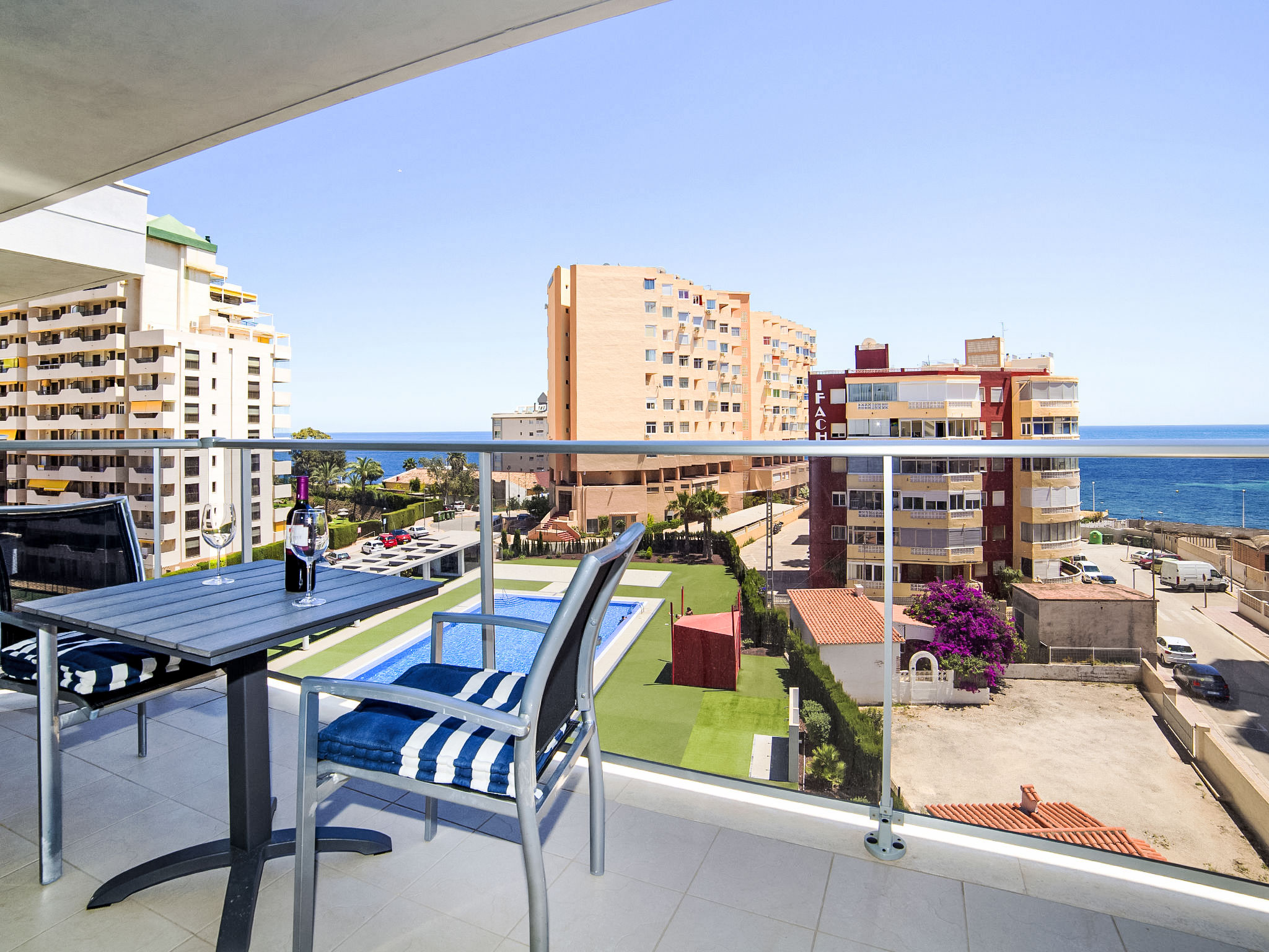 "Entremares", 2-Zimmer-Wohnung 53 m2 im 3. Stock. Geräumig und hell, schön und modern eingerichtet: Wohn-/Esszimmer mit 1 Diwanbett, Digital-TV, Klimaanlage und Warmluftheizung. Ausgang zur Terrasse. 1 Zimmer mit 1 franz. Bett, Klimaanlage und Warmluftheizung. Offene Küche (Backofen, Geschirrspüler, 3 Glaskeramikherd Platten, Mikrowelle). Dusche/Bidet/WC. Terrasse 20 m2. Terrassenmöbel. Sicht auf das Meer, das Schwimmbad und das Städtchen. Zur Verfügung: Waschmaschine. Internet (Wireless LAN, gratis). Parkplatz Nr. 11 (überdacht). AT-468365-A