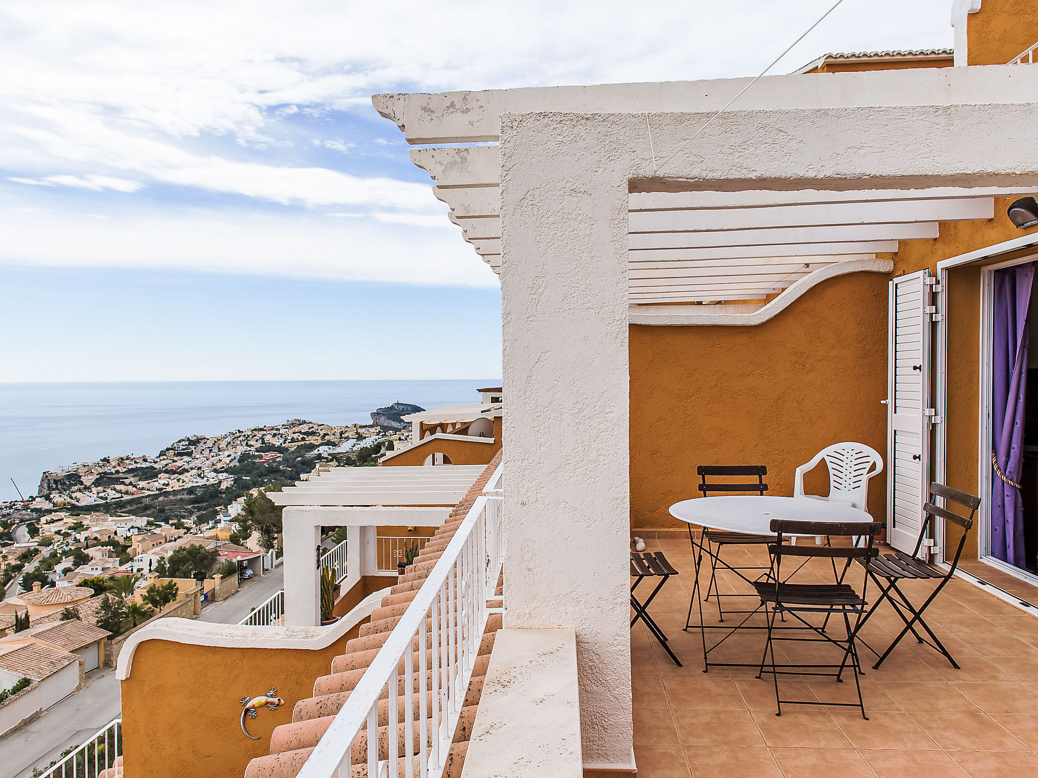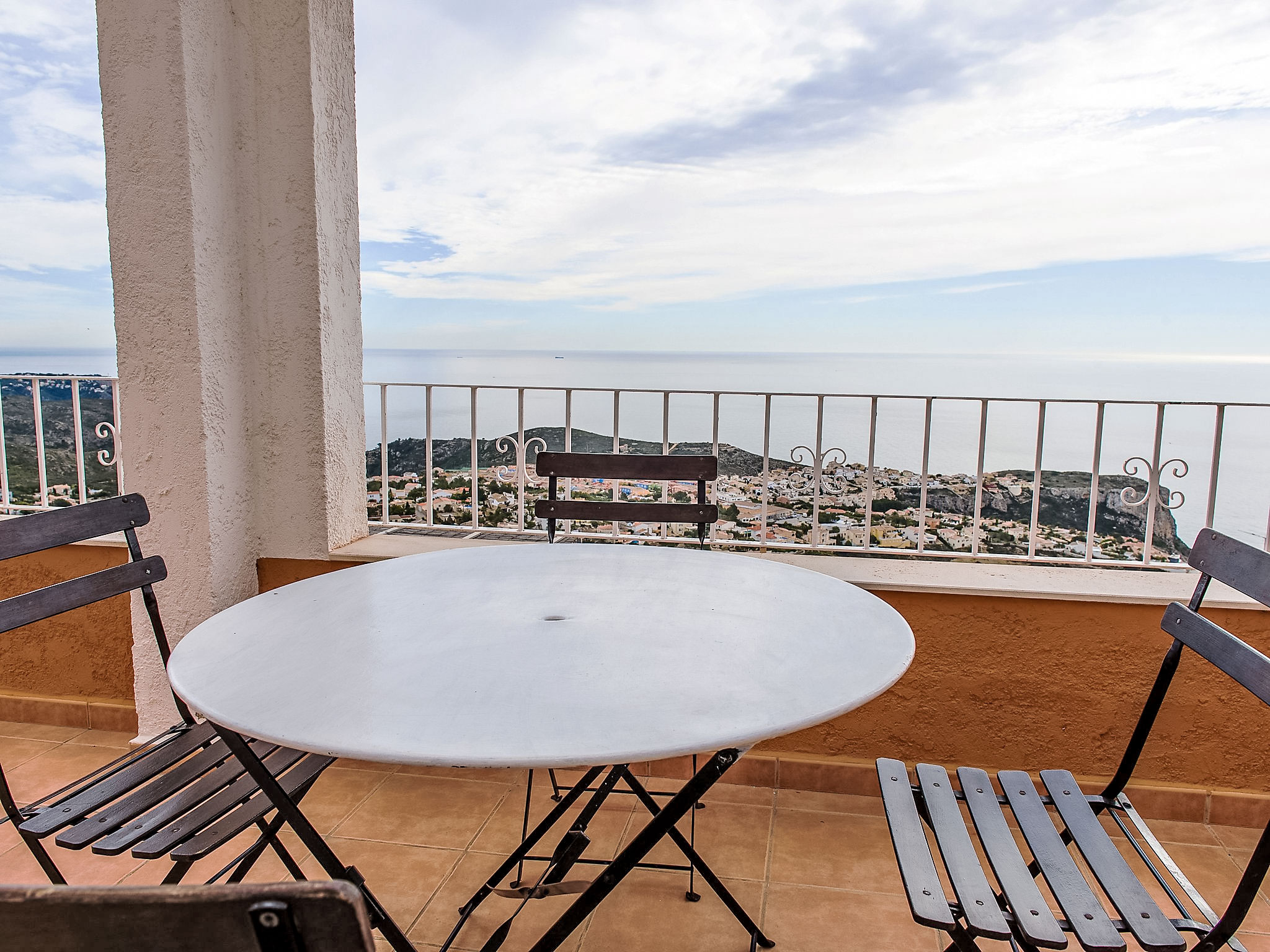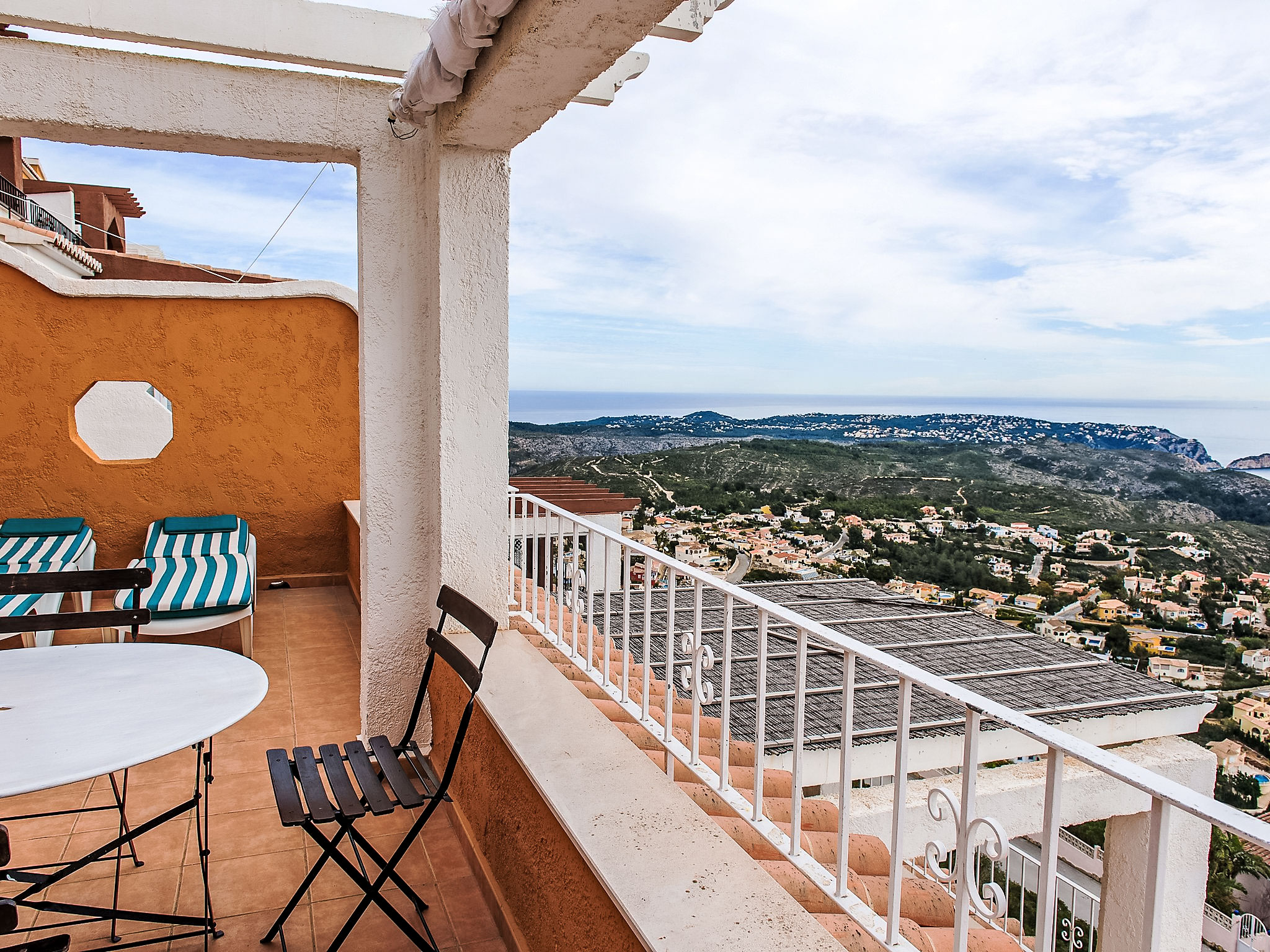 Benitachell: Feriensiedlung "Vista Mar", Baujahr 2008. Im Ortsteil Cumbre del Sol, ruhige, sonnige, erhöhte Lage, 3 km vom Meer. Zur Mitbenutzung: 2 Schwimmbäder (saisonale Verfügbarkeit: 01.Mar.-30.Nov.) mit Innentreppe. Kinderbecken, Aussendusche, öffentliche Parkplätze auf der Strasse. Supermarkt 1 km, Einkaufszentrum 2 km, Restaurant 2 km, Sandstrand "Arenal" 7 km, Badebucht 3 km. Bitte beachten: Fahrzeug empfohlen, kein Fahrstuhl vorhanden.