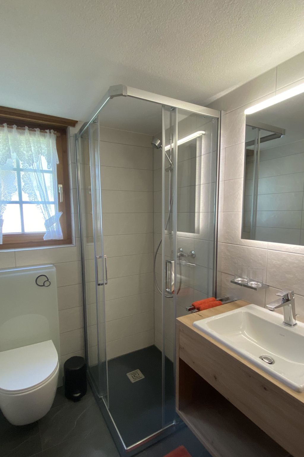 Die Wohnung im Parterre ist eingerichtet mit einer modernen Küche, einem grossen Wohnzimmer, 2 Doppelzimmer (in einem Zimmer ist ein Waschbecken) und Dusche/WC. Auf der Südseite befindet sich eine Sitzgelegenheit und auf der Westseite hat es einen Balkon. Auf Wunsch wird ein Zusatzbett im Wohnraum installiert. Die Wohnung ist mit einer Geschirrspülmaschine, Kaffeemaschine, Wasserkocher,Mikrowelle, Racletteofen, Fondueset, Sat-TV, Radio und gratis W-Lan ausgestattet.