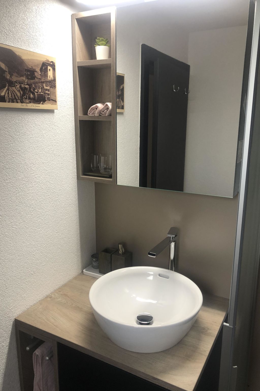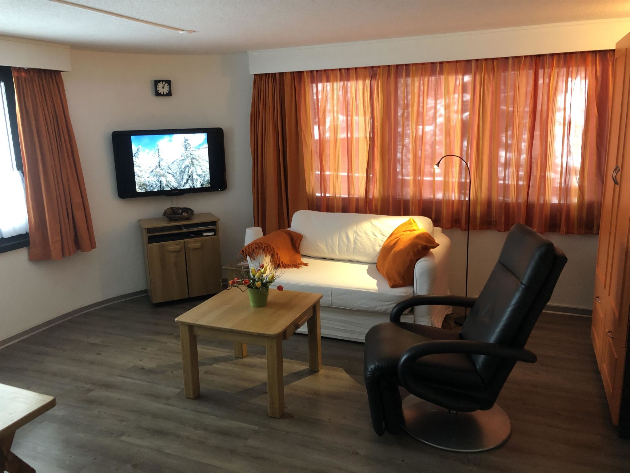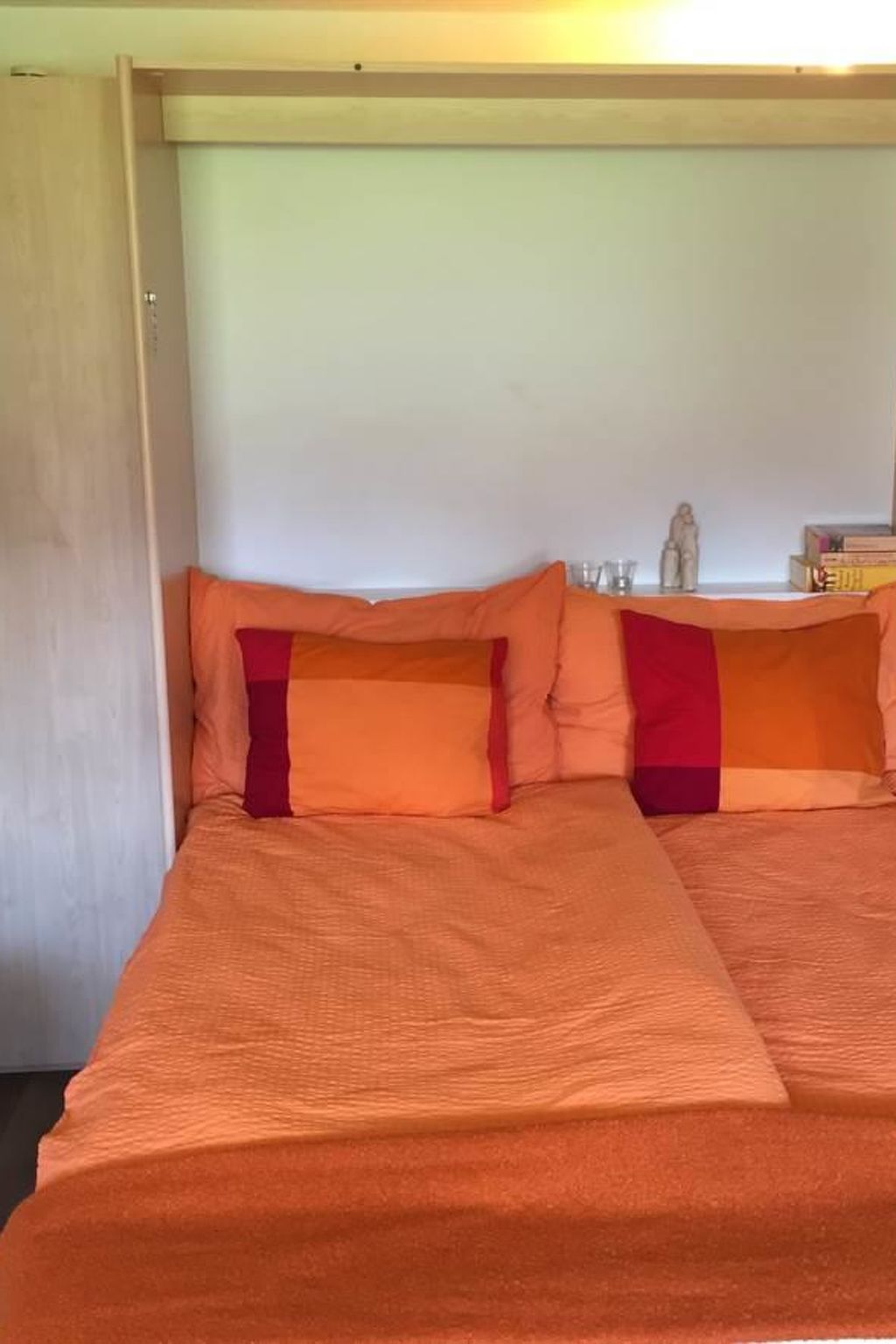 Die Einzimmerwohnung/Studio im Erdgeschoss, mit Südterrasse verfügt über eine komfortable Wohnküche, 1 Wandklappbett für 2 Personen, 1 Sitzecke mit Schlafsofa, SAT-TV, Haarföhn, Dusche/WC. Nichtraucherhaus. Parkplatz in der Nähe vom Haus.