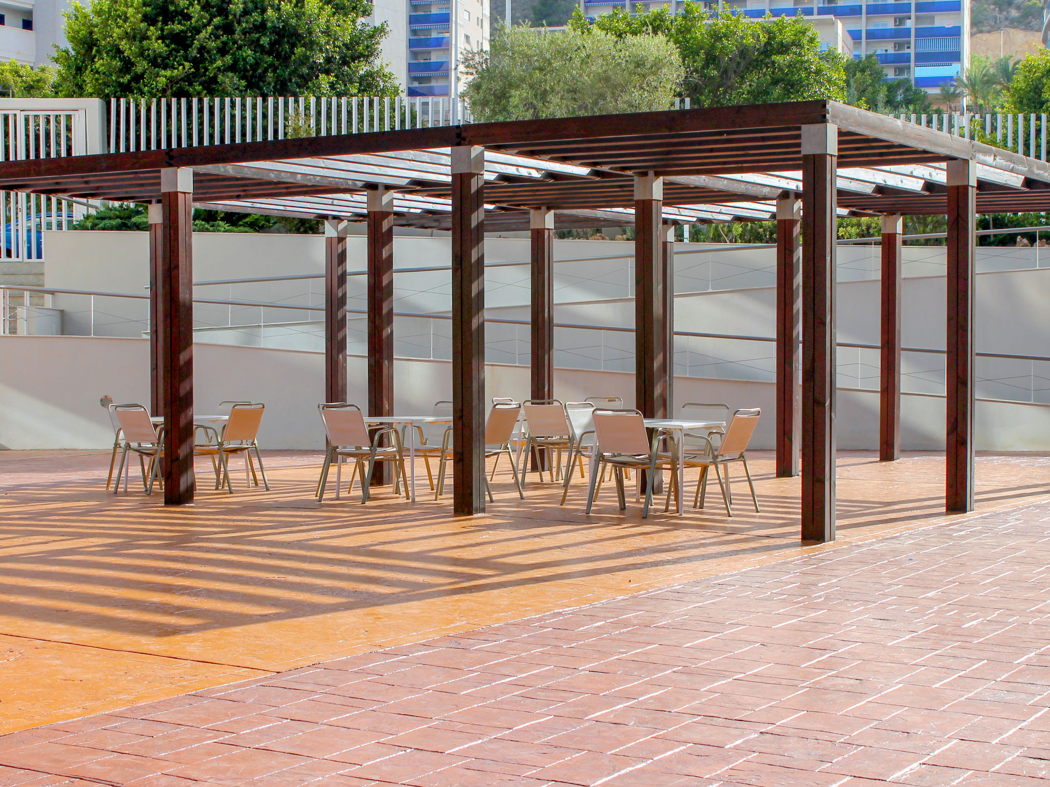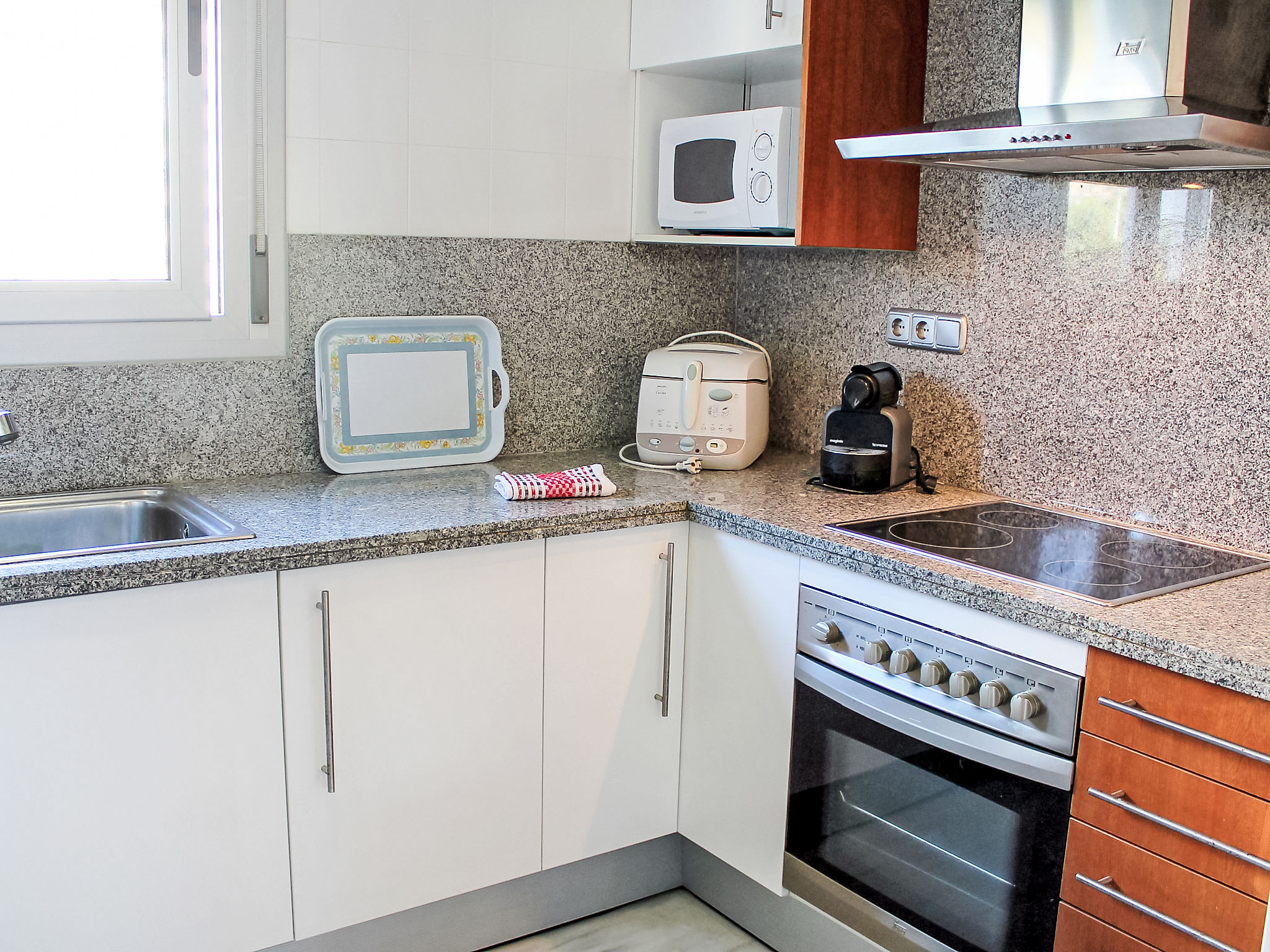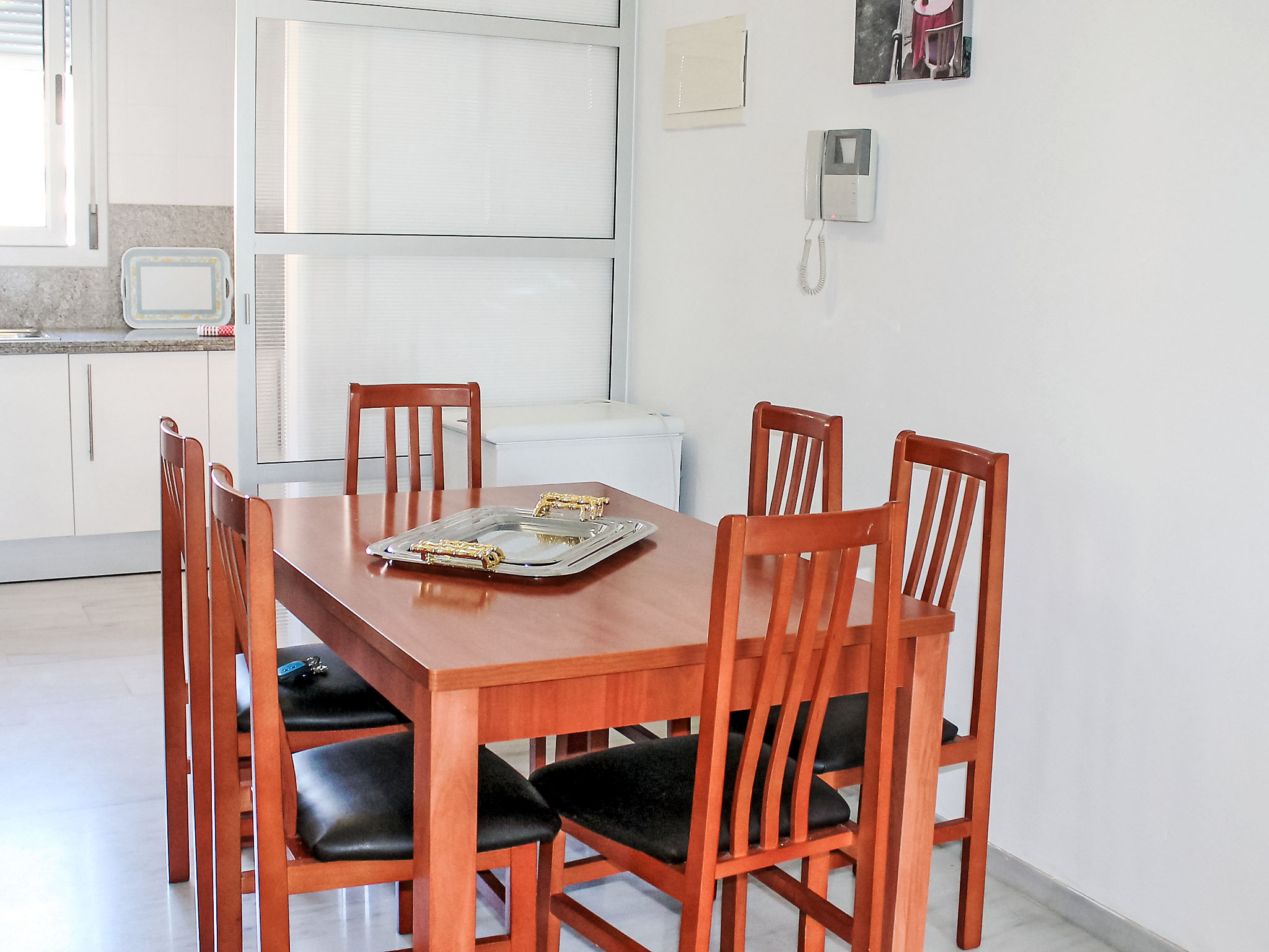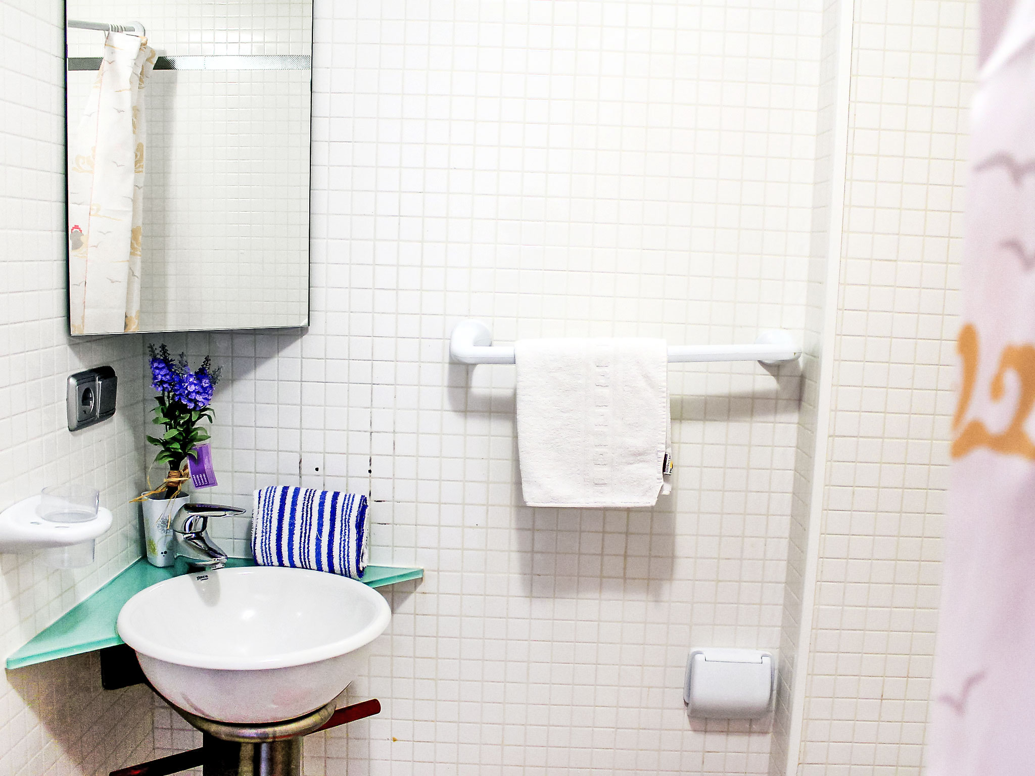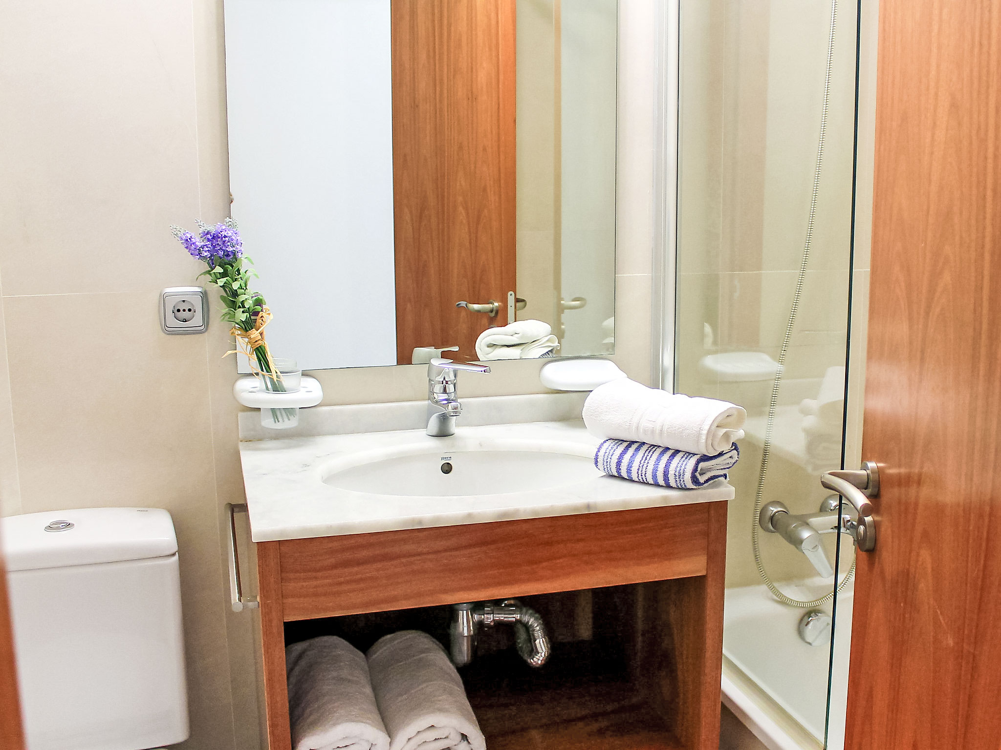 "Elegance", 3-Zimmer-Wohnung 60 m2 im 2. Stock. Hell, zweckmässig und komfortabel eingerichtet: Wohn-/Esszimmer mit Digital-TV und Klimaanlage. Ausgang zur Terrasse. 1 Zimmer mit 2 Betten. 1 Zimmer mit 1 franz. Bett und Bad/Bidet/WC. Ausgang zur Terrasse. Küche (Backofen, Geschirrspüler, 4 Glaskeramikherd Platten, Toaster, Wasserkocher, Mikrowelle). Dusche/WC. Terrasse. Terrassenmöbel. Sicht auf das Schwimmbad und die Ortschaft. Zur Verfügung: Waschmaschine, Bügeleisen, Haartrockner. Parkplatz Nr. 7. AT441758A