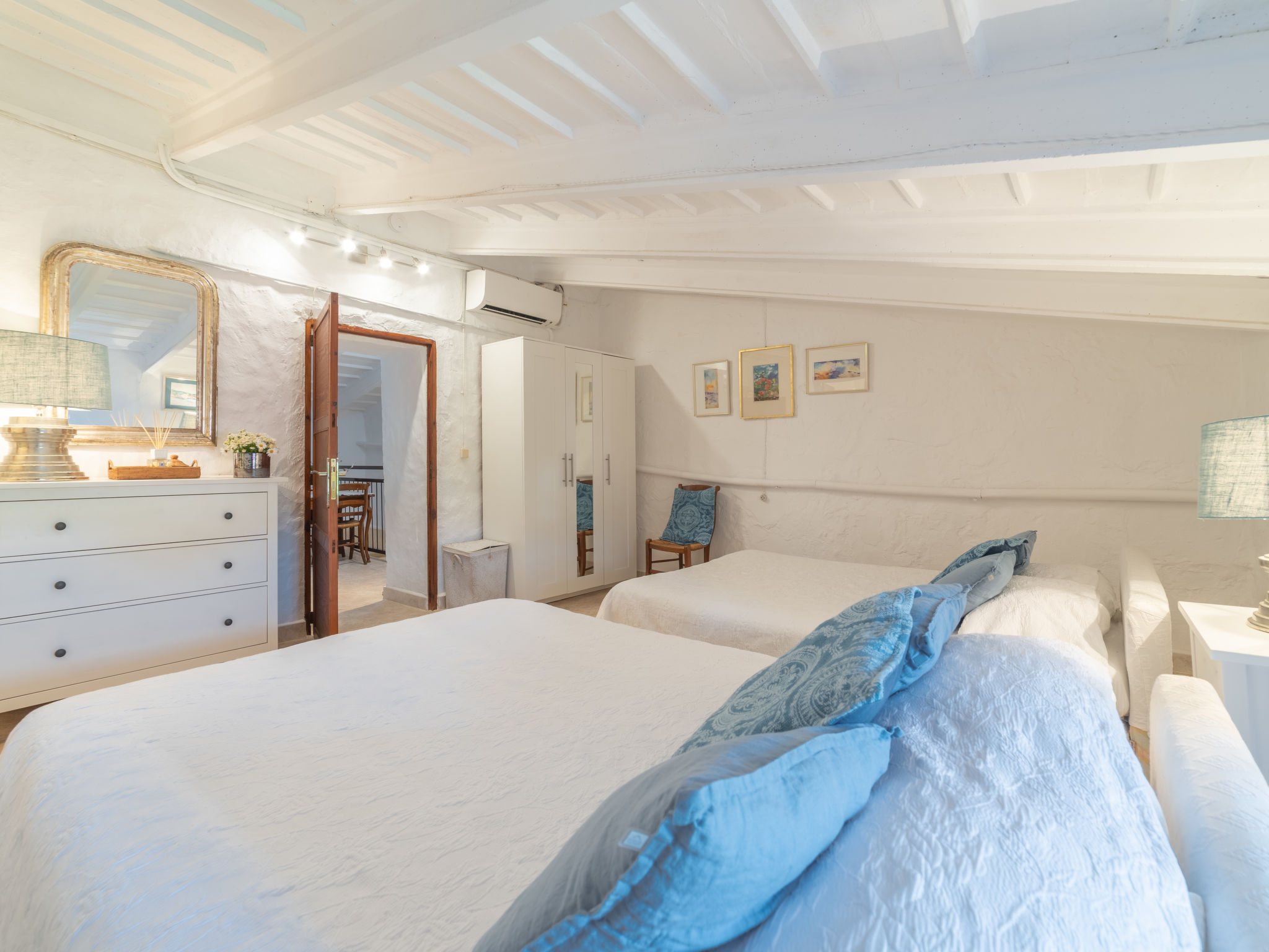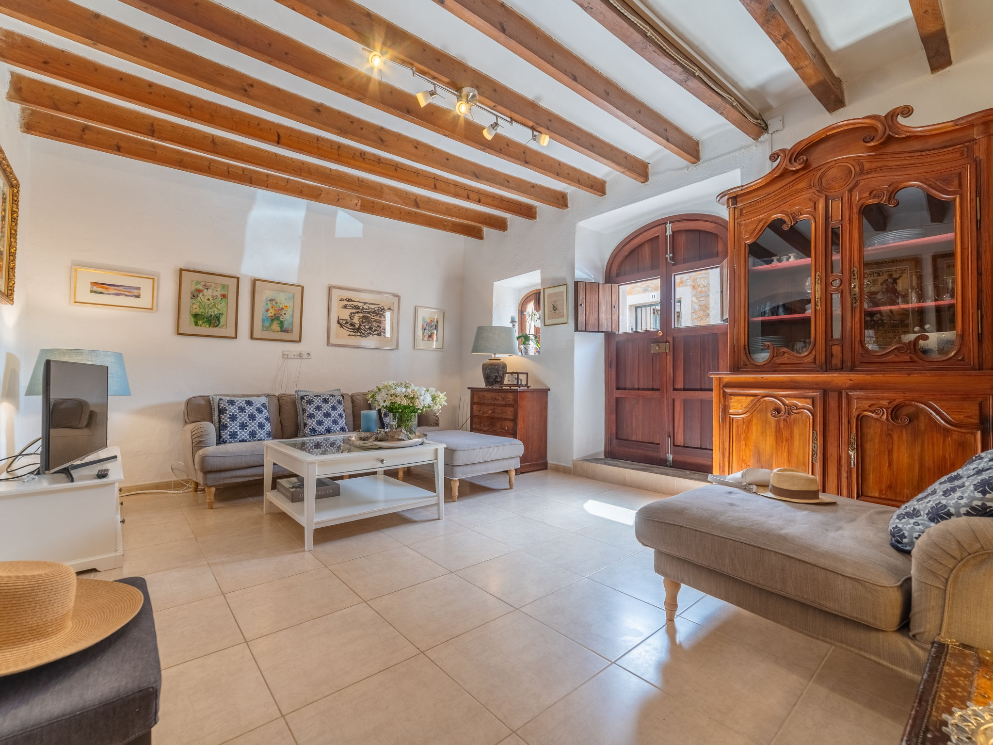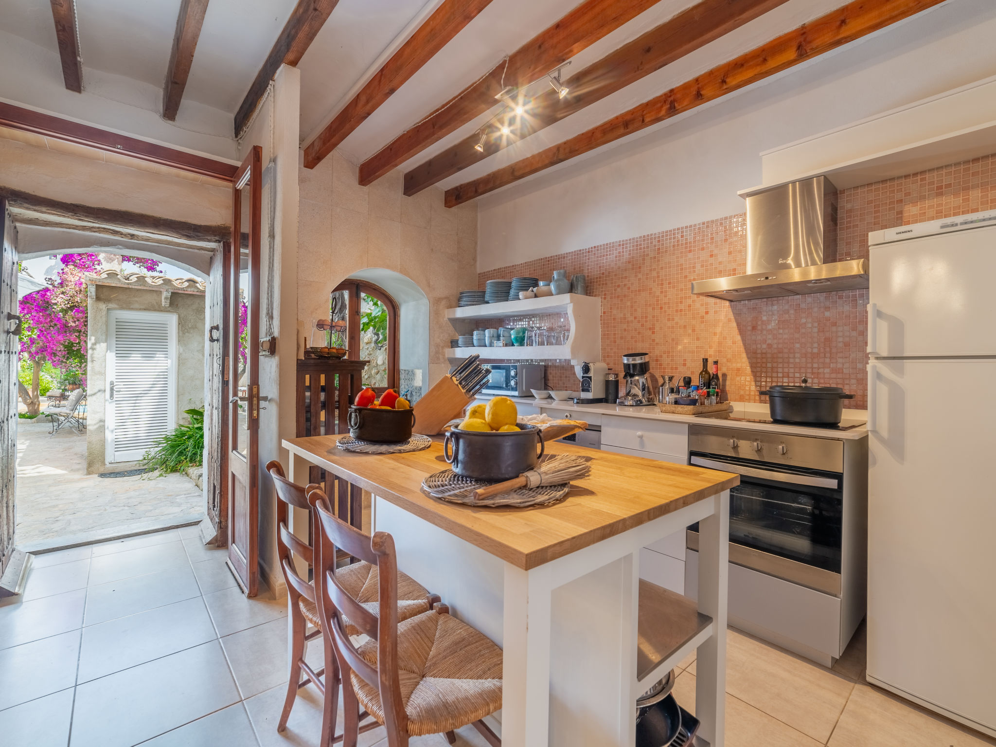 "Sa Teulera", 3-Zimmer-Reihenhaus 150 m2 auf 2 Stockwerken. Objekt geeignet für 6 Erwachsene. Teilweise abgeschrägt, vollständig renoviert, schön und geschmackvoll eingerichtet: Wohnzimmer mit TV und Internationale TV-Sender. Esszimmer mit Esstisch und Klimaanlage. Ausgang zum Gartensitzplatz, zum Schwimmbad. Küche (Backofen, Geschirrspüler, 3 Glaskeramikherd Platten, Mikrowelle, Tiefkühler, elektrische Kaffeemaschine, Kochinsel) mit Esstisch. Ausgang zum Gartensitzplatz, zum Schwimmbad. Obergeschoss: 1 Doppelzimmer mit 1 franz. Bett, TV, Klimaanlage und Warmluftheizung. 1 Doppelzimmer mit 2 franz. Betten, Klimaanlage und Warmluftheizung. Bad/Dusche. Natursteinböden. Komfortable Einrichtung im Landhausstil. Grosser Gartensitzplatz. Terrassenmöbel, Gartengrill, Liegestühle, Sitzplatz. Eingeschränkte auf das Schwimmbad, den Garten, die Landschaft und die Ortschaft. Zur Verfügung: Waschmaschine, Bügeleisen, Kinderhochstuhl, Babybett bis 2 Jahre. Internet (Wireless LAN, gratis). Beim Haus. Geeignet für Familien. ETV12662